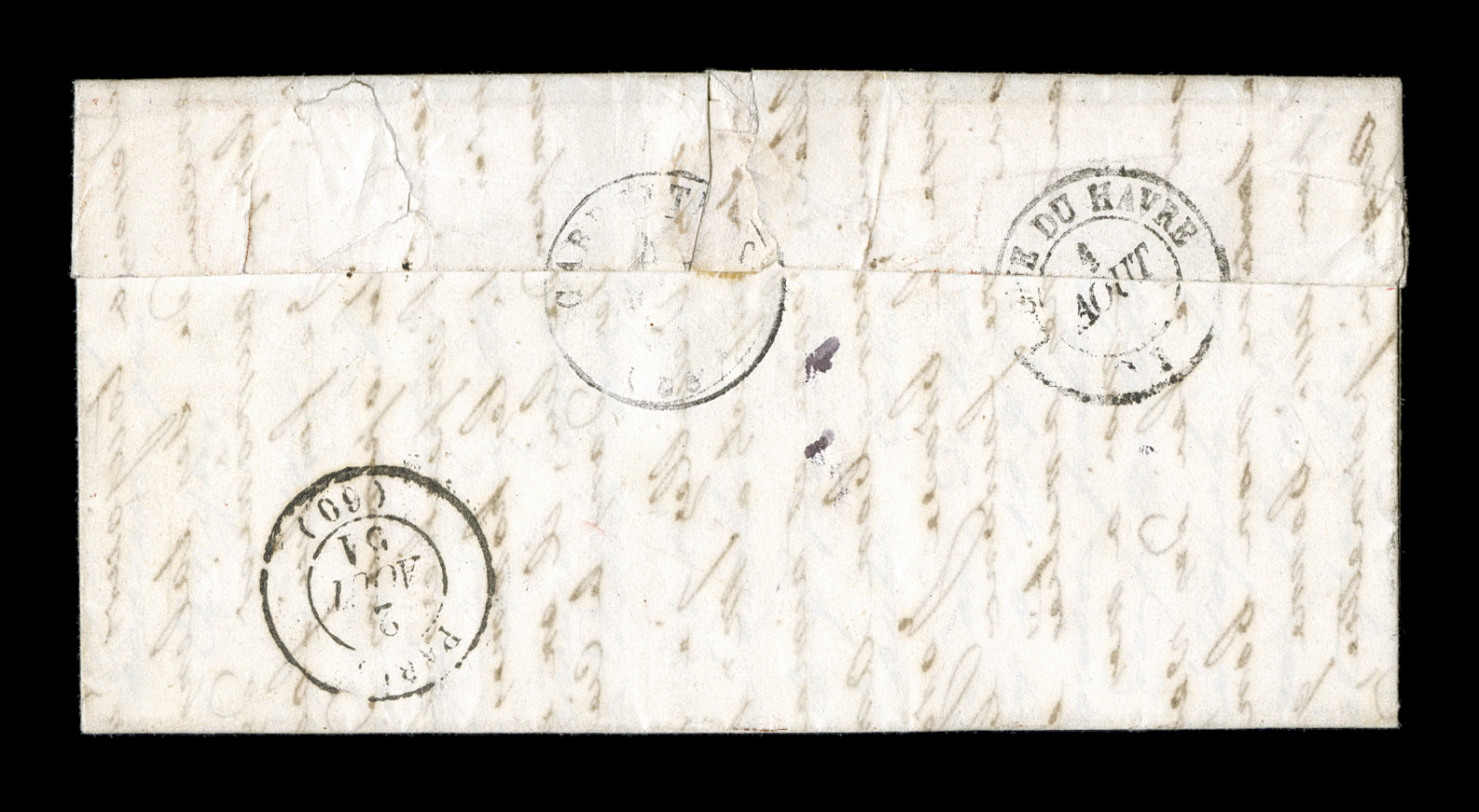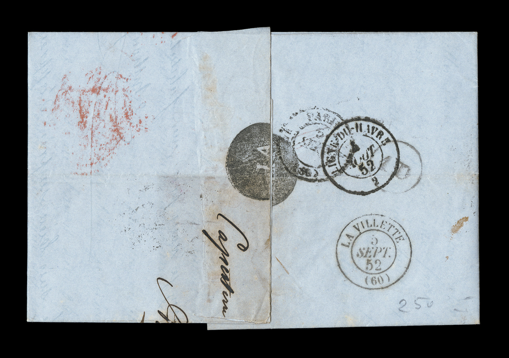 letter to Paris, bold double-line 35 rate handstamp for 25c postage1852 Capesterre unpaid stampless entire letter to France carried by French merchant ship, clear black "Capesterre/Guadeloupe/23 Juil 1852" double-circle c.d.s. on entire folded letter to Paris, bold double-line "35" rate handstamp for 25c postage and 10c ship fee, red Le Havre entry transit c.d.s., backstamped, very fine and attractive; letters sent by private ship were considerably less costly but much less reliable and slower; a very rare marking from the small town of Capesterre on the east coast of Basse Terre; rated scarcity 5 by Jamet with only a few examples known; 2005 A. Roumet certificate. (imagea) (Image) Est. $500-750