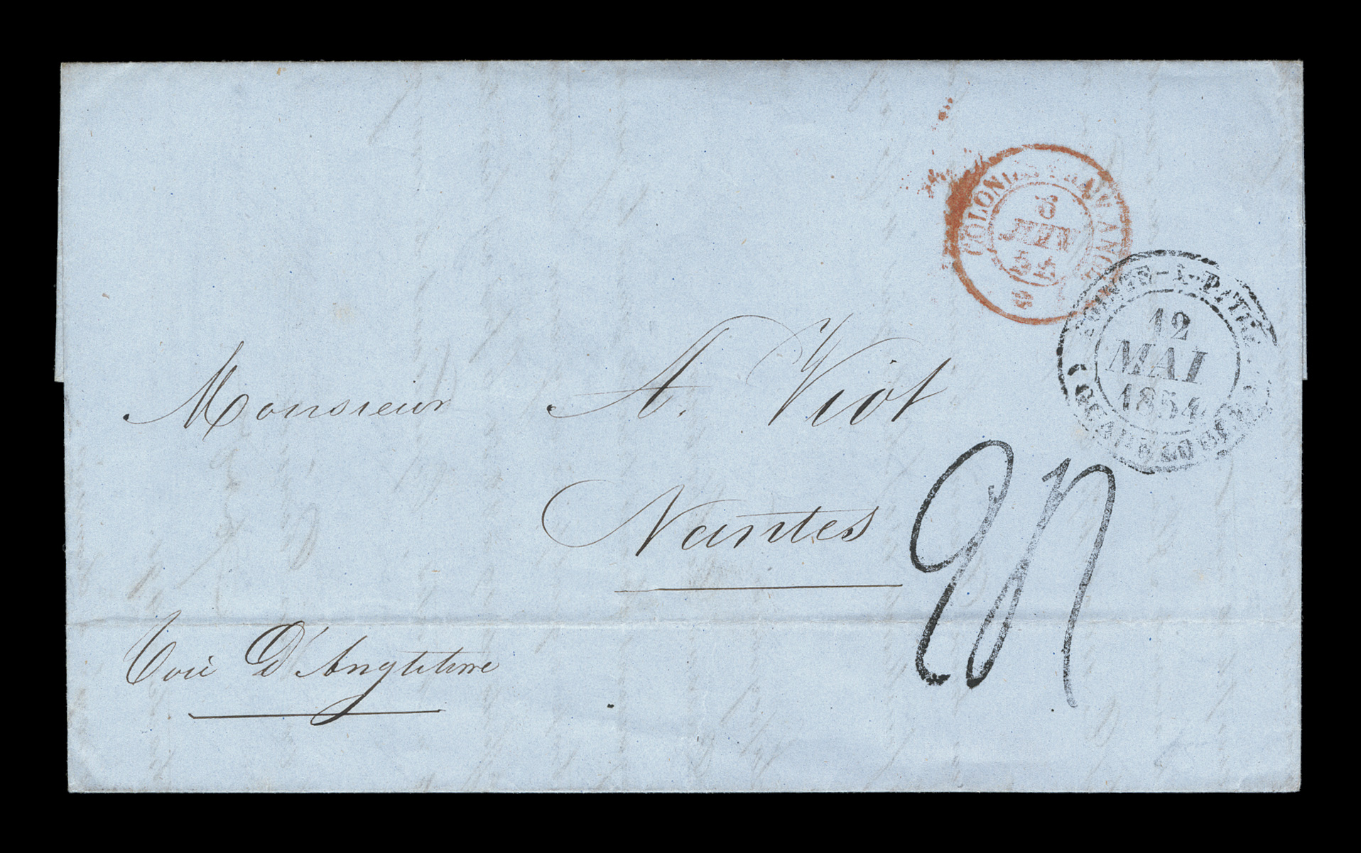 than going through the Guadeloupe post office, red double-line 1852 Pointe-a-Pitre unpaid stampless entire letter to France, this letter is datelined "Pointe a Pitre/27 Juilles 1853" and was evidently given directly to the ship's captain rather than going through the Guadeloupe post office, red double-line "35" rate handstamp for 25c postage and 10c ship fee, and possessing matching rare "Colonies Fra/Pauillac/3 Oct. 53" red entry transit c.d.s., backstamped Bordeaux, very fine and attractive; letters posted by private ship were subject to the variables of time and routing that the ship happened to take; this letter was brought into the small village and little used port of Pauillac, rare. (imagea) (Image) Est. $500-750