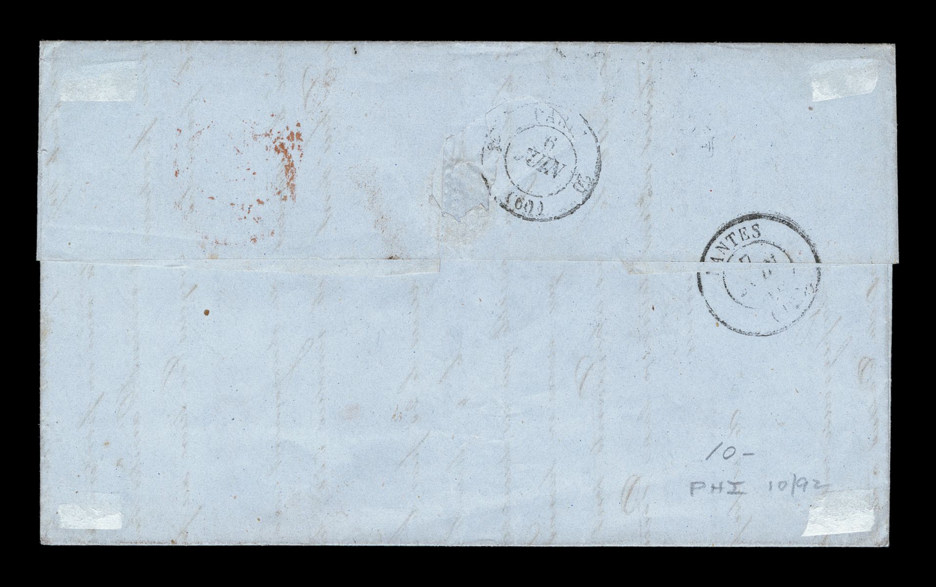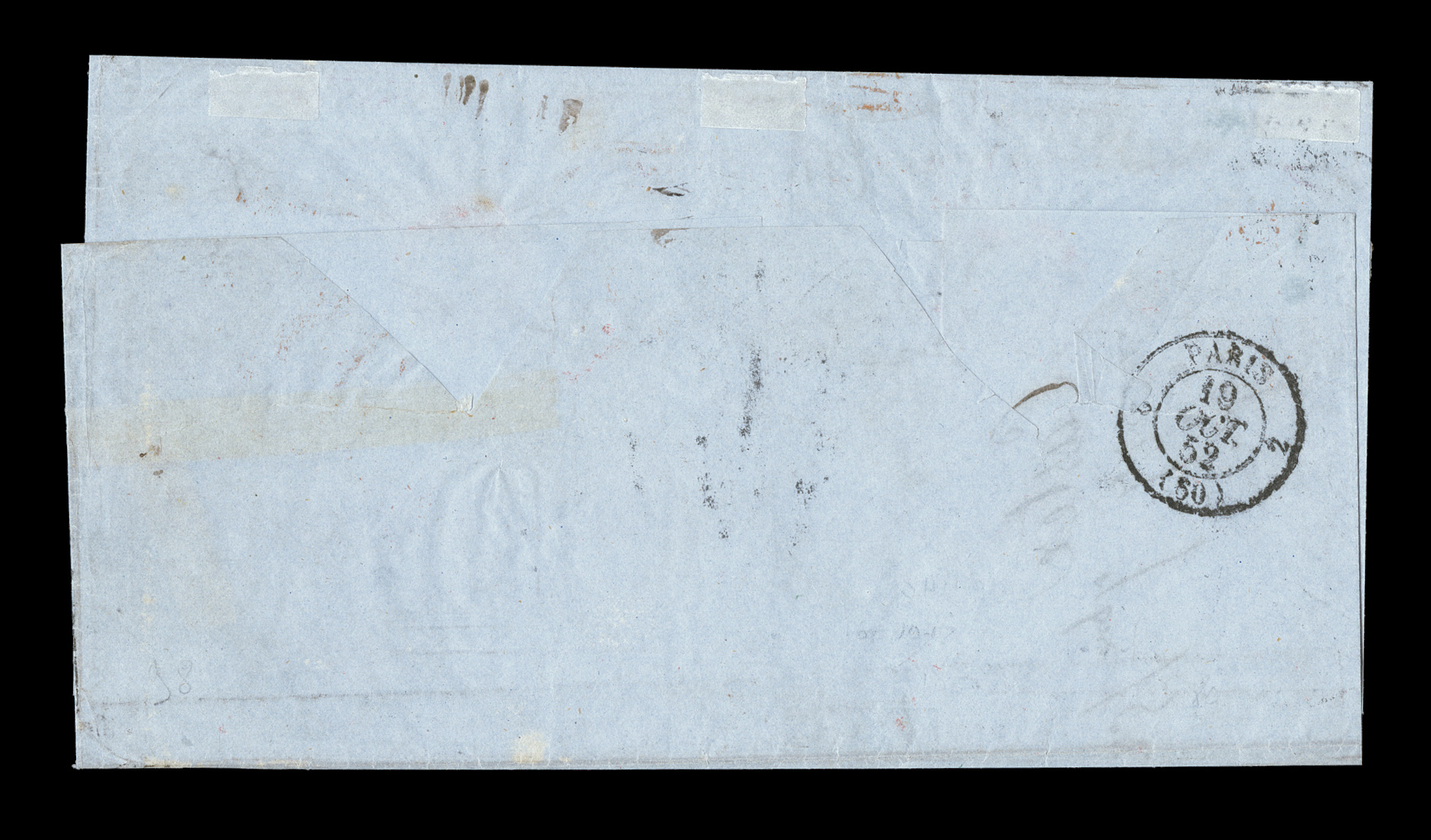 strip, both tied on arrival to incredibly rare triple-rate 1852 foldedFrance Yvert #4, 6, 1849 1Fr Carmine vertical strip of four along with 25c Blue horizontal pair, both possessing mostly large margins, just into the frame at the bottom of the strip, both tied on arrival to incredibly rare triple-rate 1852 folded cover to France by French roller grill cancel (application of the cancel caused slight edge wrinkles to cover barely affecting the stamps), clear "Pointe-a-Pitre/Guadeloupe/10 Nov. 1852" double-circle c.d.s., marked "Steamer" and carried per British packet with red Calais entry transit and boxed "PD" handstamp, backstamped Paris, very fine. The substantial rate of 1Fr50c per 7.5 grams made it rather expensive to send even a double rate cover. This remarkable triple-rate cover is one of only two or three recorded. The amount of postage required results in an incredibly rare franking and a strip of four of the 1Fr is very rare even on a French cover, not to mention that it is immensely more so on a cover from Guadeloupe. Yet even beyond its rarity is the exceptional beauty of this impressive cover making this a wonderful showpiece of Guadeloupe philately. (imagea) (Image) Est. $10,000-15,000