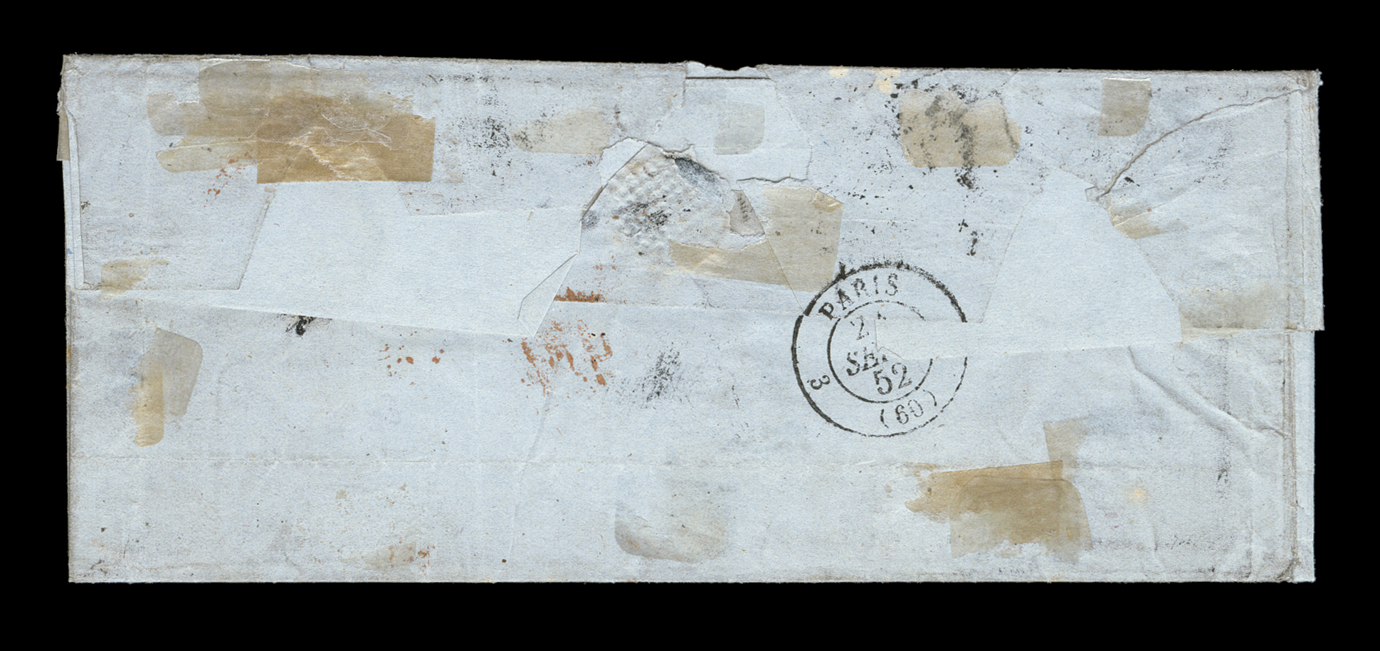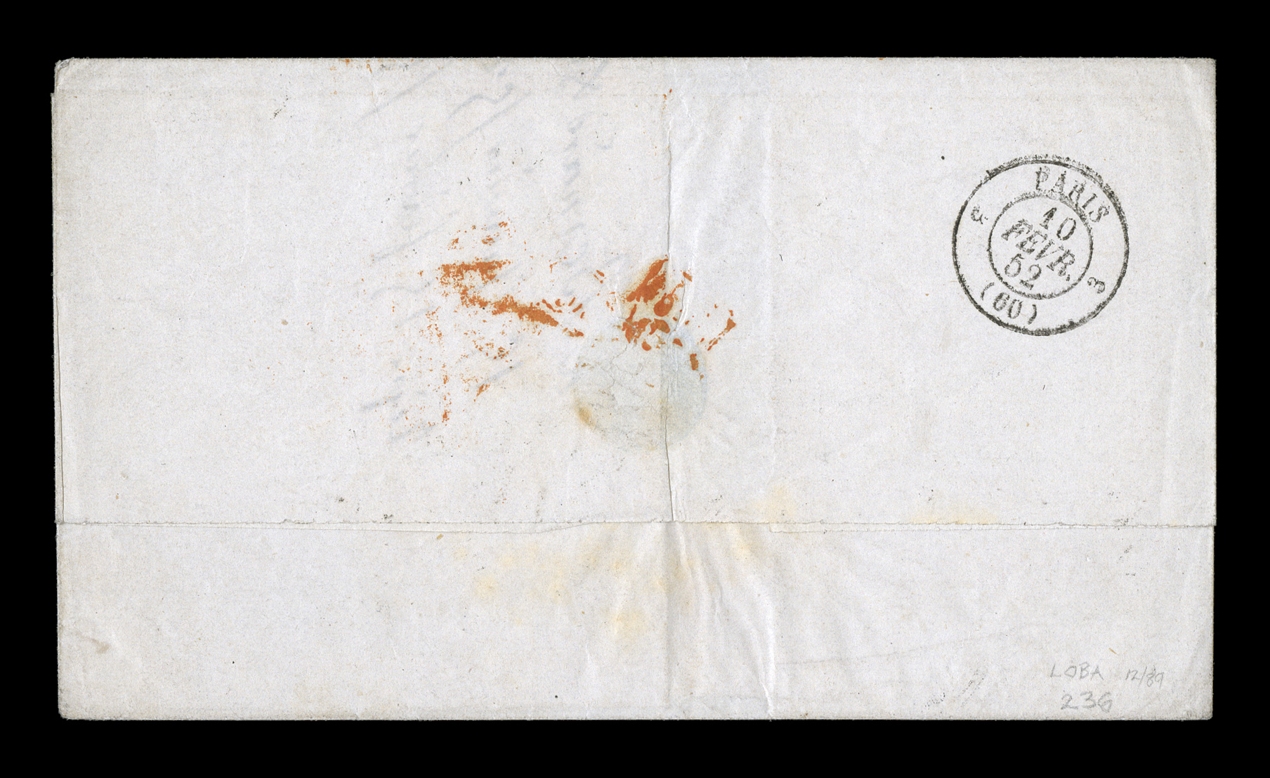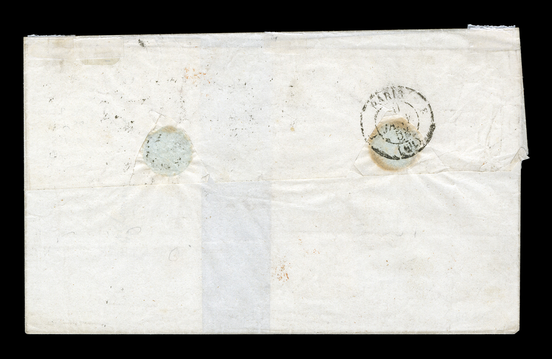 1852 folded cover to France, stamps tied on arrival in Paris by FreFrance Yvert #4, 6, 1849 25c Blue horizontal pair and 1Fr Carmine, attractive franking with rich colors, large margins to just in on one side of each, tied to exceptionally clean 1852 folded cover to France, stamps tied on arrival in Paris by French roller grill cancel, light but clearly discernible black "Grand-Bourg (Mie. Gte.)/Guadeloupe/27 Dec. 1852" double-circle c.d.s. above and similar Basse-Terre transit of December 31st at right, posted per British packet with red Calais entry transit and boxed "PD" handstamp, backstamped Paris, very fine and pretty cover; the small village of Grand Bourg is on the small island of Marie Galante located to the southeast of the two major islands of Guadeloupe, this sparsely populated island saw very little commerce in this period; this is the only recorded use of French stamps from Grand Bourg; 2002 A. Roumet certificate. (imagea) (Image) Est. $5,000-7,500