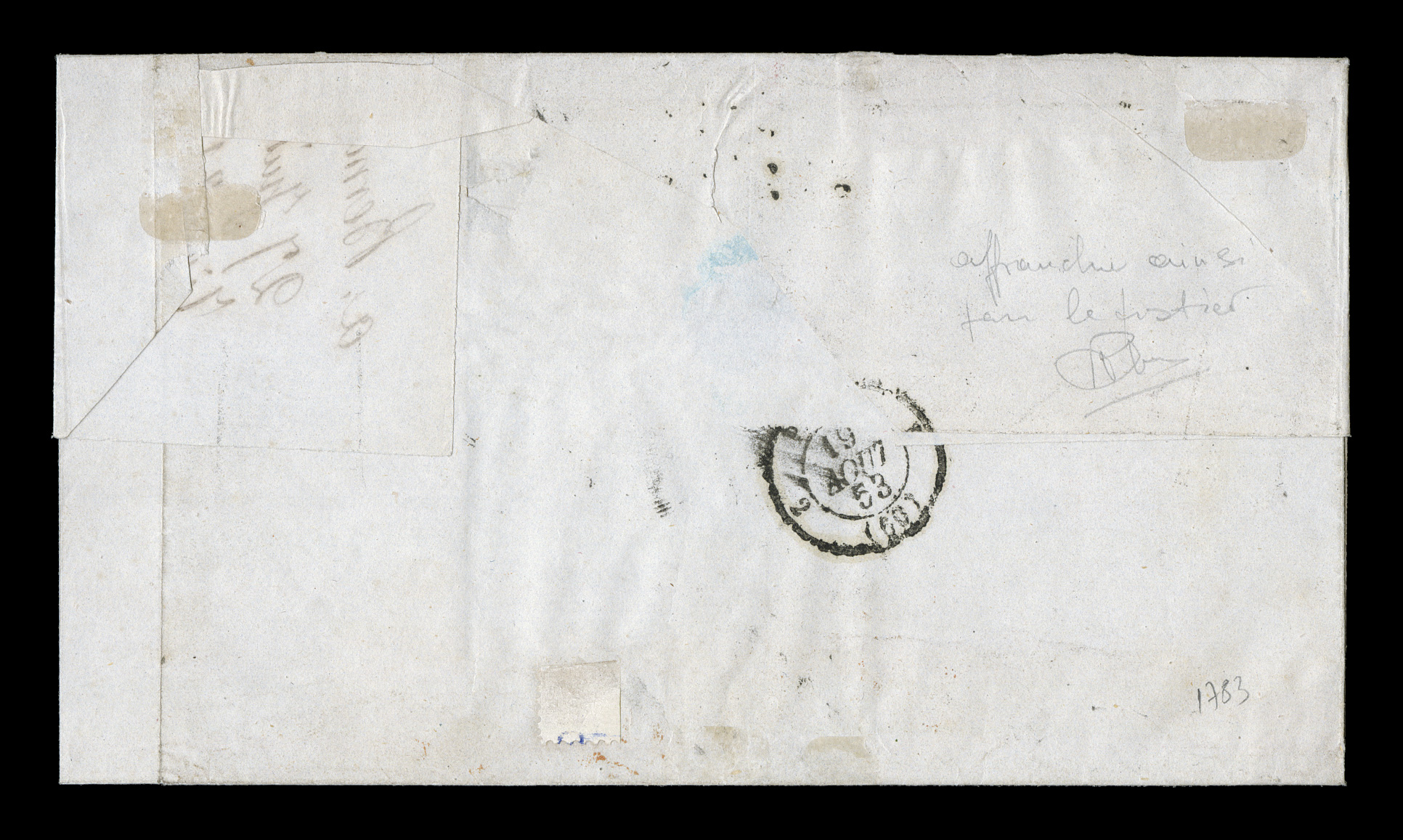 15 c 1853 Grand Bourg unpaid stampless entire letter to France, light but discernible strike of black Grand-Bourg (Mie. Gte.)Guadeloupe25 Juil 1853 double-circle c.d.s. and similarly