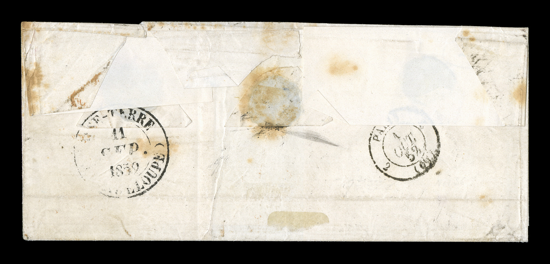 Pointe-a-PitreGuadeloupe10 Sep. 1852 double-circle c.d.s. that justFrance Yvert #6, 1849 1Fr Carmine, single and horizontal pair tied to double-rate 1852 folded cover to France by both the French roller grill cancel on arrival and the black "Pointe-a-Pitre/Guadeloupe/10 Sep. 1852" double-circle c.d.s. that just catches the edge of the pair (occurs only rarely by chance), stamps have rich color and clear to large margins, small tone spot on the single, on the reverse is a double-circle c.d.s. transit of Basse-Terre the next day, a feature which occurs on only a small fraction of the covers, per British packet with red Calais entry transit and boxed "PD" handstamp, backstamped Paris, very fine; a rare double rate cover resulting in a scarce high value franking; signed C. Jamet. (imagea) (Image) Est. $4,000-5,000