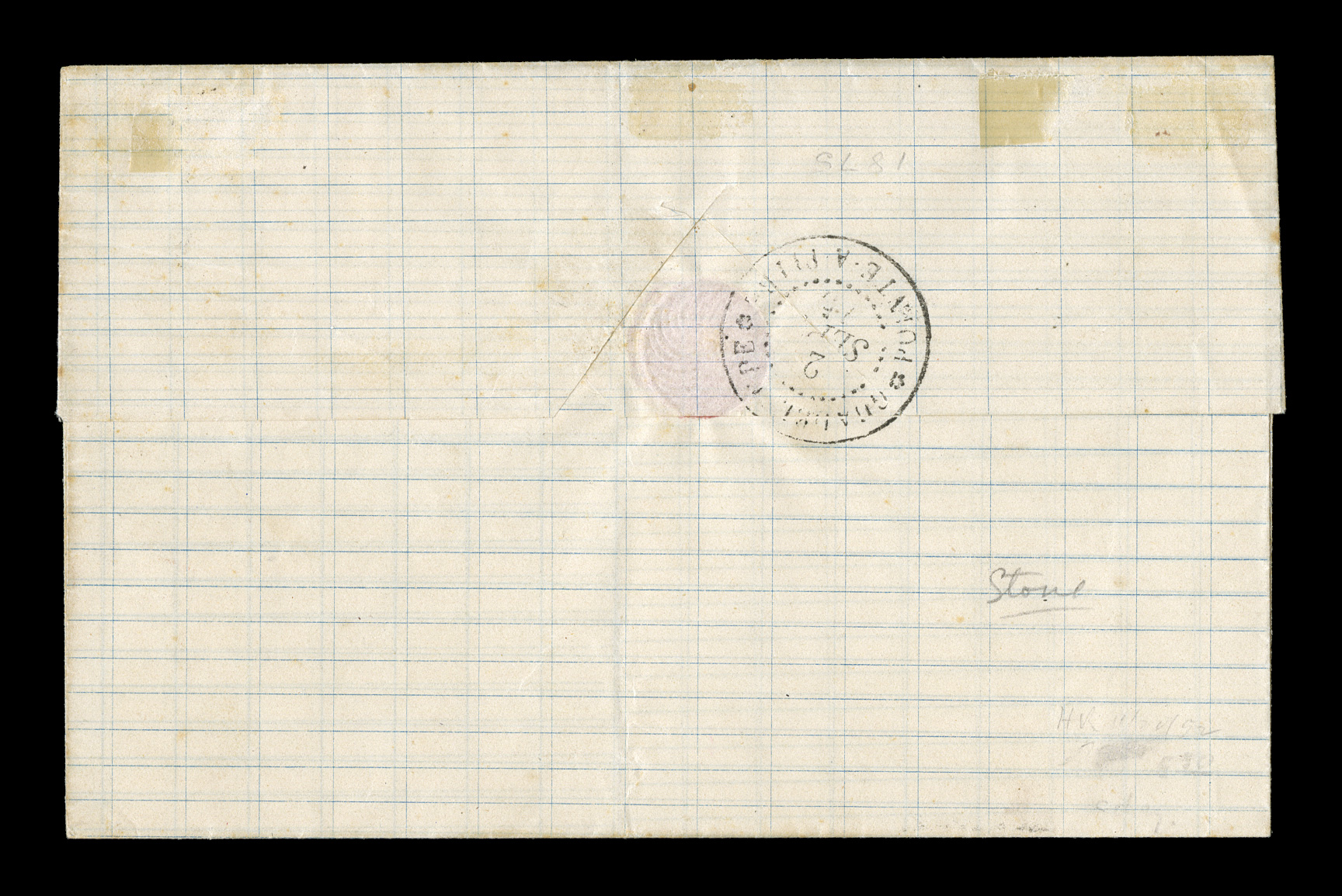 folded cover by well stuck black lozenge cancel, matching GuadeloupeFrench Colonies Yvert #17, 22, 1872 5c Green on blue and 15c Bister, singles of each with full even margins paying the 20c internal rate, tied to each other on very fresh 1875 folded cover by well stuck black lozenge cancel, matching "Guadeloupe/Basse-Terre/1 Sept. 75" double-circle c.d.s., large red "P.P" handstamp, plus complemented by blue business cachet, choice very fine and attractive internal cover. (imagea) (Image) Est. $200-300