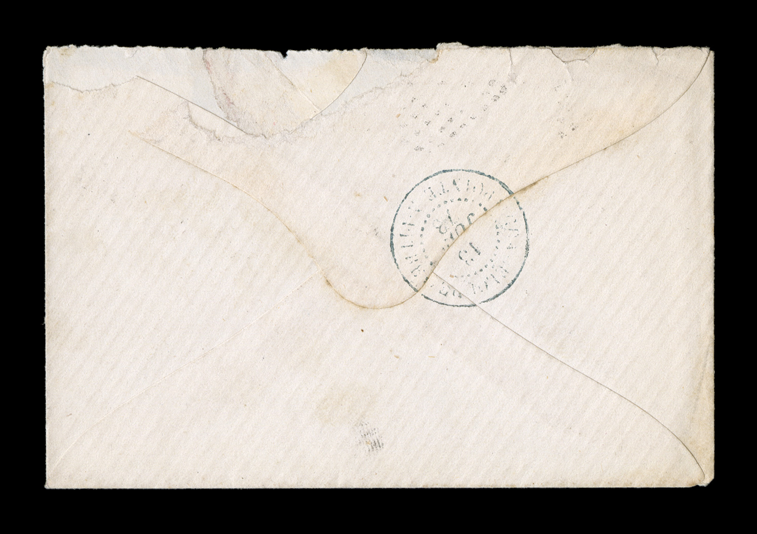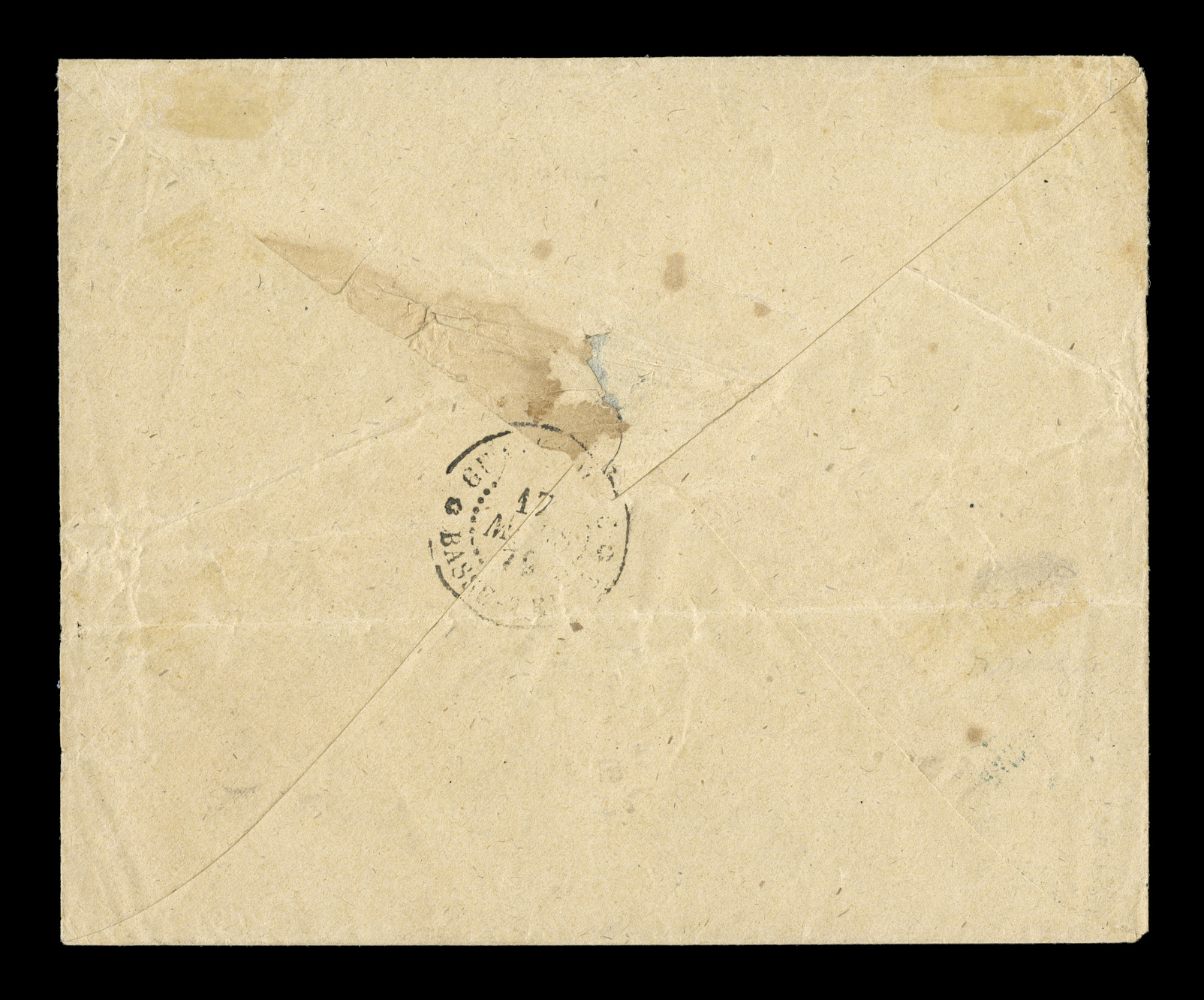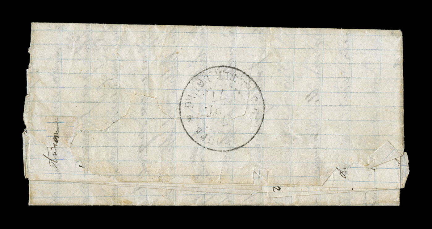 Freres watermark in all four stamps, large to extra-large margins allFrench Colonies Yvert #17a, 1872 5c green on blue horizontal strip of four, watermarked, an amazing strip of four showing a portion of the paper maker's double line "La Croix Freres" watermark in all four stamps, large to extra-large margins all around with a portion of the sheet margin at right, tied to 1879 cover to Basse Terre by six strikes of "Guadeloupe/Pointe-a-Pitre/16 Mars 79" double-circle c.d.s., backstamped, horizontal fold and minor wrinkles to cover not affecting the stamps, very fine; an incredibly rare cover and franking; the watermarked variety only turns up infrequently on loose stamps, on cover it is a major rarity, this being one of only a very few colonial covers recorded. (imagea) (Image) Est. $1,000-1,500