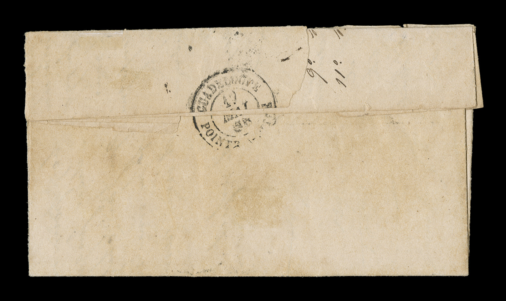 1865 entire folded judicial notice to Pointe-a-Pitre by black lozenFrench Colonies Yvert #3, 1859 10c Yellow bister, three large margins, just touching at right, paper with overall browning from the gum, an extremely rare single franking tied to 1865 entire folded judicial notice to Pointe-a-Pitre by black lozenge cancel, matching "Basse-Terre/Guadeloupe/29 Mars 1865" large rimless c.d.s. below, large red "P.P" boxed handstamp, light judicial cachet applied to front and back, very fine cover; a special rate of 10c existed for official correspondence sent in Guadeloupe by the courts, very few of these have been preserved and the example offered here shows an extremely rare proper single franking of the 10c Eagle issue; ex-Levett. (imagea) (Image) Est. $750-1,000