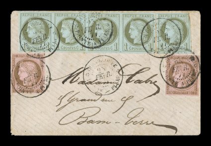 one corner, all the rest with full large even margins, an amazing frFrench Colonies Yvert #14, 18, 1872-76 1c Olive green on pale blue, horizontal strip of four and single along with two 10c Brown on rose singles, the 1c single into the frame in one corner, all the rest with full large even margins, an amazing franking paying a very rare 25c internal rate on 1877 cover to Basse Terre, stamps are tied by five strikes of black "Guadeloupe/Pointe-a-Pitre/25 Fevr. 77" double-circle c.d.s., backstamped Basse Terre the next day, very fine and exceedingly choice; the normal rate for internal mail was 20c but a special rate of 25c existed for a service by sailing ship between the major islands connecting Pointe-a-Pitre, Basse Terre and Grand Bourg on Marie Galante, no special markings exist for this service and it is only recognizable by the rate and the dates of the postmarks; covers exhibiting this rate are extremely rare and the cover offered here is the most spectacular example with this colorful and rare franking. (imagea) (Image) Est. $1,500-2,000
