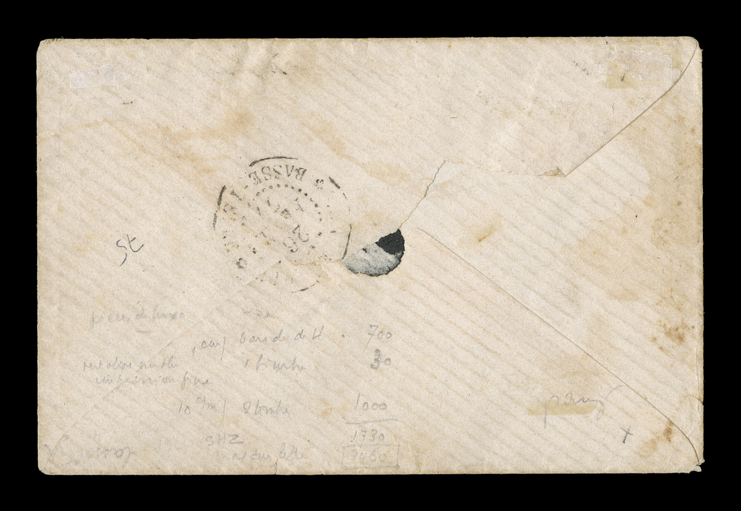 mourning cover posted locally in Basse Terre by Basse-TerreGuadYvert #12, Scott #12, 1891 30c Brown with provisional "Guadeloupe" overprint, imperforate, single of this exceptionally rare provisional issue, four clear to large margins, tied to mourning cover posted locally in Basse Terre by "Basse-Terre/Guadeloupe/27 Dec 94" c.d.s., repaired tear below the overprint that is hardly apparent, very fine appearance; it is hard to speculate exactly why this tiny cover is franked as it is, in January 1885 the internal rate was changed from 20c for 10 grams to 15c for 15 grams, this later rate applied to locally posted covers as well as elsewhere in the country, so this is correctly franked for a double rate local cover but it is hard to see how this small cover could be double weight, perhaps this is the only stamp the sender had at hand, nevertheless this is the only recorded example of this rare stamp on cover. ex-Stone. (imagea) (Image) Est. $500-750