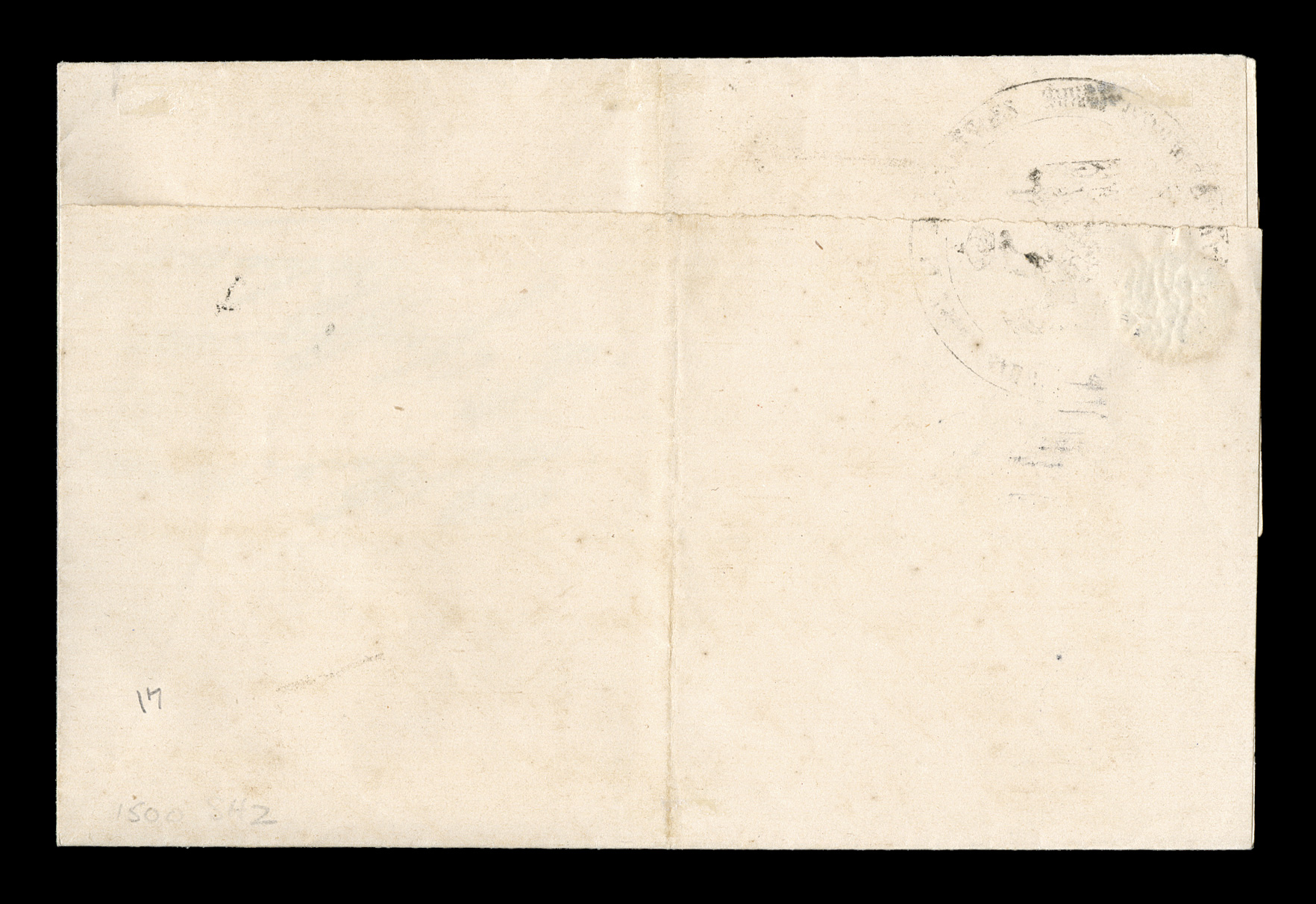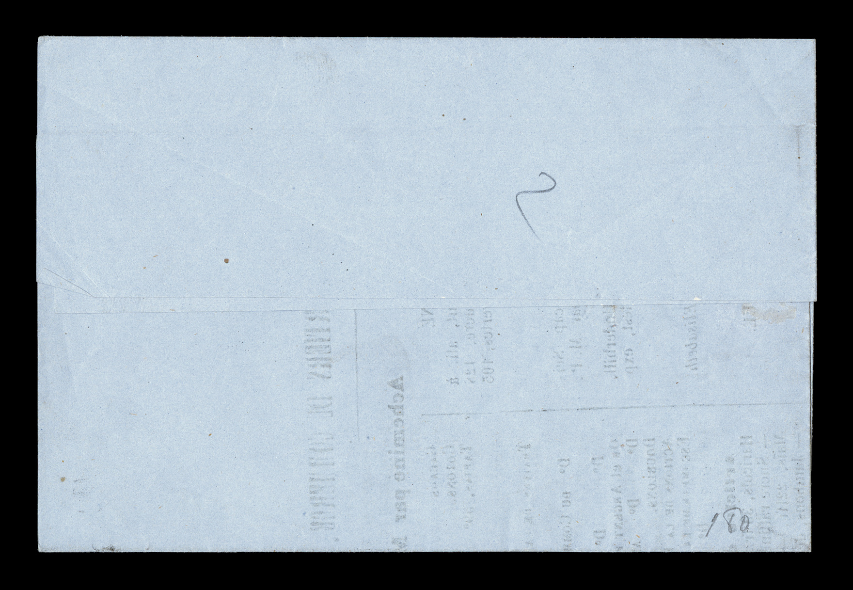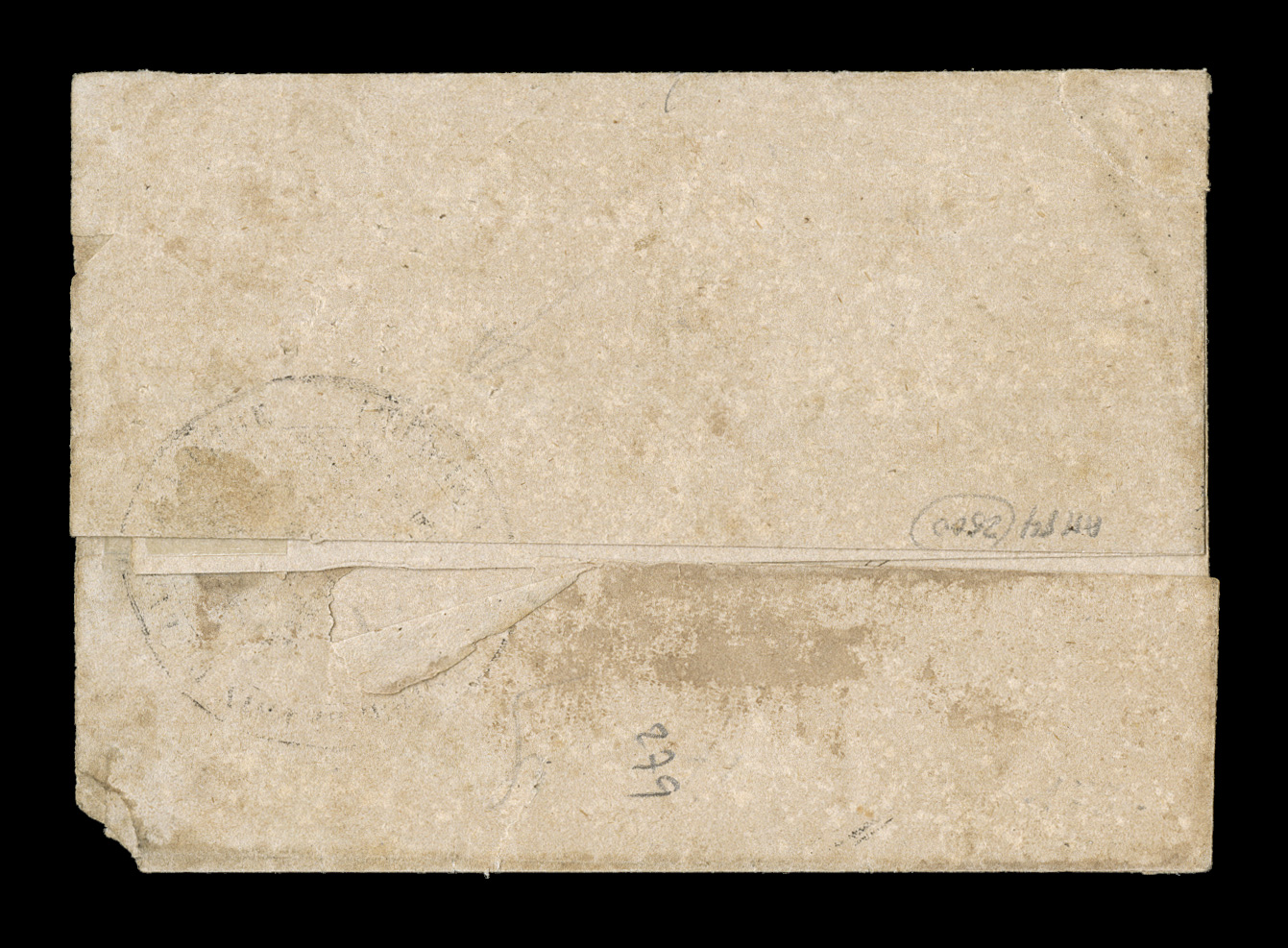 Pointe-a-Pitre(Guadeloupe)28 Dec 1856 double-circle c.d.s., marked paid with1856 Pointe-a-Pitre paid stampless printed matter entire folded bulletin to France, two wrappers crisscrossed around the bulletin, all beautifully intact with black "Pointe-a-Pitre/(Guadeloupe)/28 Dec 1856" double-circle c.d.s., marked paid with a red boxed "PD" handstamp, carried by British packet with nice red Calais entry transit, backstamped Havre, extremely fine and a beautiful example of this usage; prior to 1864 the printed matter rate to France was 13c, this rate could not be paid with stamps until the issuance of the 1c Eagle value, thus prior to 1862 payment had to be made in cash; as with all printed matter few examples survived, the remarkably choice example here is certainly among the finest of the few stampless printed matter items known; ex-Dubus. (imagea) (Image) Est. $400-500