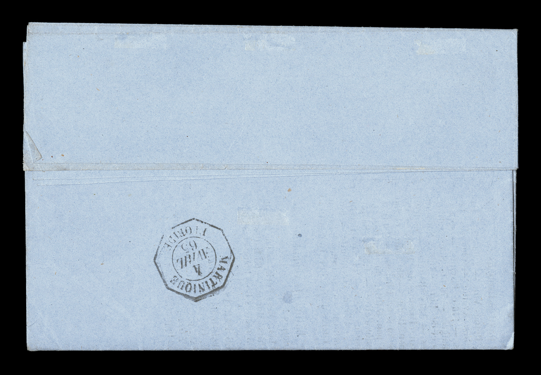 bulletin by black lozenge cancels, black Pointe-a-PitreGuadeloupe24 MaFrench Colonies Yvert #1, 3, 1859-62 1c Olive on pale blue vertical pair and 10c Yellow bister, each with well clear to large margins, tied to 1865 entire folded commercial bulletin by black lozenge cancels, black "Pointe-a-Pitre/Guadeloupe/24 Mars 1865" large rimless c.d.s., red "PD" boxed paid handstamp, carried via French packet "Floride" with nicely struck example of the rare "Martinique/Floride/4 Avril 65" octagonal packet marking on the reverse, posted to Bordeaux, choice very fine and attractive; the printed matter rate to France was reduced from 13c to 12c at the beginning of 1864; an early example of this printed matter rate to France and particularly rare with the "Floride" packet marking; 1961 RPS certificate. (imagea) (Image) Est. $1,000-1,500