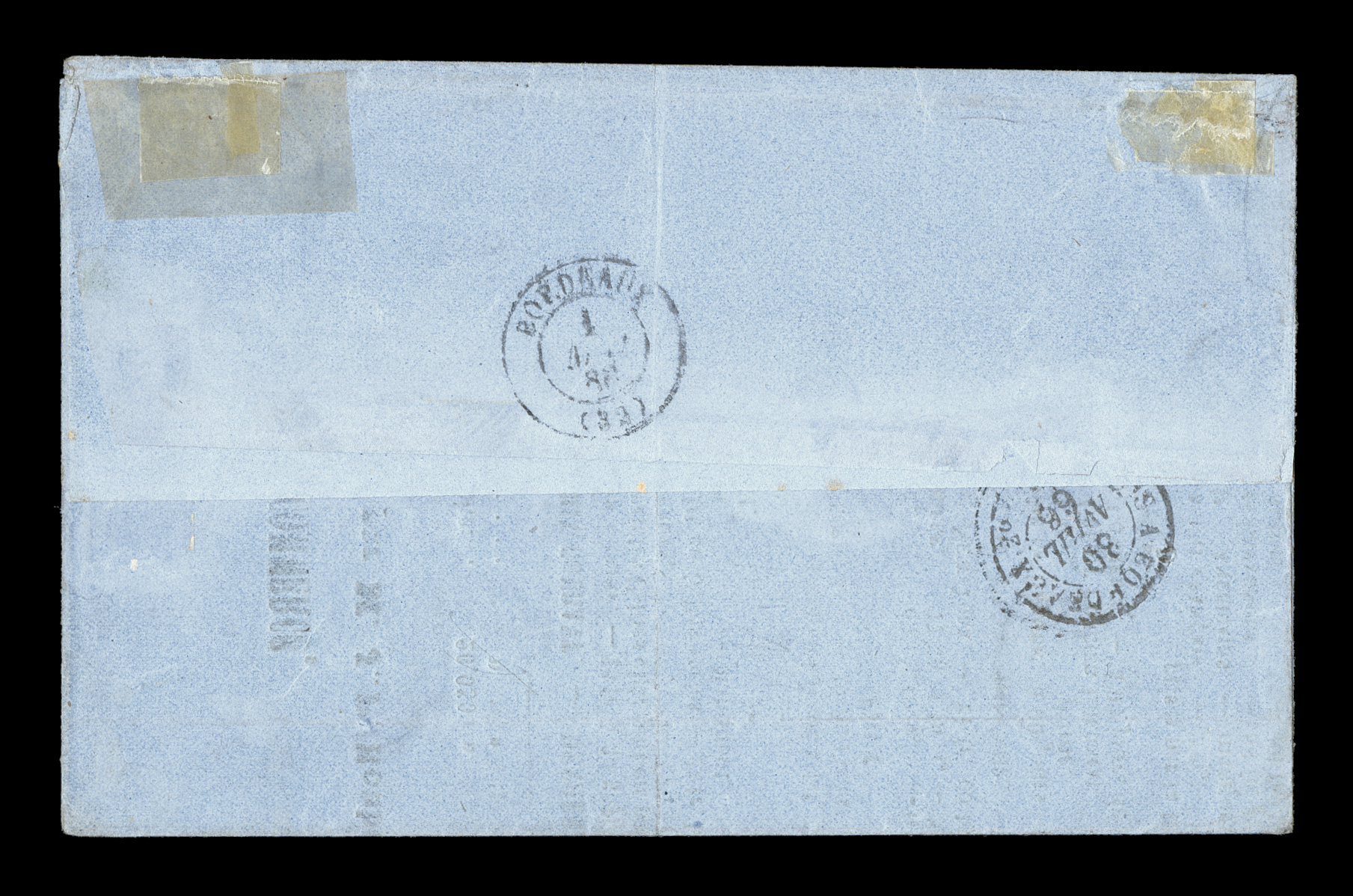 otherwise clear to large margins, neatly tied to 1863 entire folded coFrench Colonies Yvert #1, 2, 1862 1c Olive on pale blue horizontal strip of three and 5c Green horizontal pair, both exceptionally attractive, the strip barely cutting at top, otherwise clear to large margins, neatly tied to 1863 entire folded commercial bulletin by black lozenge cancels, clear "Pointe-a-Pitre/Guadeloupe/26 Sep 1863" rimless c.d.s., red "PD" boxed paid handstamp plus red Calais entry transit being carried by British packet, posted to Bordeaux, very fine and exceedingly choice; the 13c printed matter rate to France existed only until the end of 1863, giving a window of about two years when the newly issued 1c and 5c Eagles could be used for prepayment; only about a half dozen covers with the Eagle issue paying this rate are known, this lovely entire being among the finest recorded examples and a great Eagle cover rarity. (imagea) (Image) Est. $3,000-4,000