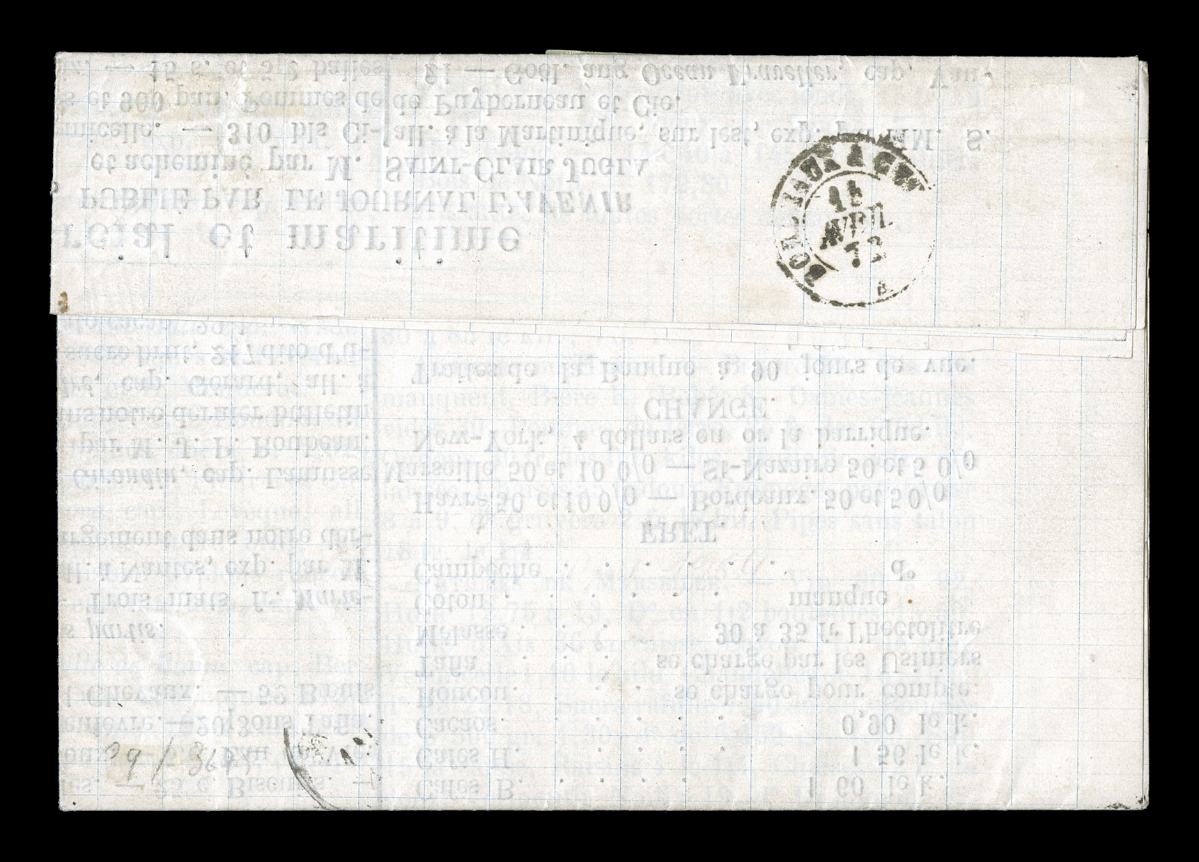 to 1872 entire folded commercial bulletin by black 8x8 point lozengeFrench Colonies Yvert #7, 17, 1872 1c Olive on pale blue horizontal pair and 5c Green on blue vertical pair, a very pretty franking with mostly nice margins on both pairs, tied to 1872 entire folded commercial bulletin by black 8x8 point lozenge cancels, black "Guadeloupe/Point-a-Pitre/21 Dec 72" double-circle c.d.s., black "PD" boxed paid handstamp, posted to Bordeaux, very fine and rare franking. (imagea) (Image) Est. $750-1,000