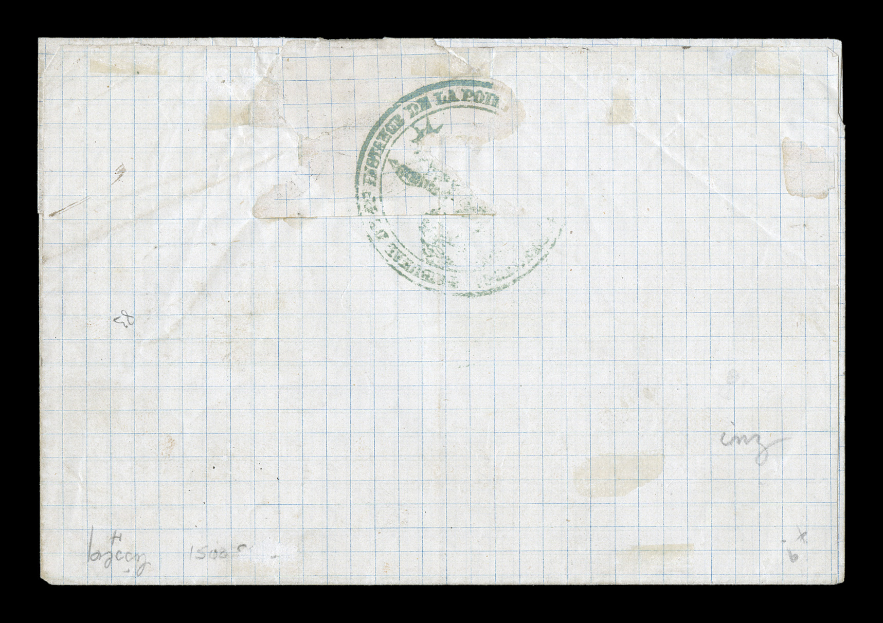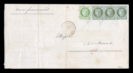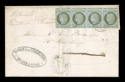 stamps at top, tied to 1875 folded cover that by the business cacheFrench Colonies Yvert #14, 1873 1c Olive on pale blue horizontal strip of four, an impressive franking with large to exceptionally large margins showing a portion of the adjacent stamps at top, tied to 1875 folded cover that by the business cachet was a bank notice by "Guadeloupe/Pointe-a-Pitre/17 Dec. 75" double-circle c.d.s., posted to the tiny village of Baie Mahault, marked in manuscript to return the cover and receiving a rare strike of "Guadeloupe/Baie Mahault/19 Dec 75" double-circle c.d.s., backstamped Pointe-a-Pitre the same day, a lovely and very fine cover; an amazingly rare cover in all of its aspects, being a rare printed matter rate with an elusive 1c Ceres franking, plus to a small town and receiving that town's rare postmark because it was returned; a striking set of circumstances that has produced a wonderful piece of postal history. (imagea) (Image) Est. $750-1,000