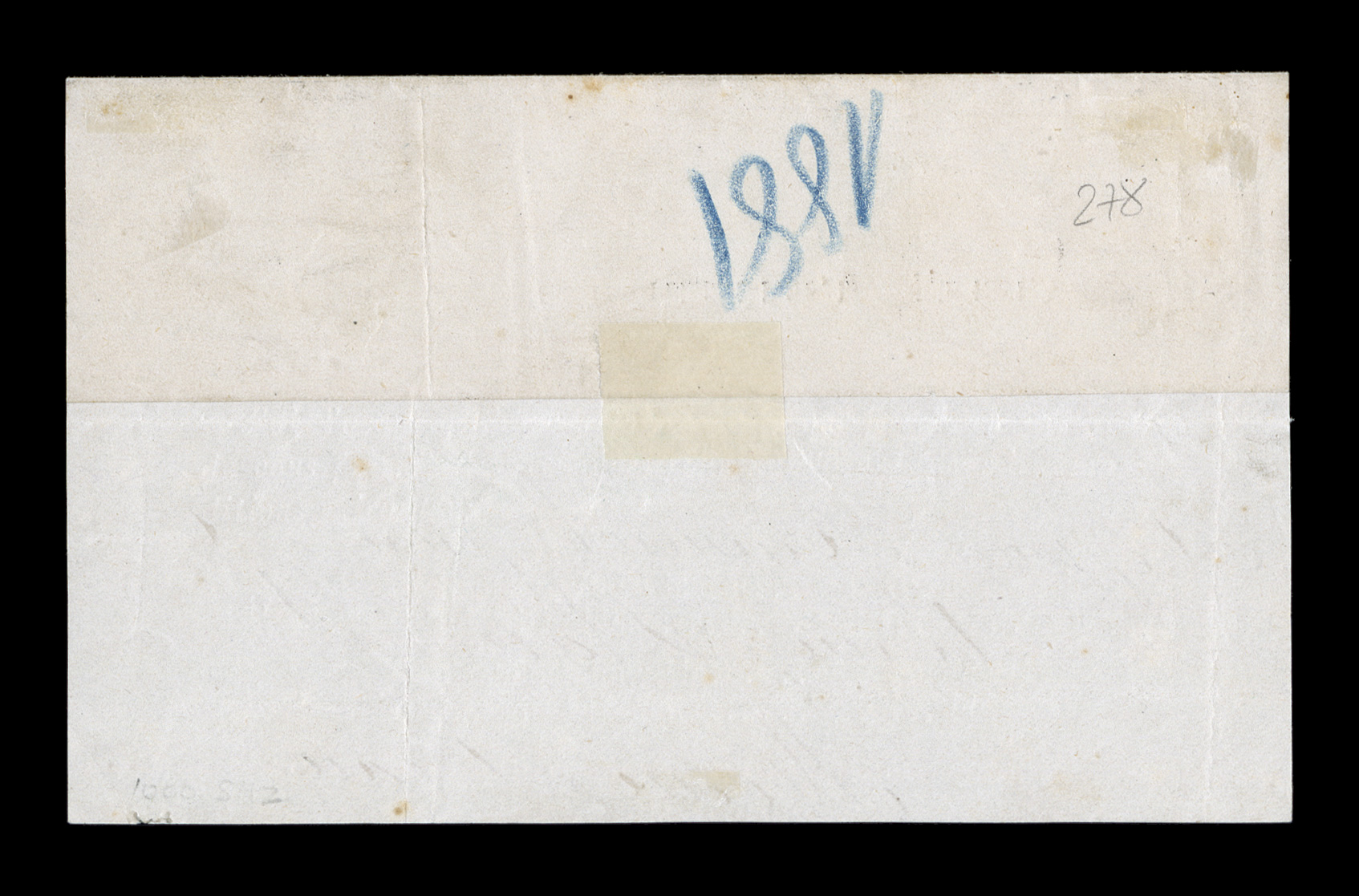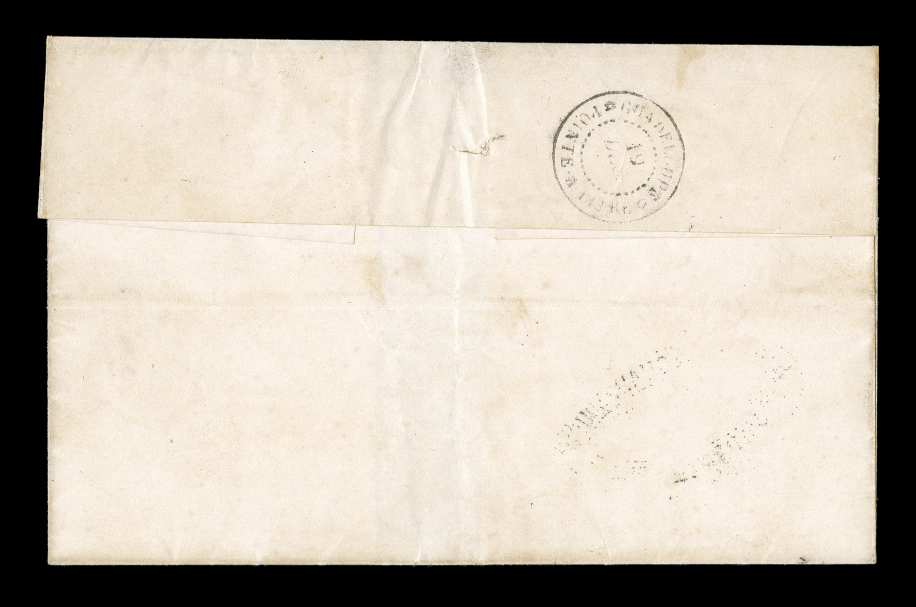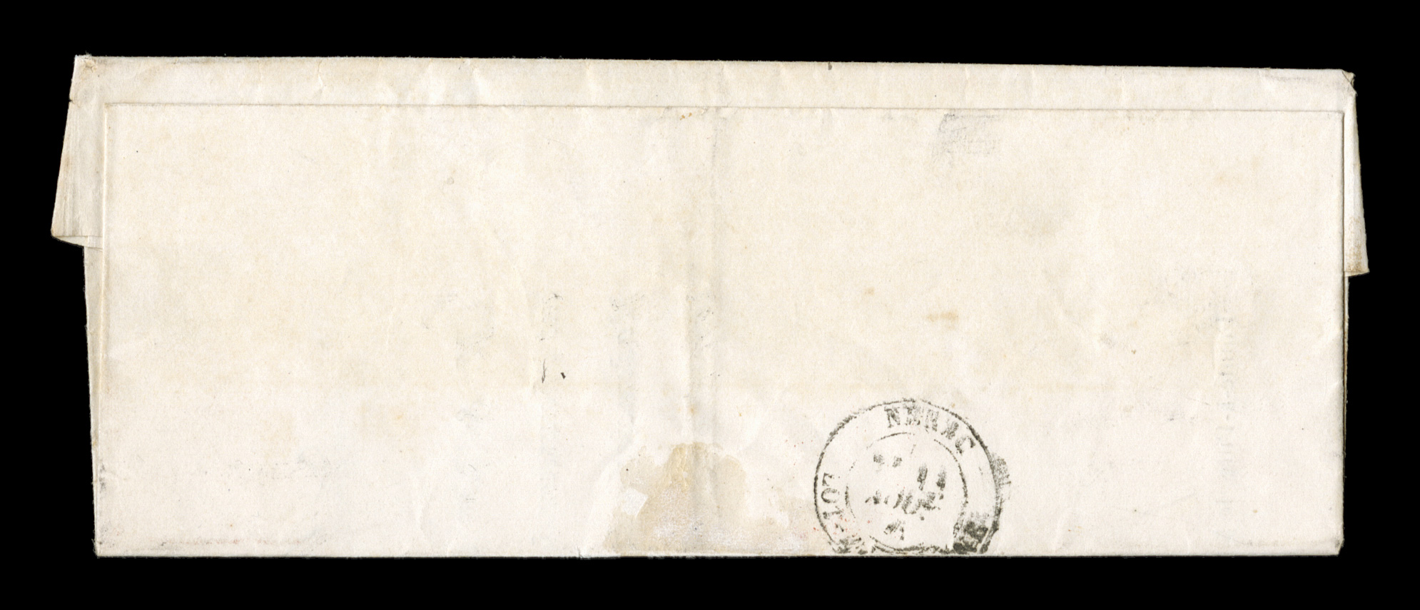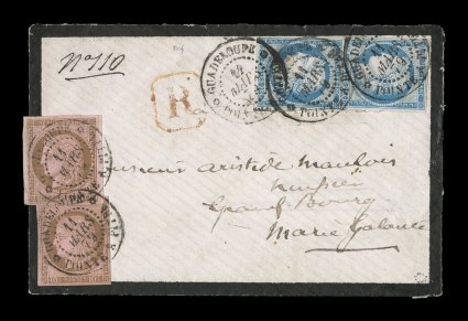 the timbre couche variety despite an affixing wrinkle to the two norFrench Colonies Yvert #3a, 1859 10c Yellow bister, vertical strip of three with one sideways, the variety being the top stamp in the strip, very attractive and rare example of the "timbre couche" variety despite an affixing wrinkle to the two normal stamps, well clear to large margins all around, tied to registered 1863 entire folded court notice by bold black 7x7 point lozenge cancels, matching black "Pointe-a-Pitre/Guadeloupe/16 Sep 1863" rimless c.d.s., locally posted within Pointe-a-Pitre paying the 10c special judiciary rate and 20c registration fee, large red boxed "P.P" handstamp and straight line "Charge", an official court cachet validates the special postal rate, very fine; the plate variety showing the sideways cliche is exceptionally rare on cover in its own right, but probably more rare is this unusual rate of which only three or four examples have been recorded, this being the only known example with the "timbre Couche" franking. (imagea) (Image) Est. $2,000-3,000
