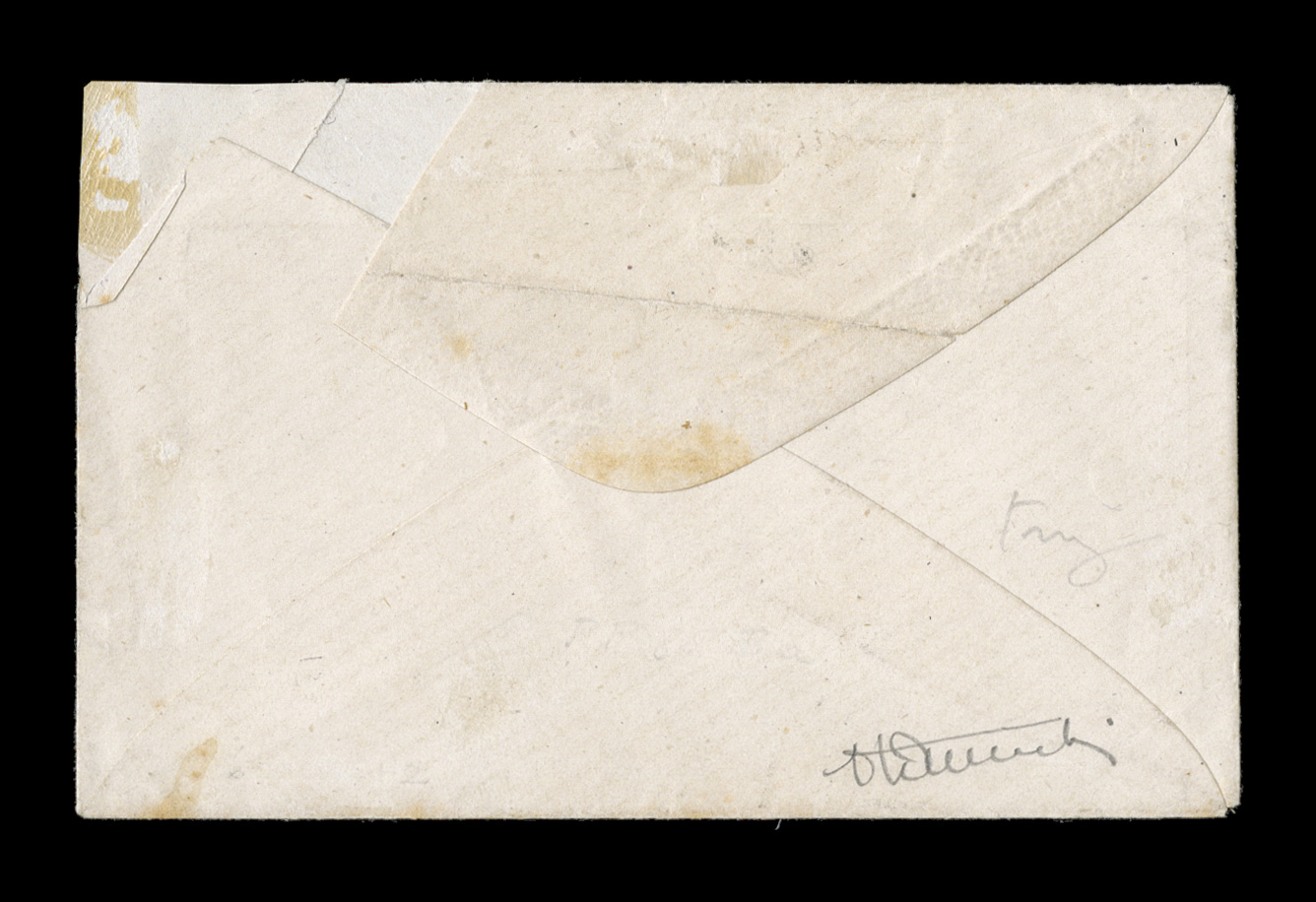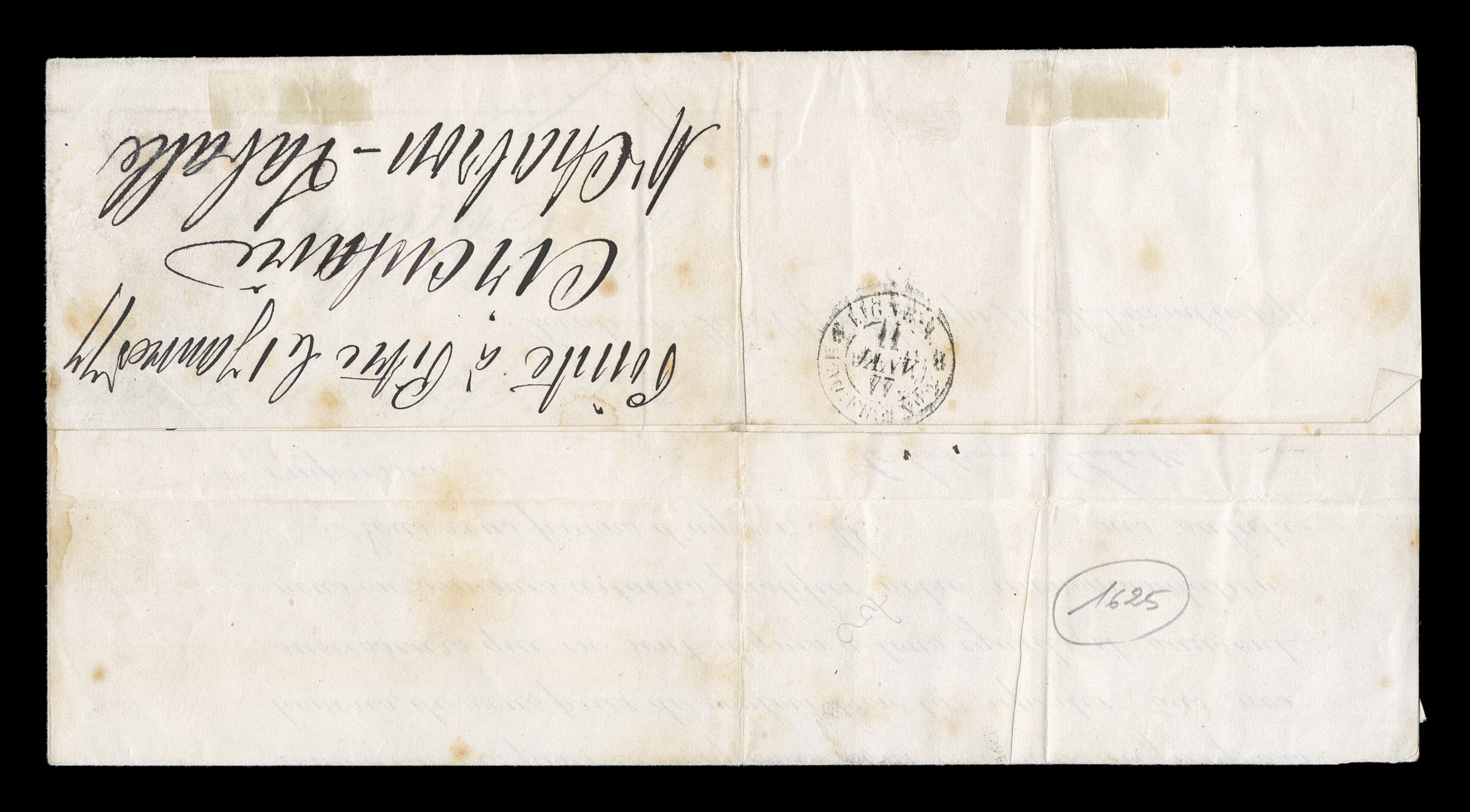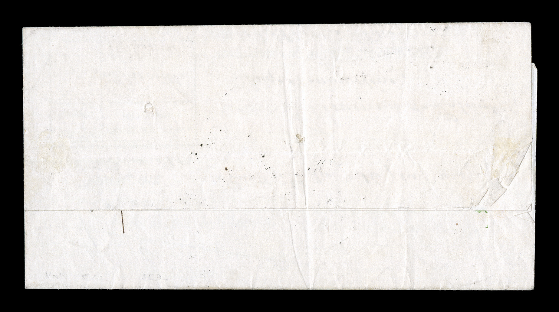 the timbre couche variety despite an affixing wrinkle to the two norFrench Colonies Yvert #3a, 1859 10c Yellow bister, vertical strip of three with one sideways, the variety being the top stamp in the strip, very attractive and rare example of the "timbre couche" variety despite an affixing wrinkle to the two normal stamps, well clear to large margins all around, tied to registered 1863 entire folded court notice by bold black 7x7 point lozenge cancels, matching black "Pointe-a-Pitre/Guadeloupe/16 Sep 1863" rimless c.d.s., locally posted within Pointe-a-Pitre paying the 10c special judiciary rate and 20c registration fee, large red boxed "P.P" handstamp and straight line "Charge", an official court cachet validates the special postal rate, very fine; the plate variety showing the sideways cliche is exceptionally rare on cover in its own right, but probably more rare is this unusual rate of which only three or four examples have been recorded, this being the only known example with the "timbre Couche" franking. (imagea) (Image) Est. $2,000-3,000
