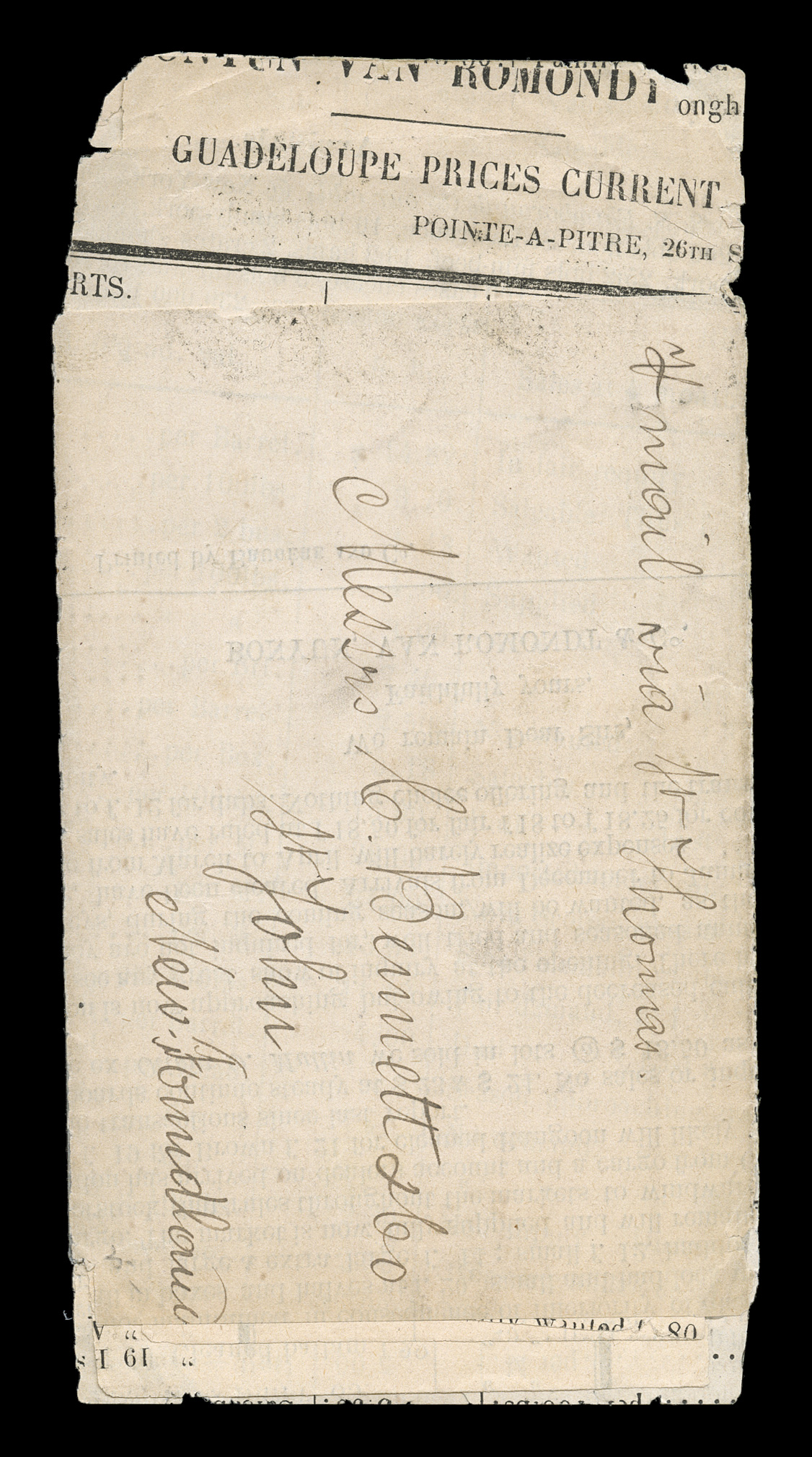rate to St. Johns, Newfoundland, stamps with rich colors and cleaFrench Colonies Yvert #17, 37, 1872-77 5c Green on blue and 1c Black on blue, Ty. II, horizontal strip of three, an extremely rare 8c franking paying the foreign printed matter rate to St. Johns, Newfoundland, stamps with rich colors and clear to large margins, tied to 1879 newspaper wrapper that yet retains a portion of the newsprint prices current, stamps tied by black "Paq. Fr./Point-a-Pitre/30 Sept. 79" double-circle sorting c.d.s., Basse Terre and St. Georges, Bermuda duplex transits, enclosure is only partial but wrapper is largely intact and very fine; a very rare Ceres and Sage combination franking and an equally rare destination during the early transitional part of the U.P.U. period while rates were in flux. (imagea) (Image) Est. $1,000-1,500
