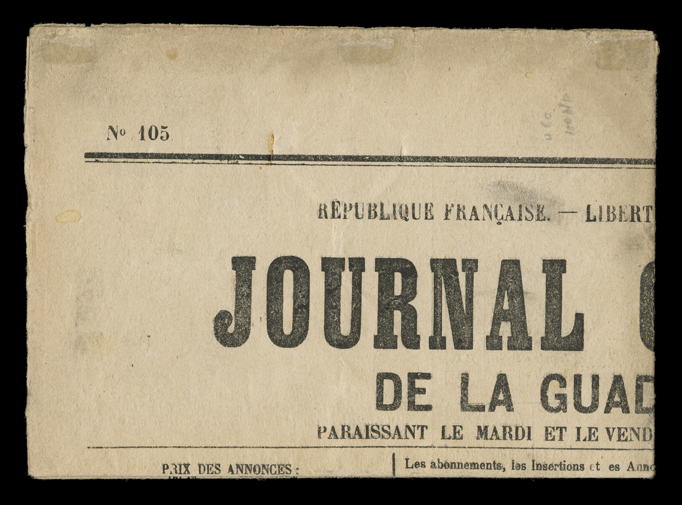within its pages details of the creation of the new GuadeloupeYvert #10, 1891 "5c/G.P.E." Provisional surcharge on 10c Black on lilac, attractive single franking tied to entire 1890 newspaper, "Journal Official de la Guadeloupe", which contains within its pages details of the creation of the new Guadeloupe postal overprints of this time, stamp tied by black "Guadeloupe/Basse Terre/28 Fevr. 91" double-circle c.d.s., address removed otherwise the paper is intact and very fine; newspapers, of all the classes of printed matter, are among the scarcest because they almost always were thrown away; extremely rare with this scarce provisional surcharge and possibly unique with its philatelic content. (imagea) (Image) Est. $500-750