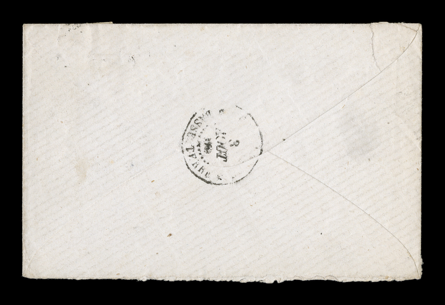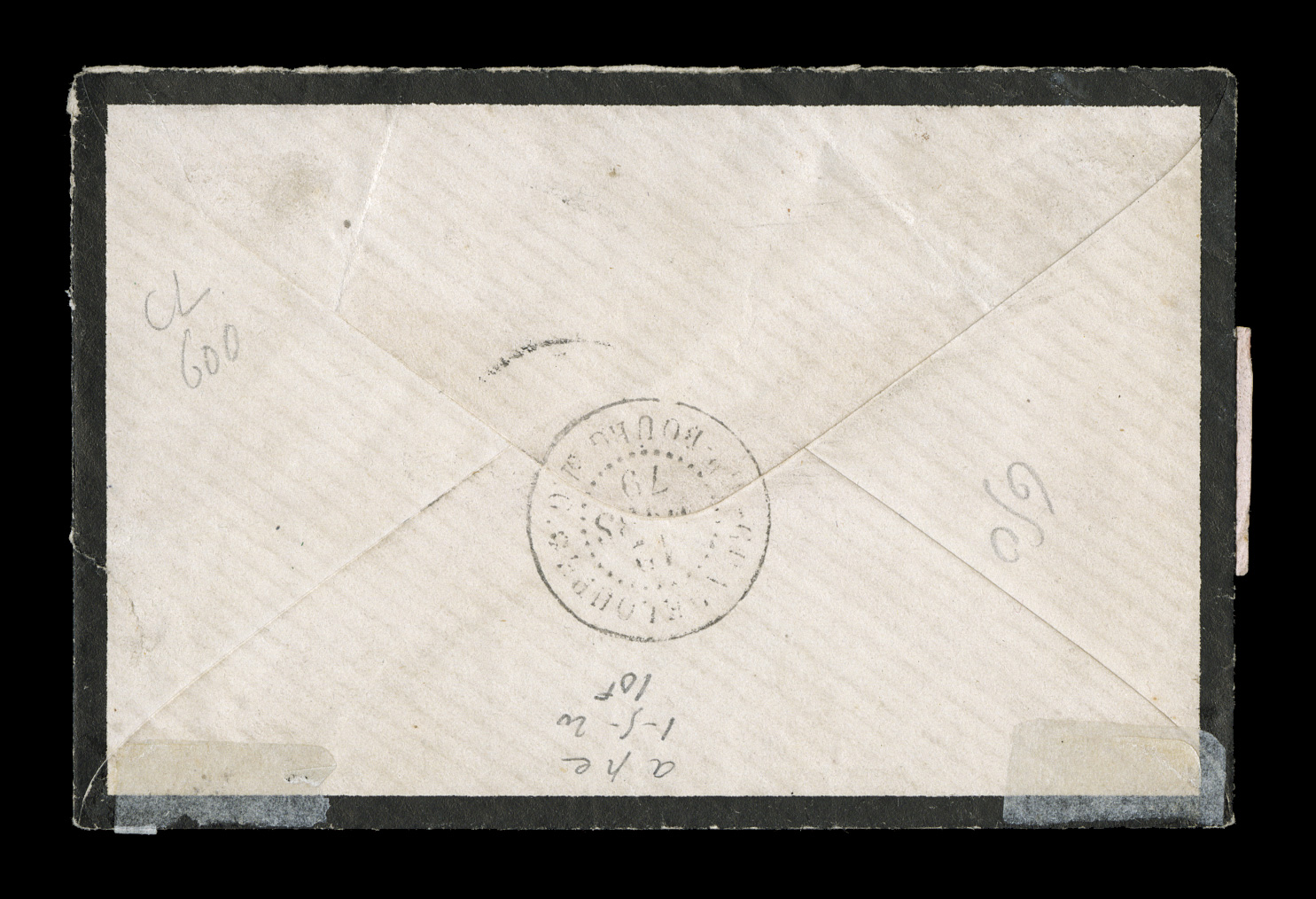 registered mourning cover to Grand Bourg on Marie Galante, stamps tied byFrench Colonies Yvert #18, 23a, 1872-76 10c Brown on rose and 25c Blue, Ty. III, two singles of each with well clear to large margins all around, tied to rare 1877 domestic registered mourning cover to Grand Bourg on Marie Galante, stamps tied by "Guadeloupe/Pointe-a-Pitre/11 Mars 79" double-circle c.d.s., similar "Gd. Bourg M.G." backstamp on the reverse the next day, red "R" boxed handstamp, one 10c affixed slightly over the edge causing trivial edge crease, very fine; a handsome and rare posting paying 50c registry fee and 20c domestic rate; signed Roumet and accompanied by a 2005 Alexander Roumet certificate. (imagea) (Image) Est. $750-1,000