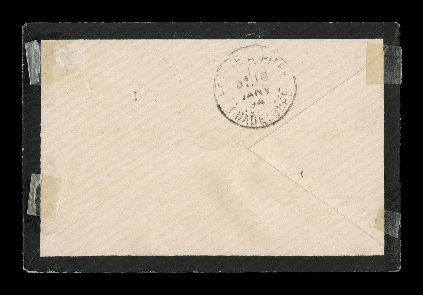 at the 2c printed matter rate (probably a death notice), stamp tYvert #15b, 1891 2c Lilac brown on buff with provisional "Guadeloupe" overprint, "Guadbloupe" variety, a rare single franking of this popular spelling error on a mourning cover sent at the 2c printed matter rate (probably a death notice), stamp tied by indistinct "Basse Terre/Guadeloupe/16 Janv 94" double-circle c.d.s., backstamped Pointe-a-Pitre the same day, exceptionally attractive, choice very fine; a wonderfully rare and proper usage of this 2c low value provisional issue and particually desirable with the variety in the overprint. (imagea) (Image) Est. $300-400