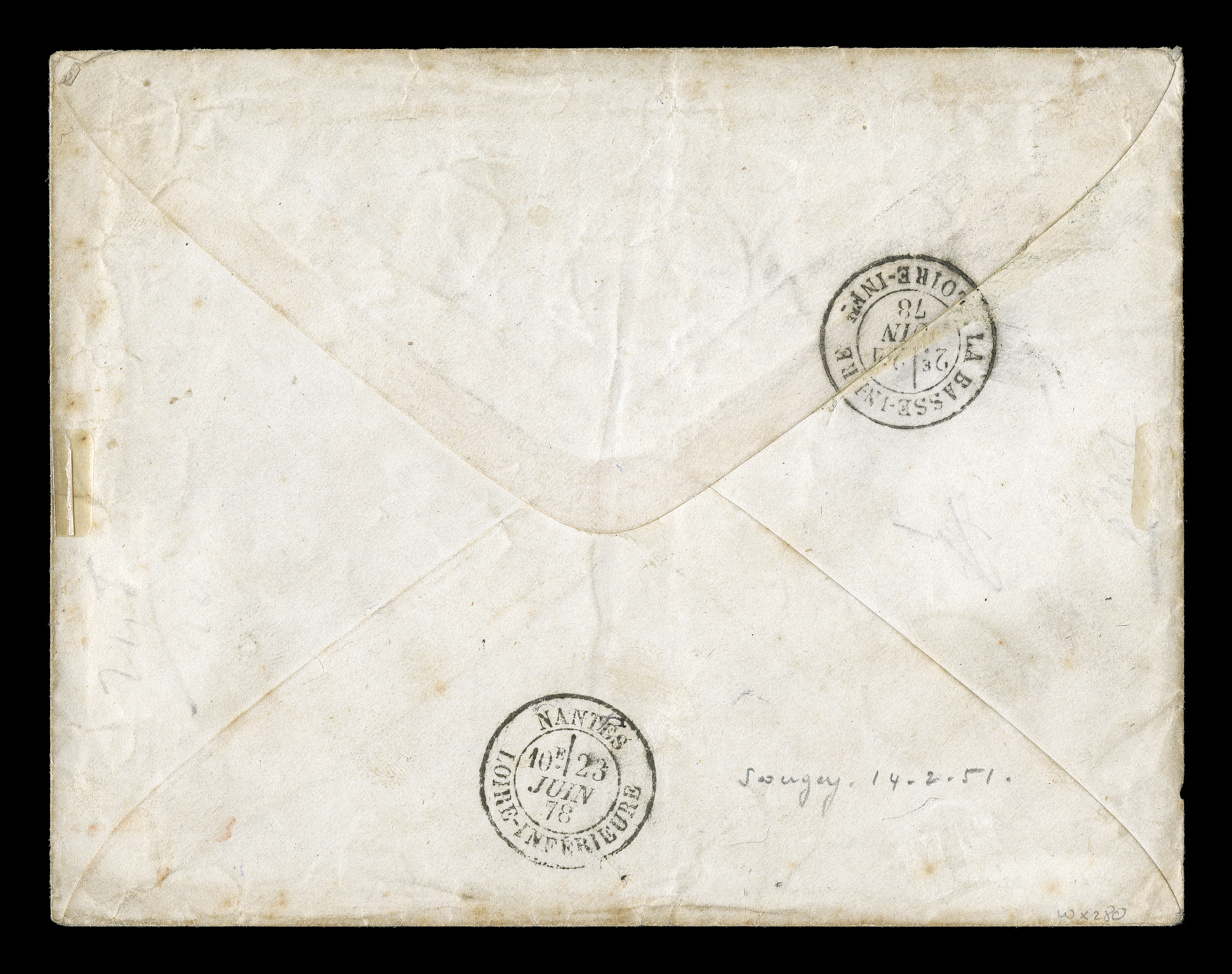 of 3c per 5-10 grams to France, both tied to 1881 folded marriage anFrench Colonies Yvert #37, 47, 1878-81 1c Black on blue, Ty. II and 2c Brown lilac on buff, an exceptionally attractive mixed issue franking paying a special printed matter rate of 3c per 5-10 grams to France, both tied to 1881 folded marriage announcement by black "Guadeloupe/Pointe a Pitre/20 Juil 81" double-circle c.d.s., posted to France with red French packet transit of Line "B", backstamped Nerac, very fine; this unusual rate apparently was for simple announcements such as birth, death and marriage; the franking here is highly unusual and this may quite possibly be the only example known. (imagea) (Image) Est. $1,000-1,500