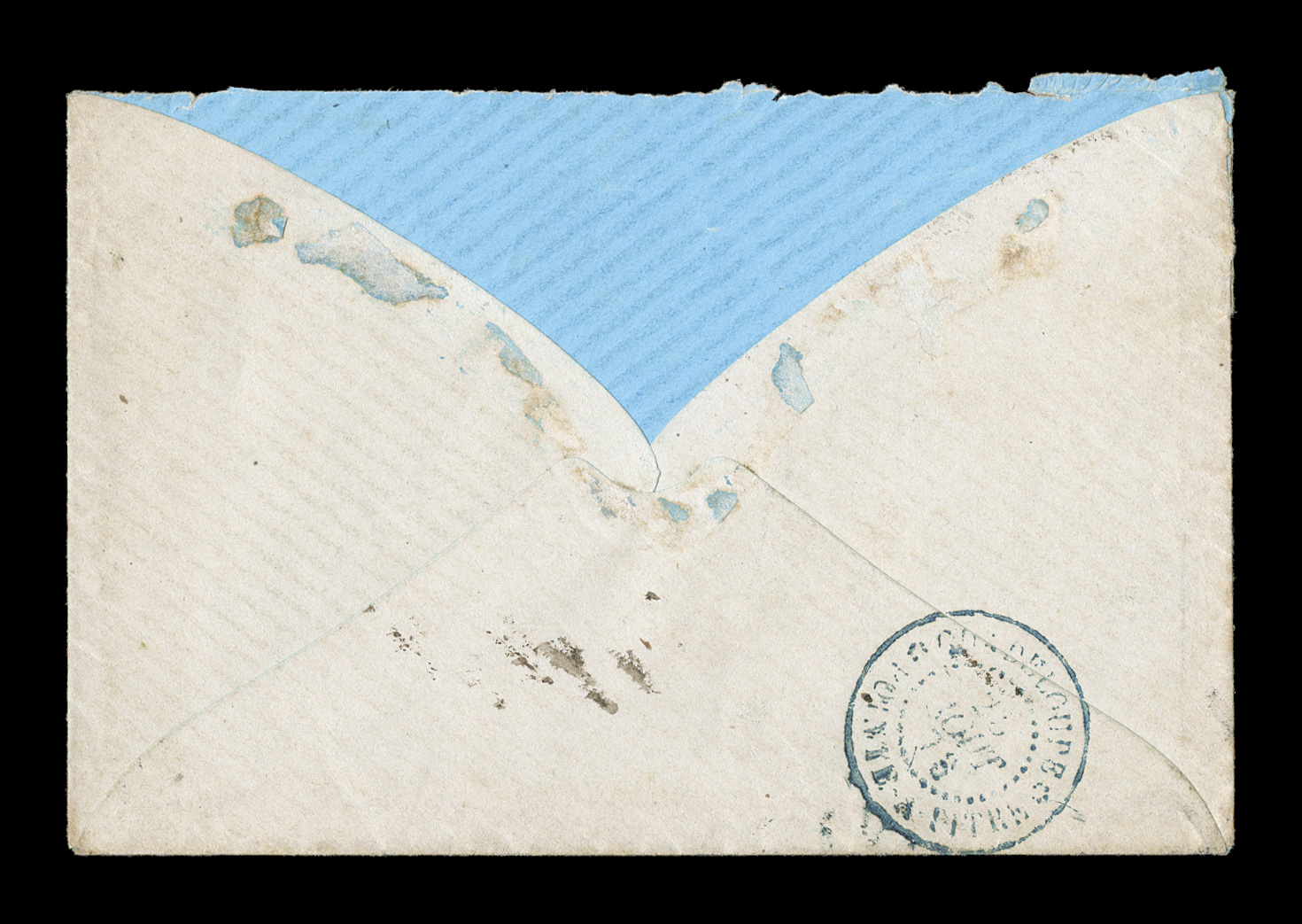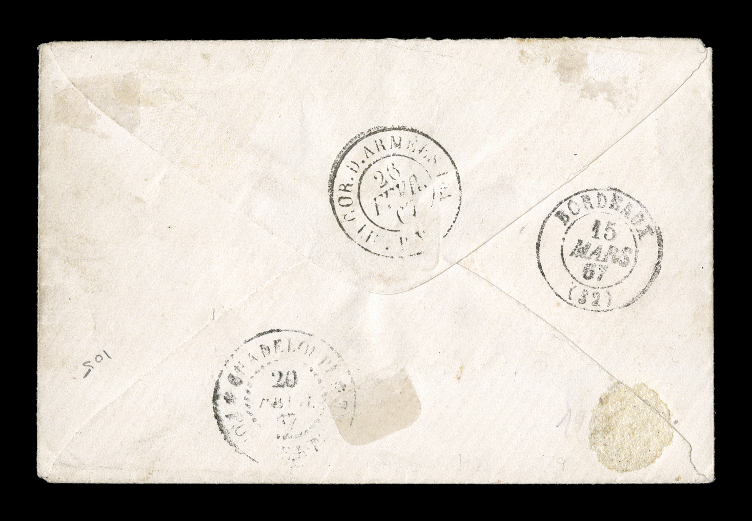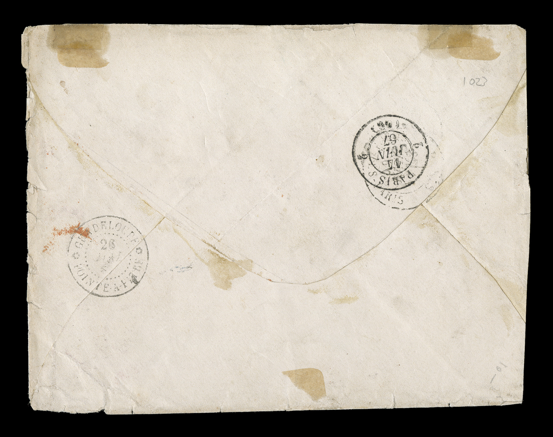 France by black 7x7 point lozenge cancels, black GuadeloupeMoule19 FevFrench Colonies Yvert #3, 5, 1859 10c Yellow bister and 40c Vermilion, attractive singles, 40c barely cutting in at top otherwise large margins, tied to small 1867 cover to France by black 7x7 point lozenge cancels, black "Guadeloupe/Moule/19 Fevr 1867" double-circle c.d.s., Pointe-a-Pitre transit on the reverse, carried by French packet at the preferred 40c rate, however a "Cor. D. Armees/Lig. B paq." c.d.s. transit was incorrectly applied as the lack of endorsement and rate clearly show, backstamped Bordeaux, very fine and attractive cover from the smaller town of Moule; ex-Levett. (imagea) (Image) Est. $500-750