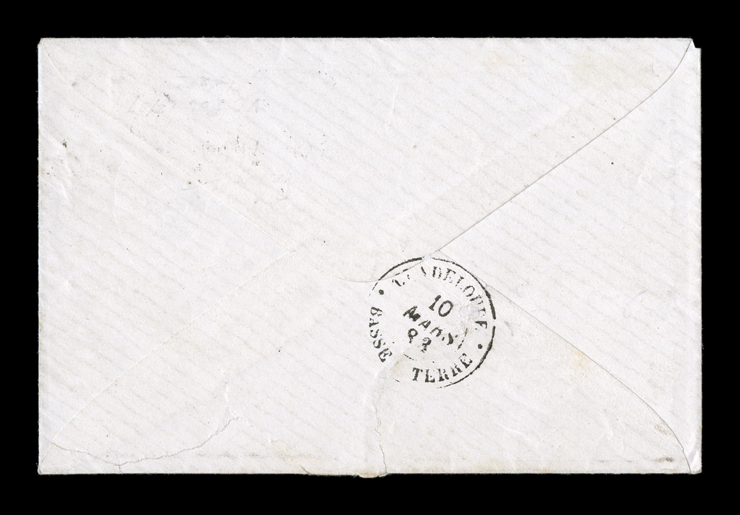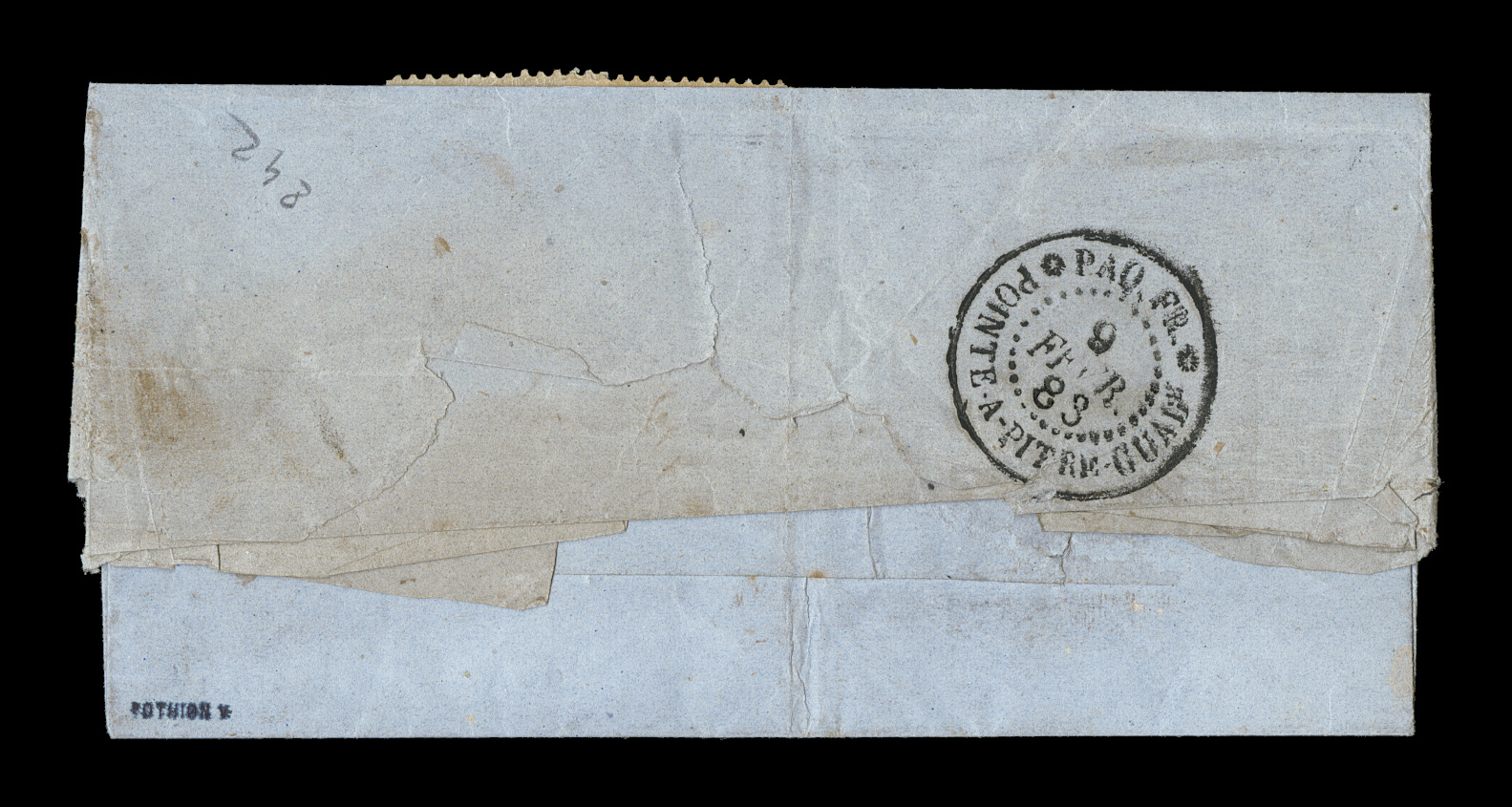 Gte.)9 Fevr. 83 double-circle c.d.s. on entire folded letter, a c1883 Grand Bourg unpaid postage due folded letter to France, posted from the smaller Island of Marie Galante with a very rare use of the larger size "Guadeloupe/Grand Bourg (Mie. Gte.)/9 Fevr. 83" double-circle c.d.s. on entire folded letter, a confirming Pointe-a-Pitre transit of the same date on the reverse, 10c Black and 40c Black French postage dues (Yvert #15, 19) tied on arrival in Paris by triangular due handstamp paying double the 25c U.P.U. rate, soiling to the back of the cover, very fine; Dubus records that this rare postmark was used from January 1888 to 1892, this cover establishes that it was used far earlier than that. (imagea) (Image) Est. $1,000-1,500