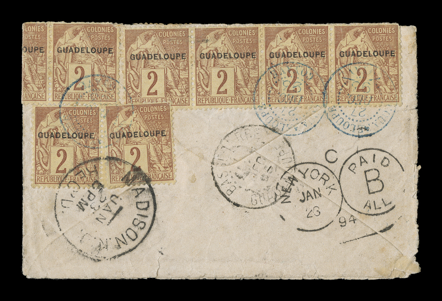 1893 cover to the United States from Goyave, the strip of seven iYvert #15, 1891 2c Lilac brown with provisional "Guadeloupe" overprint, horizontal strips of seven and four plus two singles overpaying the 25c U.P.U. rate by 1c, tied to small 1893 cover to the United States from Goyave, the strip of seven is wrapped around from the front to the back and small edge flaws to stamps where affixed closed to edge, all tied by "Guadeloupe/Goyave/27 Dec. 93" double-circle c.d.s. with additional strike below, Basse Terre and New York transits, backstamped Madison, New Jersey, cover opened out on three sides with small edge tear at bottom, a fine and scarce cover from this small town on the east coast of Basse Terre. (imagea) (Image) Est. $200-300