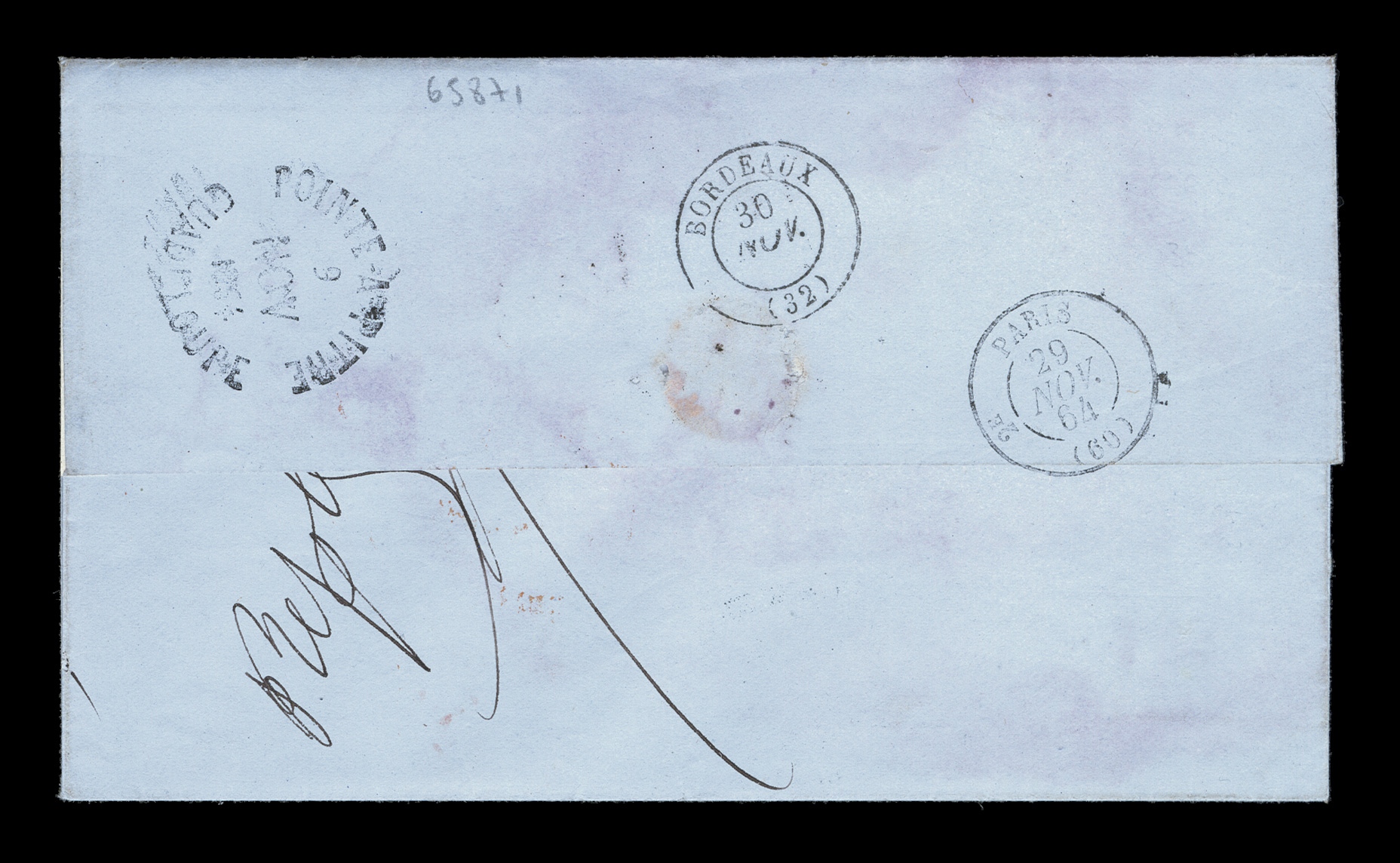 c.d.s., boxed PD handstamp, carried by British packet with black Cala1861 Moule paid stampless entire letter to France, exceptionally fresh and attractive entire folded letter with perfectly struck "Moule/Guadeloupe/24 Mars 1861" large rimless c.d.s., boxed "PD" handstamp, carried by British packet with black Calais entry transit on the front, Paris-Bordeaux transit on the reverse and backstamped St. Jean d'Angely, extremely fine and lovely paid cover to France. (imagea) (Image) Est. $200-300