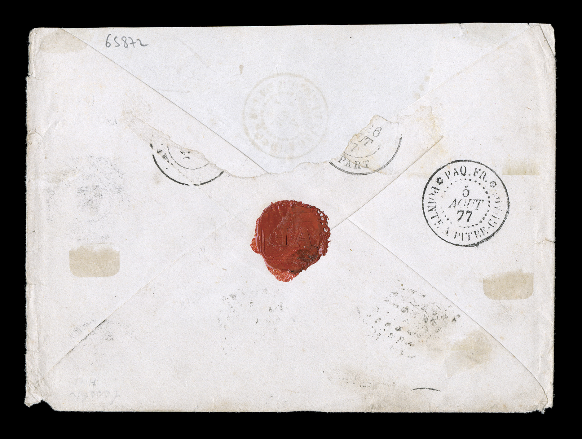 cover to France paying the 50c rate, posted from the small village of<French Colonies Yvert #13, 17, 1871-2 5c Green on blue horizontal pair and 40c Orange, the pair has large margins all around, 40c cutting at bottom, tied to 1876 French packet cover to France paying the 50c rate, posted from the small village of Grand Bourg and tied by two clear strikes of rare black "Guadeloupe/Marie-Galante/23 Fevr. 76" double-circle c.d.s. identifying the Island of Marie Galante only of which Grand Bourg was the major town, Pointe-a-Pitre transit on the reverse and blue St. Nazaire entry transit on the front, backstamped Fours, edge wear to the cover causing small edge tears at bottom and small corner creases slightly affecting the 40c, fine and rare cover from this smaller Island of Marie Galante. (imagea) (Image) Est. $1,500-2,000