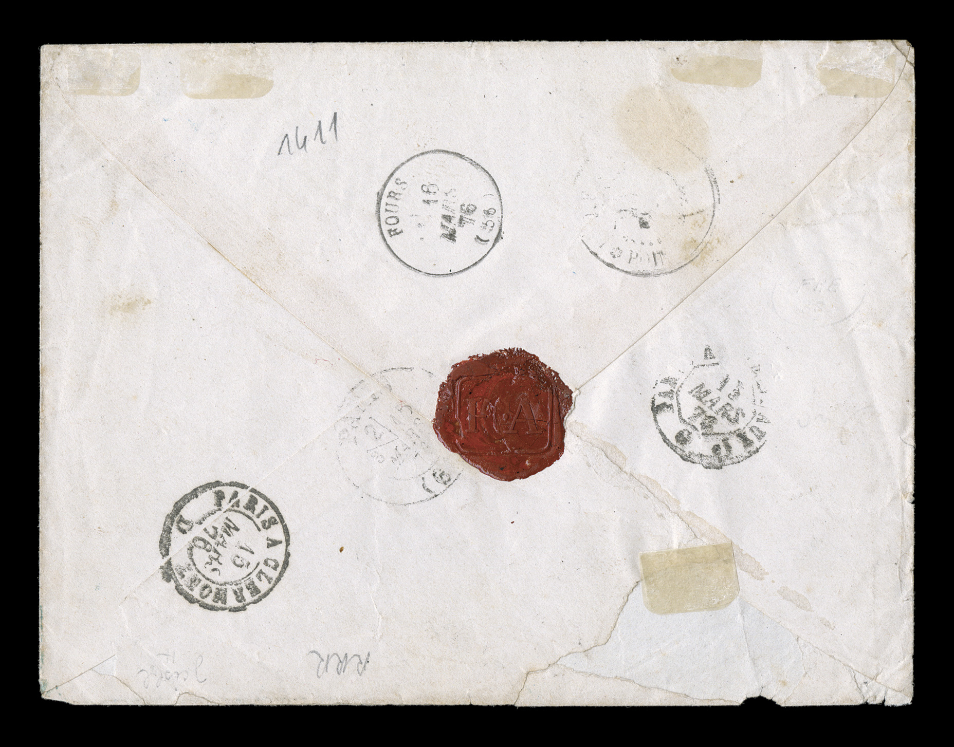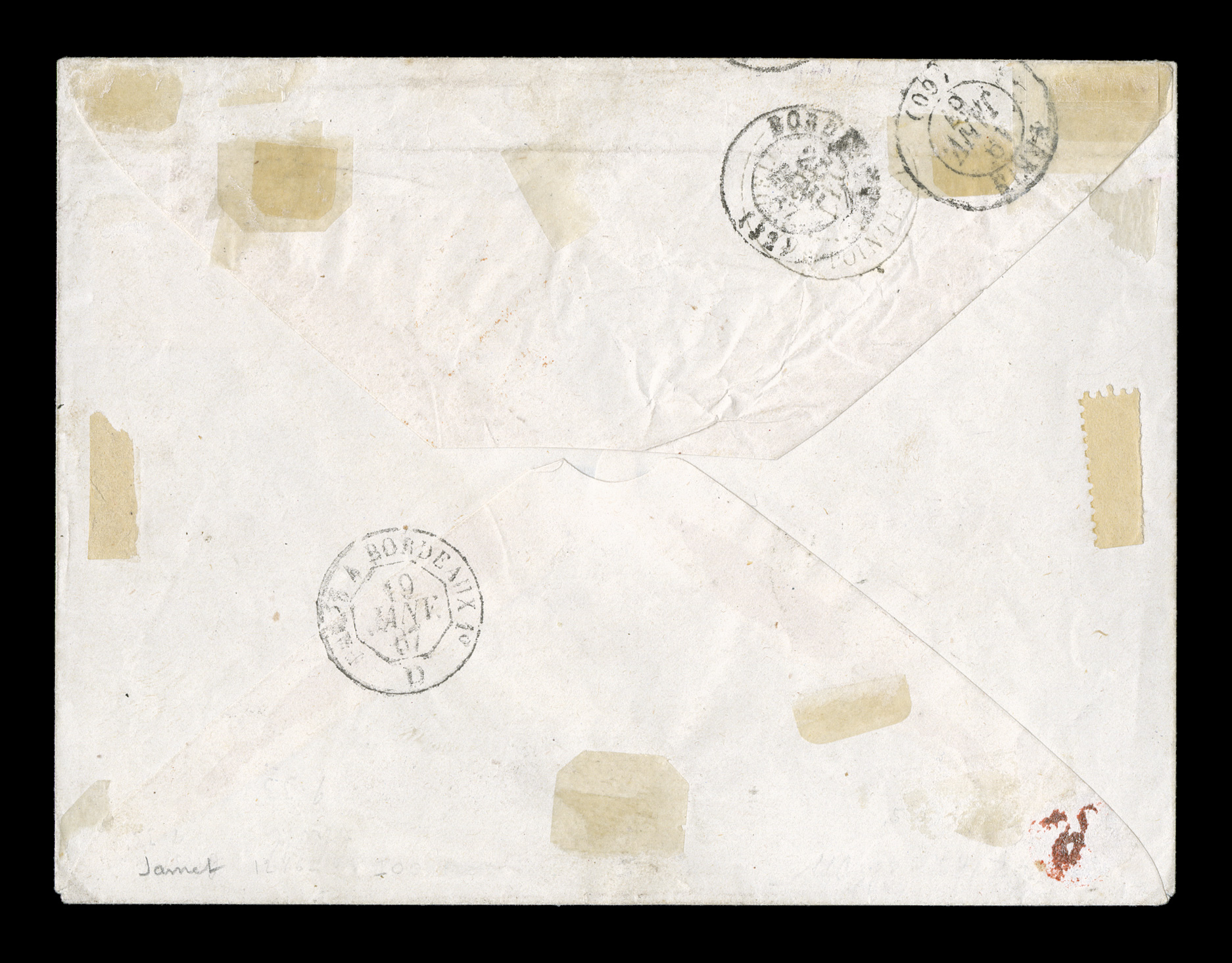 touching at one point on the strip, stamps tied to 1864 folded cover toFrench Colonies Yvert #3, 5, 1859 10c Yellow bister vertical strip of three and 40c Vermilion, handsome Eagle franking with mostly clear to large margins on both values, just touching at one point on the strip, stamps tied to 1864 folded cover to France paying the 70c British packet rate from the smaller island of Marie Galante by 7x7 point black lozenge cancels, black "Grand-Bourg (Mie Gte)/(Guadeloupe)/8 Nov 1864" rimless c.d.s., similar Pointe-a-Pitre transit on the reverse the next day, red "PD" boxed handstamp and matching red entry transit for British packet service, Paris transit, backstamped Bordeaux, very fine; Marie Galante is located southeast of the two major islands and Grand Bourg is the principle town on Marie Galante but at this early period it was just a very small town with little mail coming from this lesser island; a rare and attractive cover of the Eagle period. (imagea) (Image) Est. $1,000-1,500