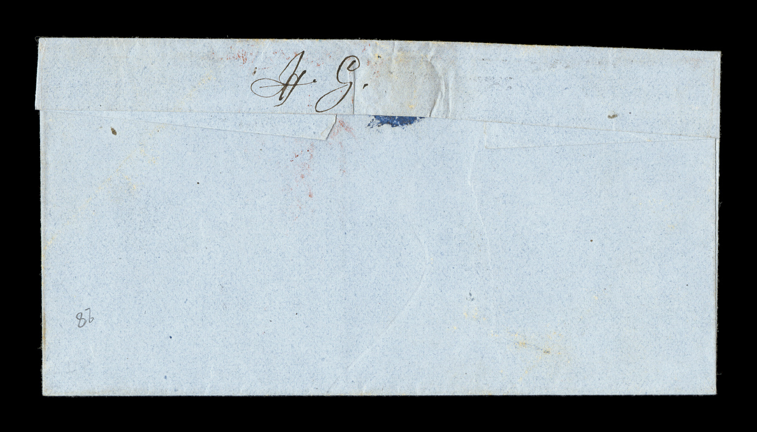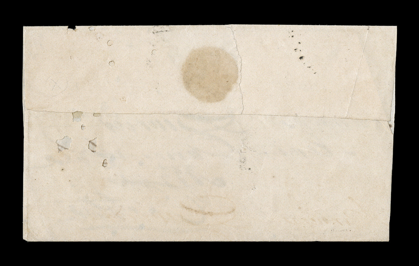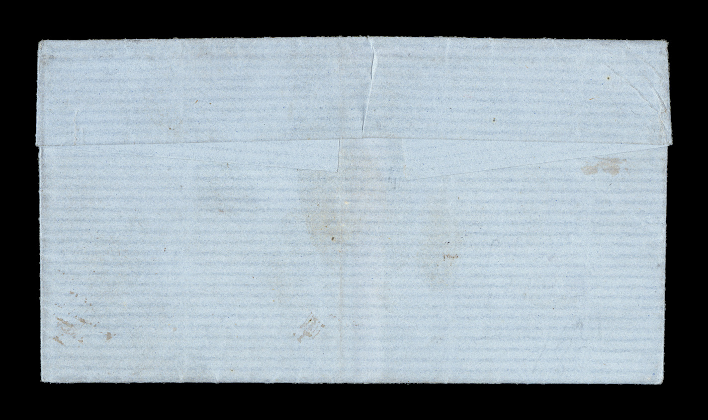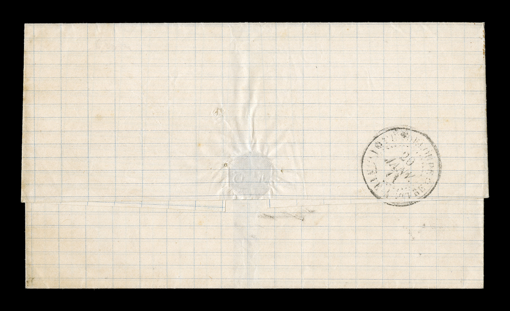 handstamp at right indicating the 15c local rate had been paid in cash,1852 Moule prepaid stampless cover, petite domestic folded cover with unusually well struck large "Moule/(Guadeloupe)/8 Janv. 1852" double-circle c.d.s., matching "P.P" boxed handstamp at right indicating the 15c local rate had been paid in cash, small insect holes, otherwise very fine; prepayment of domestic letters at this period had to be done in cash as the French stamps in current use were only available for franking to France; this marking is very rare and probably more so on a domestic cover; rated by Jamet at scarcity 5 with only a few examples known. (imagea) (Image) Est. $500-750
