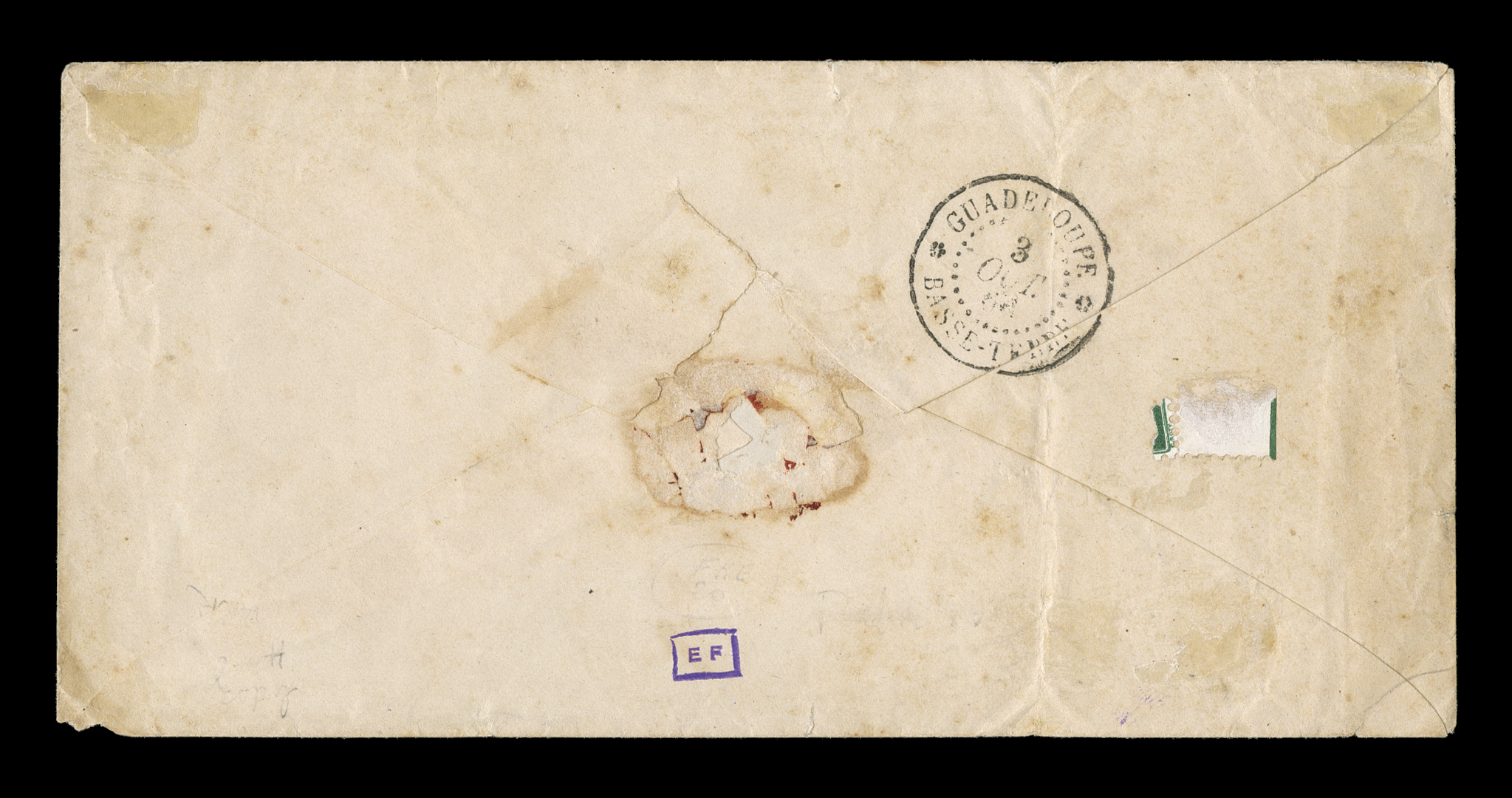 struck black GuadeloupeGd. Bourg M. G.4 Aout 71 double-circle c.d.s.French Colonies Yvert #13, 1871 40c Orange, mostly large margins, just into the frame at top left, tied to 1871 cover to France by black lozenge cancel, very clear and well struck black "Guadeloupe/Gd. Bourg M. G./4 Aout 71" double-circle c.d.s. at right, Pointe-a-Pitre French Packet sorting c.d.s. transit on the reverse, backflap missing but still with a portion of the Fours backstamp, edge wear to the corners of the cover and small edge tear at left, a fine and rare cover from this small village on the smaller Island of Marie Galante showing the 40c French packet rate; ex-Dubus. (imagea) (Image) Est. $500-750