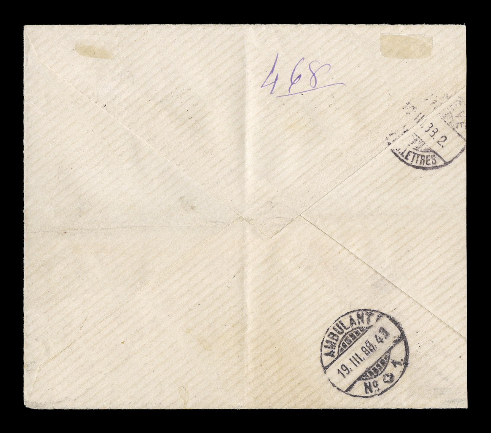 Grande Terre, strip tied by Morne a lEauGuadeloupe28 Fevr 88French Colonies Yvert #54, 1886 25c Black on rose horizontal strip of three, tied to handsome 1888 registered cover to Switzerland from the small village of Morne-a-l'Eau on Grande Terre, strip tied by "Morne a l'Eau/Guadeloupe/28 Fevr 88" c.d.s., black "R" boxed registry handstamp and blue Line "D" French packet octagonal handstamp on the front, backstamped Geneva, light folds to cover slightly affecting the right stamp in the strip and cover slightly reduced at left, very fine; a nice registered cover with clear struck markings paying double the 25c U.P.U. rate and 25c registry fee to an unusual destination. (imagea) (Image) Est. $750-1,000