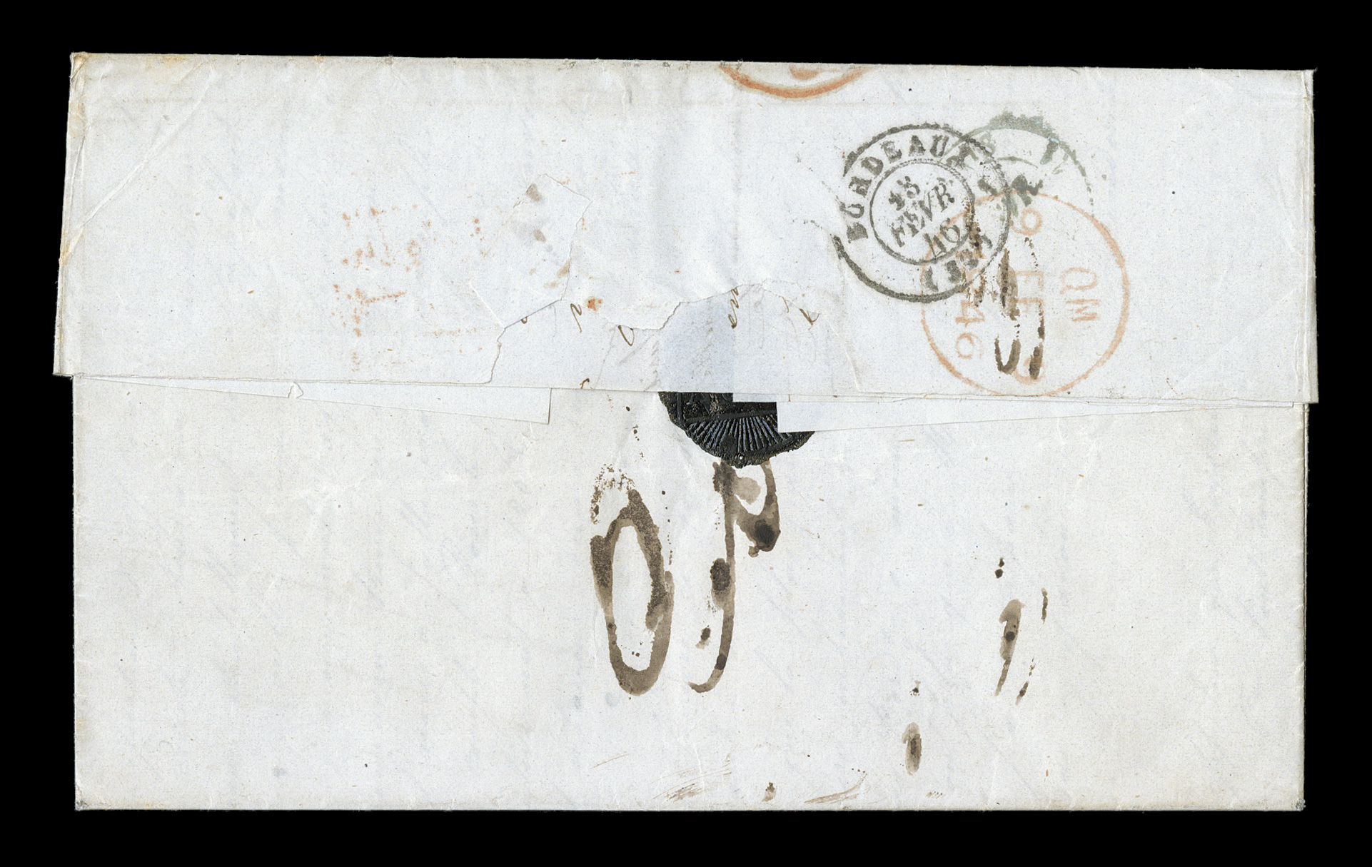 entire folded letter, via British packet with London transit on1846 Moule unpaid stampless entire letter to France, exceptionally well struck black "Moule/Guadeloupe/9 Janvier 1846" double-circle c.d.s. and similar Basse Terre transit c.d.s. on entire folded letter, via British packet with London transit on the reverse, red Boulogne entry transit and boxed Article 13 handstamp, manuscript "30" handstamp for double rate 30 decimes due, backstamped Bordeaux, very fine; a nice cover being slightly prior to the period when French stamps were used for prepayment but under the same rate structure. (imagea) (Image) Est. $500-750