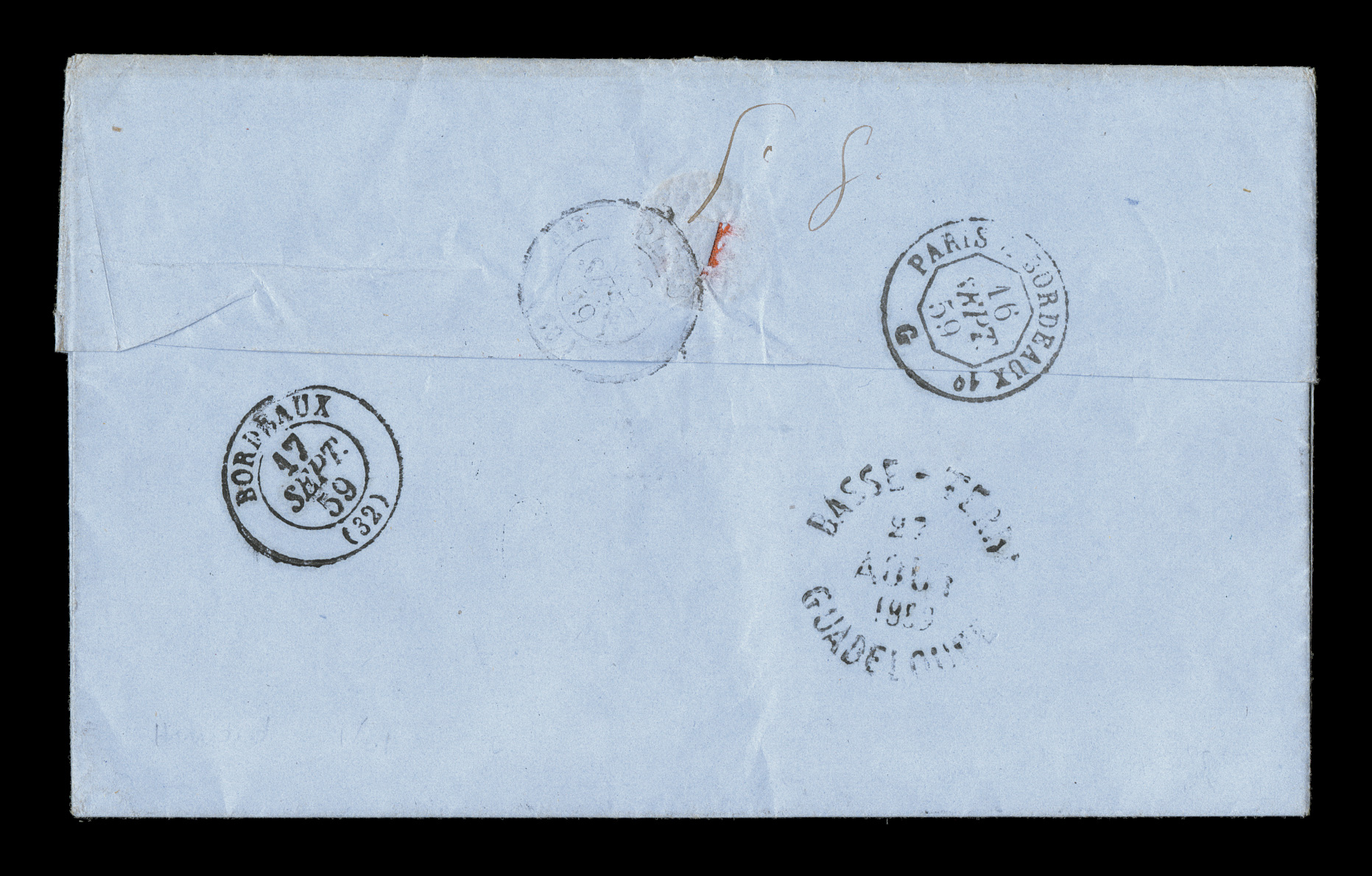 reverse, bold 6 rate handstamp for 6 decimes due, via British pa1859 Moule unpaid stampless entire letter to France, fresh entire folded letter with black "Moule/Guadeloupe/25 Aout 1859" double-circle c.d.s., rimless Basse Terre transit on the reverse, bold "6" rate handstamp for 6 decimes due, via British packet with well struck black Calais entry transit on the front, backstamped Bordeaux, very fine and choice. (imagea) (Image) Est. $200-300