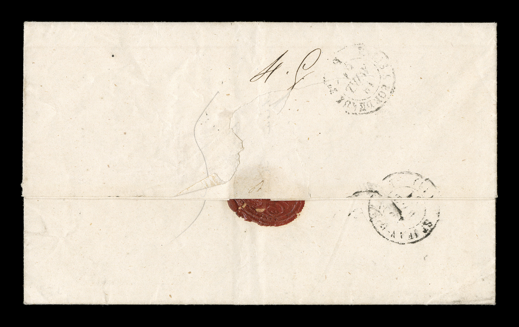 251 c 1846 Moule unpaid stampless entire letter to France, exceptionally well struck black MouleGuadeloupe9 Janvier 1846 double-circle c.d.s. and similar Basse Terre transit c.d.s. on