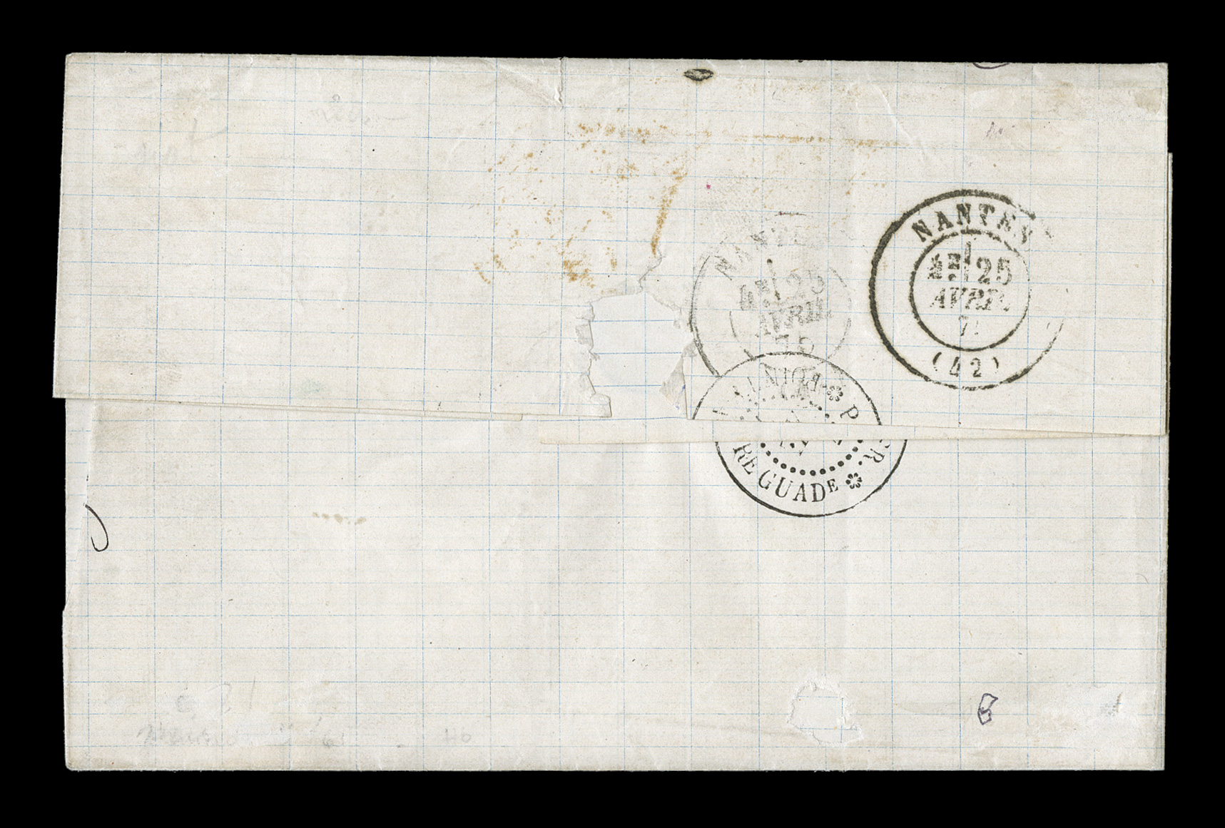 French packet rate to France, all tied to 1875 folded cover by black loFrench Colonies Yvert #17, 22, 1872 5c Green on blue and 15c Bister, three singles of the latter, mostly with large margins, a couple just touched on one side, paying the 50c French packet rate to France, all tied to 1875 folded cover by black lozenge cancels, "Guadeloupe/Moule/7 Avril 75" double-circle c.d.s. below, Pointe-a-Pitre French packet sorting transit c.d.s. on the reverse, black boxed "PD" handstamp and red St. Nazaire entry transit on the front, backstamped Nantes, very fine; an attractive Ceres franking on this cover from Moule to France. (imagea) (Image) Est. $500-750