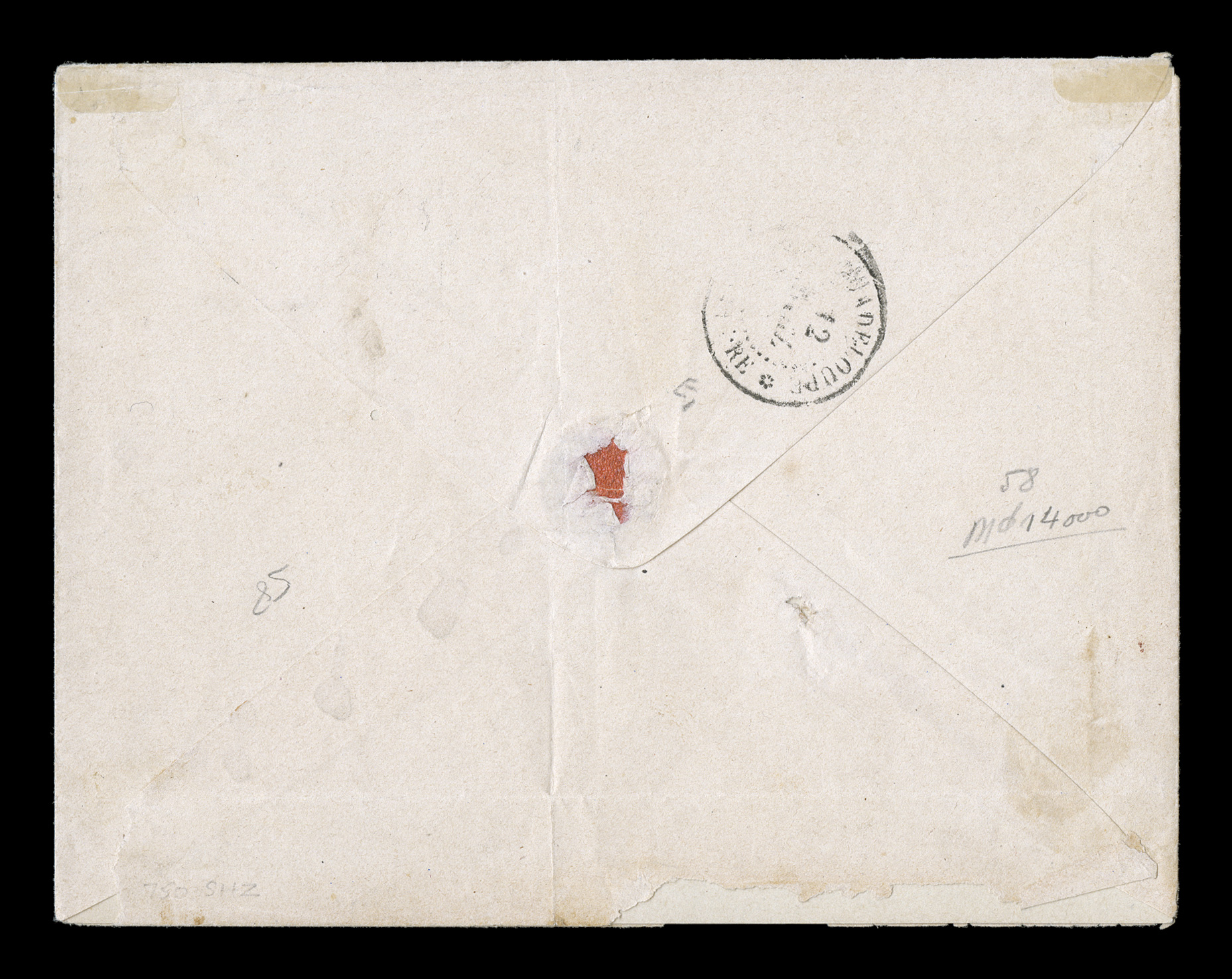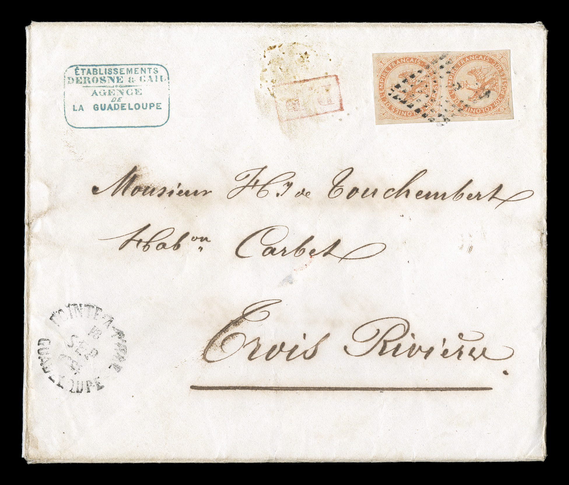quadruple 80c domestic rate on the first leg of this cover from PointeFrench Colonies Yvert #5, 1859 40c Vermilion vertical pair, exceptionally choice with large to extra-large margins, tied to an amazingly rare turned linen cover paying the quadruple 80c domestic rate on the first leg of this cover from Pointe-a-Pitre to Trois Rivieres, pair tied by black 8x8 point lozenge cancel, with matching "Pointe-a-Pitre/Guadeloupe/18 Sep 1864" rimless c.d.s. plus large red "P.P" boxed handstamp, immediately upon arrival the envelope was opened out and turned and re-posted back to Pointe-a-Pitre from the small village of Trois Rivieres, franked with a handsome 10c Bister horizontal strip of four (French Colonies Yvert #3), tied to the linen side of the cover by neat 7x7 point black lozenge cancels with full and exceptionally rare strike of "Trois-Rivieres/Guadeloupe/21 Sep 1864" rimless c.d.s., this franking paying the 40c double domestic rate, both sides are extraordinarily high quality and attractive; extremely fine; an amazing cover that is actually the listing example for the rare rimless Trois Rivieres postmark in the Dubus book, but more significant is that this is the only recorded turned cover of any of the French Colonies, and that each posting is a spectacular and rare Eagle usage just adds to the stunning affect of this cover; ex-Dubus. (imagea) (Image) Est. $7,500-10,000