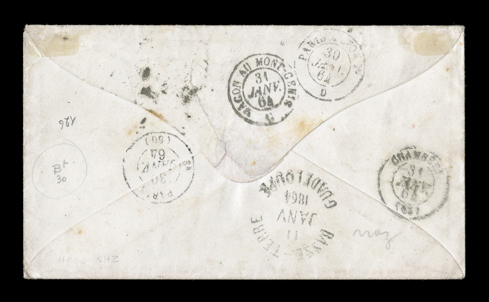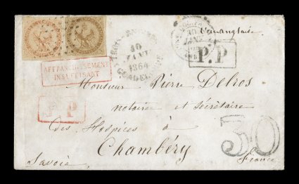 packet cover to France from the small village of Trois Rivieres,French Colonies Yvert #3, 5, 1859 10c Yellow bister and 40c Vermilion, single of each, mostly large margins, 10c just in at top, tied to unusual and rare 1864 underpaid British packet cover to France from the small village of Trois Rivieres, stamps tied by both black lozenge cancel and a red boxed "Affranchissement/Insuffisant" handstamp, "Trois-Rivieres/Guadeloupe/10 Janv. 1864" rimless c.d.s., similar Basse Terre transit on the reverse, includes both red and black boxed "P.P" handstamps, bold "30" due marking at bottom right, black British packet entry transit on the front and several French transits on the reverse, backstamped Chambery, slight soiling to cover but in all other respects very fine and attractive; this letter was scheduled by the sender to go by British packet as indicated by his manuscript instructions but it was only franked at the reduced 50c French packet rate, thus it was handled as an unpaid cover at the 80c rate and credited with the 50c paid in stamps leaving 30c due; a most unusual cover and extraordinarily rare from the small town of Trois Rivieres; ex-Levett. (imagea) (Image) Est. $2,000-3,000