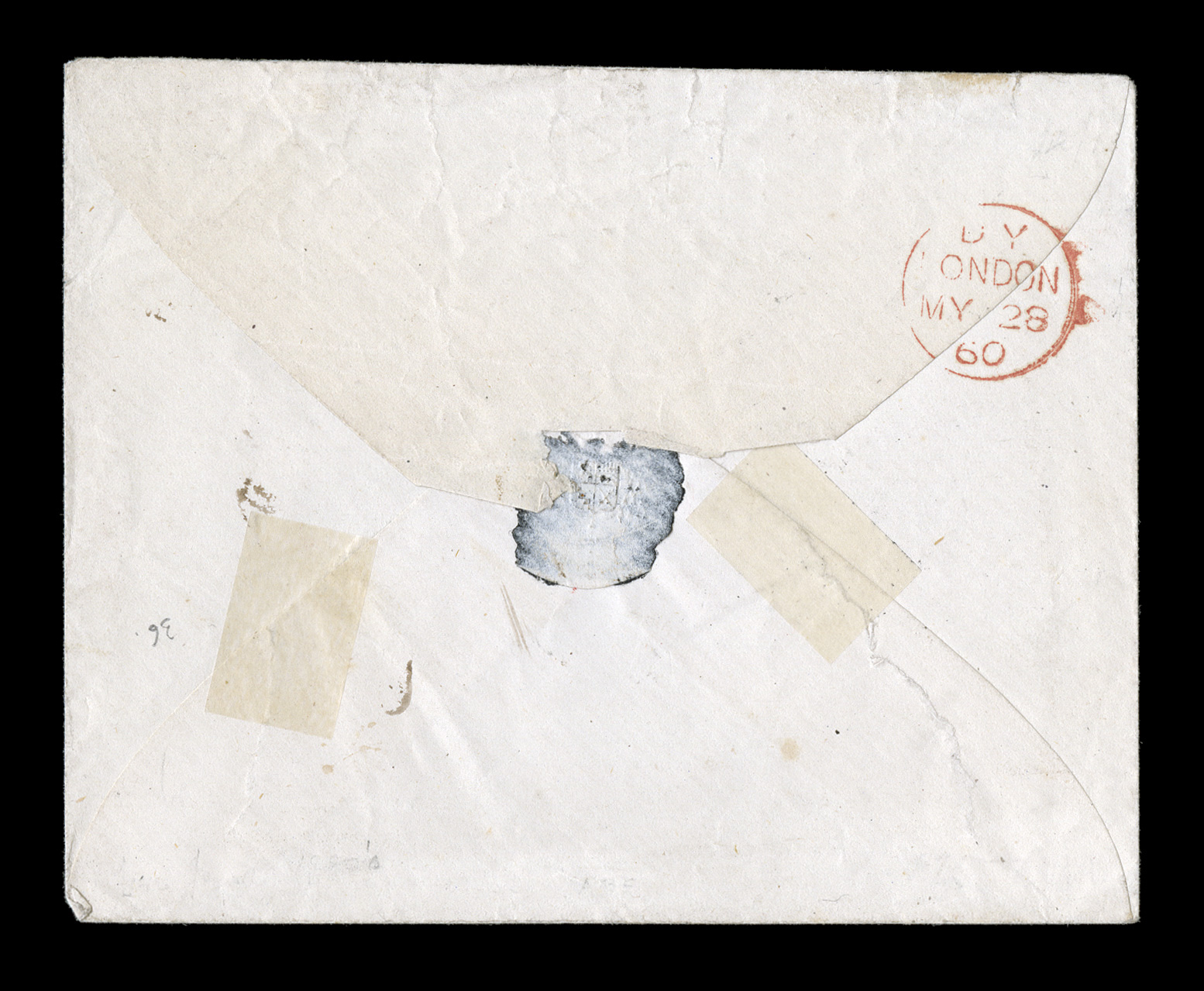 cancels and the Basse-TerreGuadeloupe11 Mai 1860 rimless c.d.s., thFrench Colonies Yvert #3, 5, 1859 10c Yellow bister and 40c Vermilion, each a nice four-margined single, tied to 1860 British packet cover to London by both the black lozenge cancels and the "Basse-Terre/Guadeloupe/11 Mai 1860" rimless c.d.s., the 10c value is also tied by red boxed "Affranchissement/Insuffisant" handstamp, bold "6" handstamp for 6 decimes due and the originally applied red boxed "PD" handstamp crossed out, backstamped London, very fine; this is at the period where both French and British packets rates were 50c paid and 60c unpaid, this cover was evidently overweight, but unlike the previous cover where the letter was figured totally unpaid and credit given for the stamps, this was calculated as one letter rate paid and one letter rate unpaid, perhaps indicating a difference between the way foreign destinations were treated compared to those within the French community; a rare and interesting cover; ex-Levett. (imagea) (Image) Est. $500-750