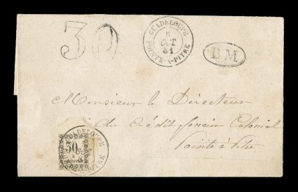 tied to an exceptionally rare 1881 folded cover posted to Pointe-a-PitYvert TT#5, 1879 30c Black typeset postage due, top sheet-margin single with other margins clear to extra-large on the right that may be a portion of the sheet margin as well, tied to an exceptionally rare 1881 folded cover posted to Pointe-a-Pitre on the mobile postal wagon with "BM" in oval handstamp, stamp tied by black "Guadeloupe/Pointe-a-Pitre/5 Oct. 81" double-circle c.d.s. on arrival with similar strike at top and backstamp on the reverse, "30" double-line due handstamp, stamp has a slight trace of gum aging of no significance, very fine and very attractive; since this originated outside of Pointe-a-Pitre it was considered an inter-village posting at the 15c prepaid rate and was charged 30c postage due; exceptionally rare being posted on a travelling post office and bearing this rare typeset postage due. (imagea) (Image) Est. $3,000-4,000