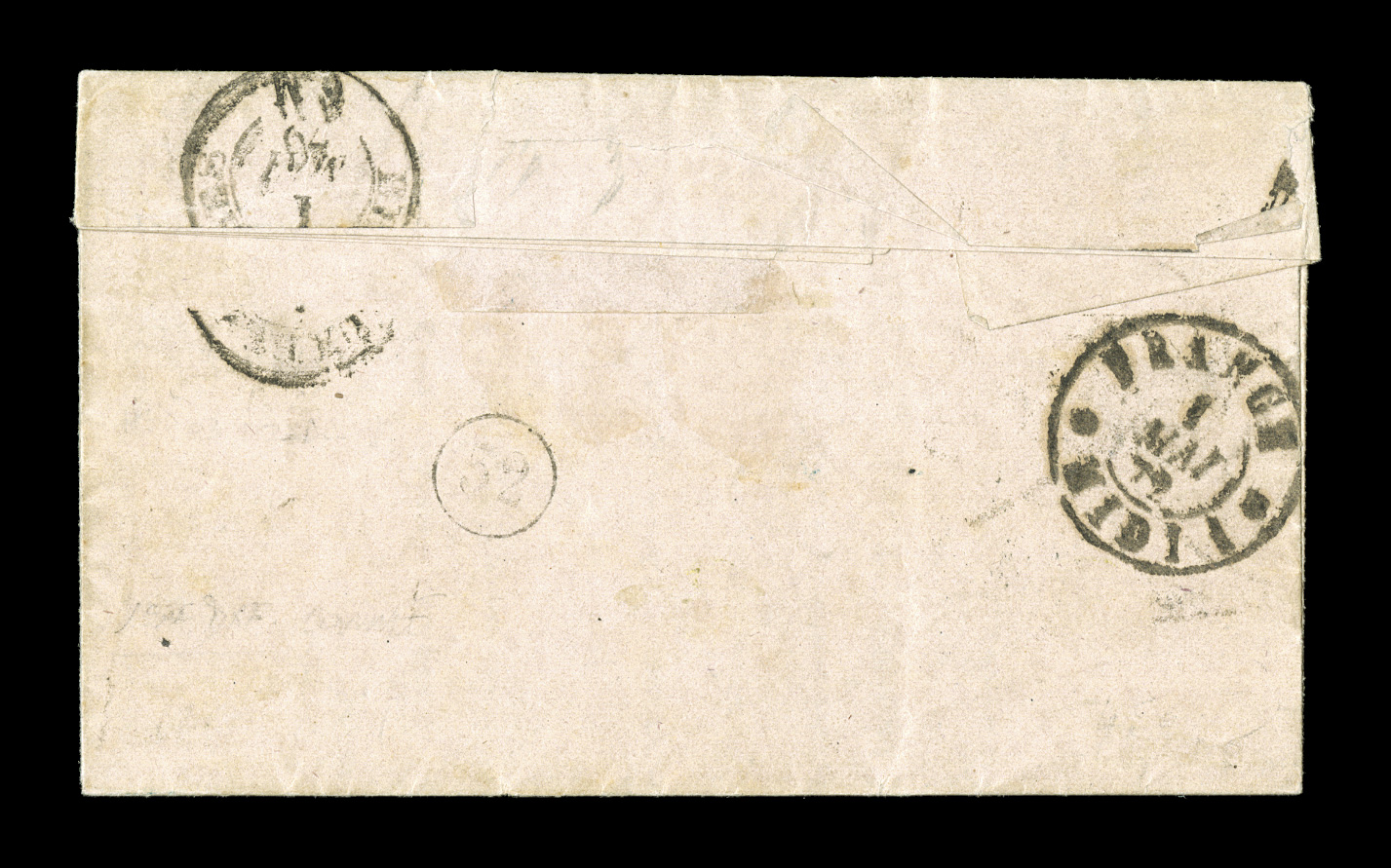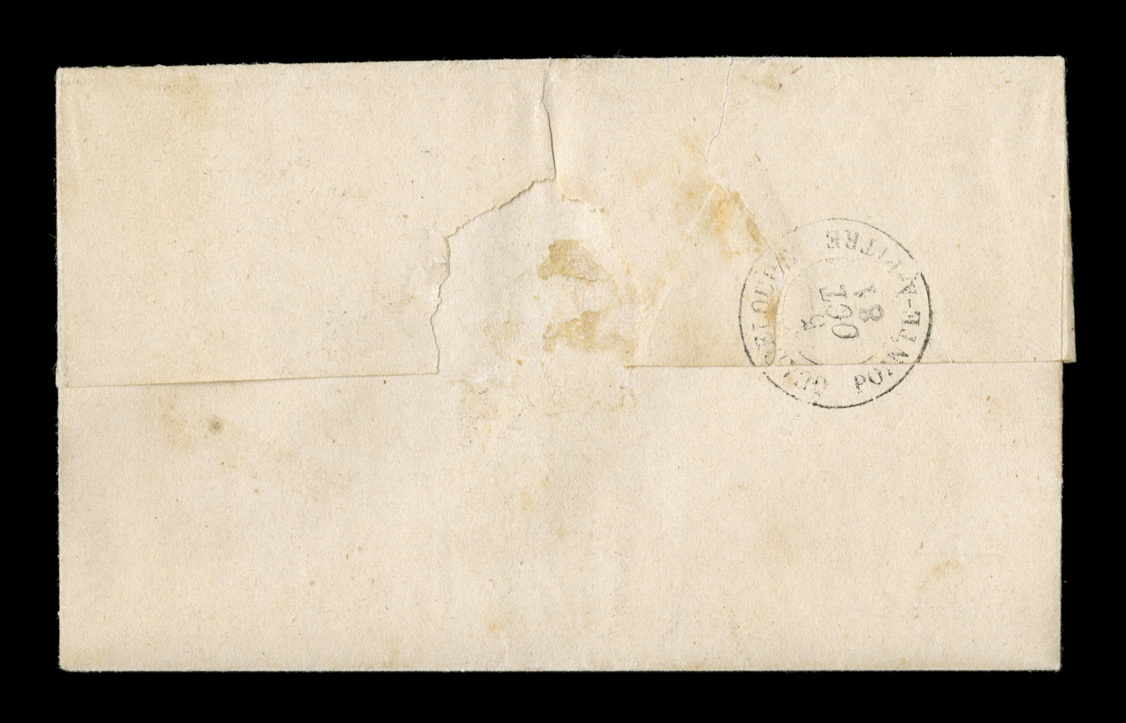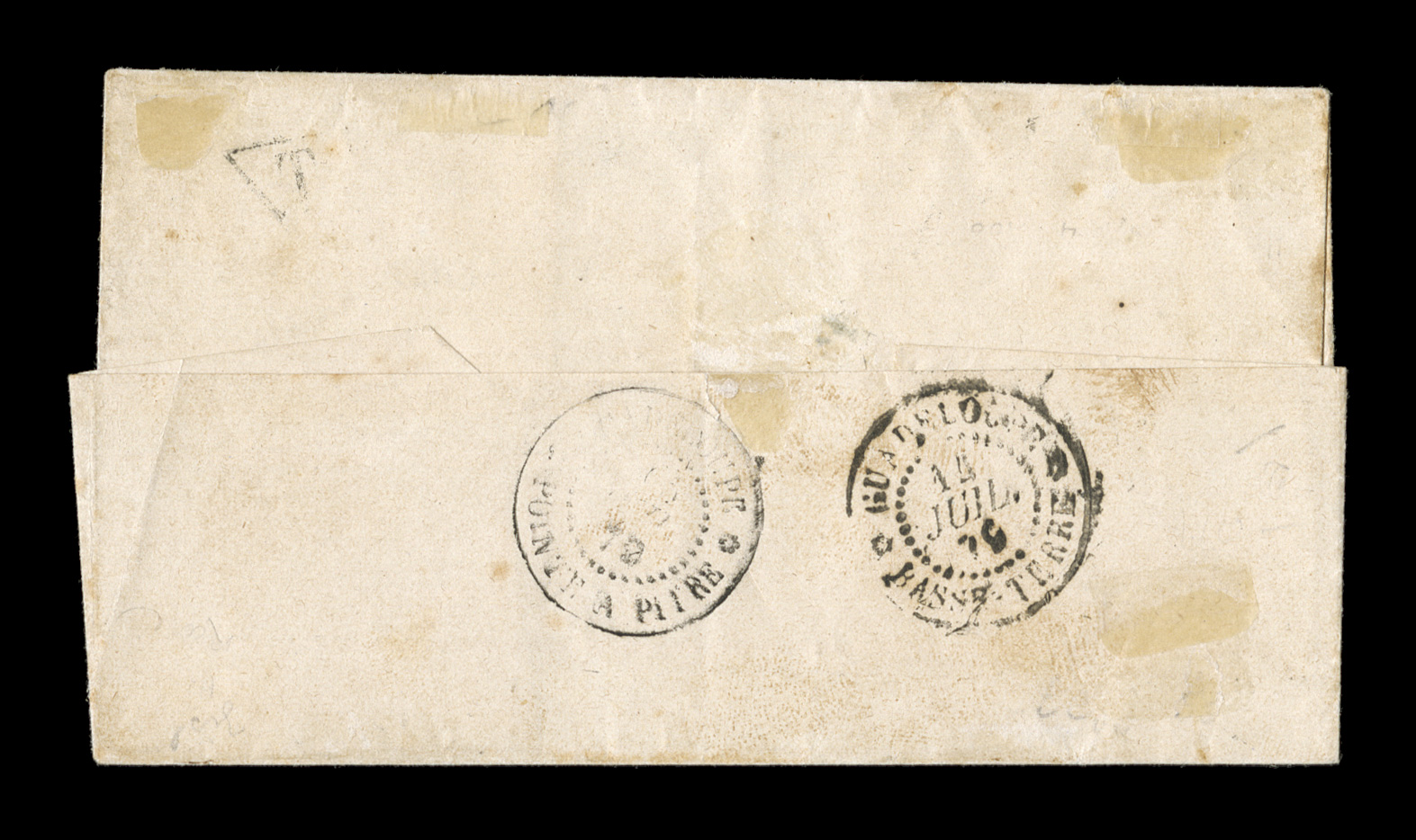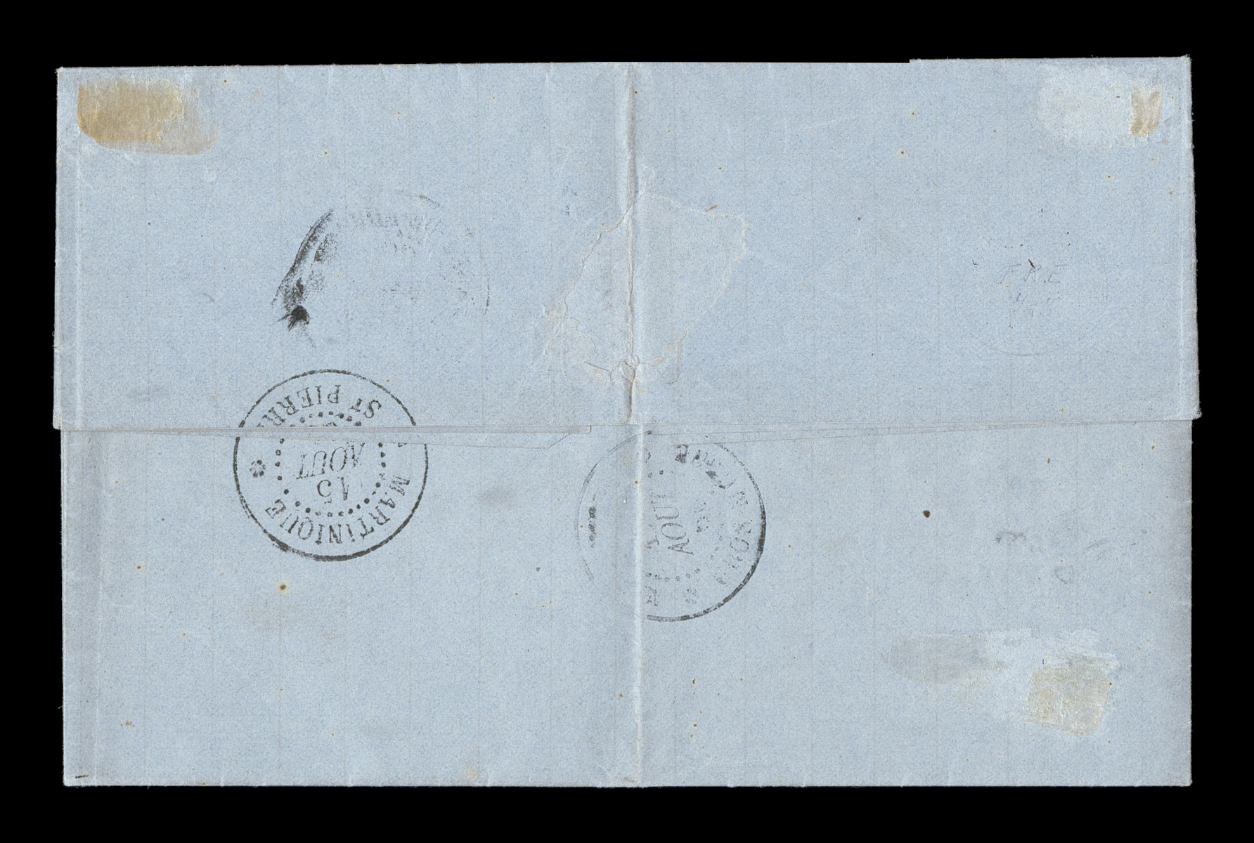 Martinique by GuadeloupePointe-a-Pitre14 Aout. 66 double-circle c.d.s.French Colonies Yvert #3, 4, 1859-65 10c Yellow Bister and 20c Blue, attractive single with mostly large margins, 10c touching at top, tied to 1866 entire folded letter to Martinique by "Guadeloupe/Pointe-a-Pitre/14 Aout. 66" double-circle c.d.s., blue boxed "PD" handstamp, carried by private ship and endorsed "par Goelette 'Rapide'" in manuscript, Gross Morne transit and backstamped Saint Pierre, very fine; though a relatively close French island in the Caribbean, Martinique was hard to get to by normal mail routes, in order to facilitate commerce a special rate of 30c was instituted if carried by private ship; a very rare and unusual rate and possibly the only recorded cover taking advantage of this favorable promotion. (imagea) (Image) Est. $1,000-1,500