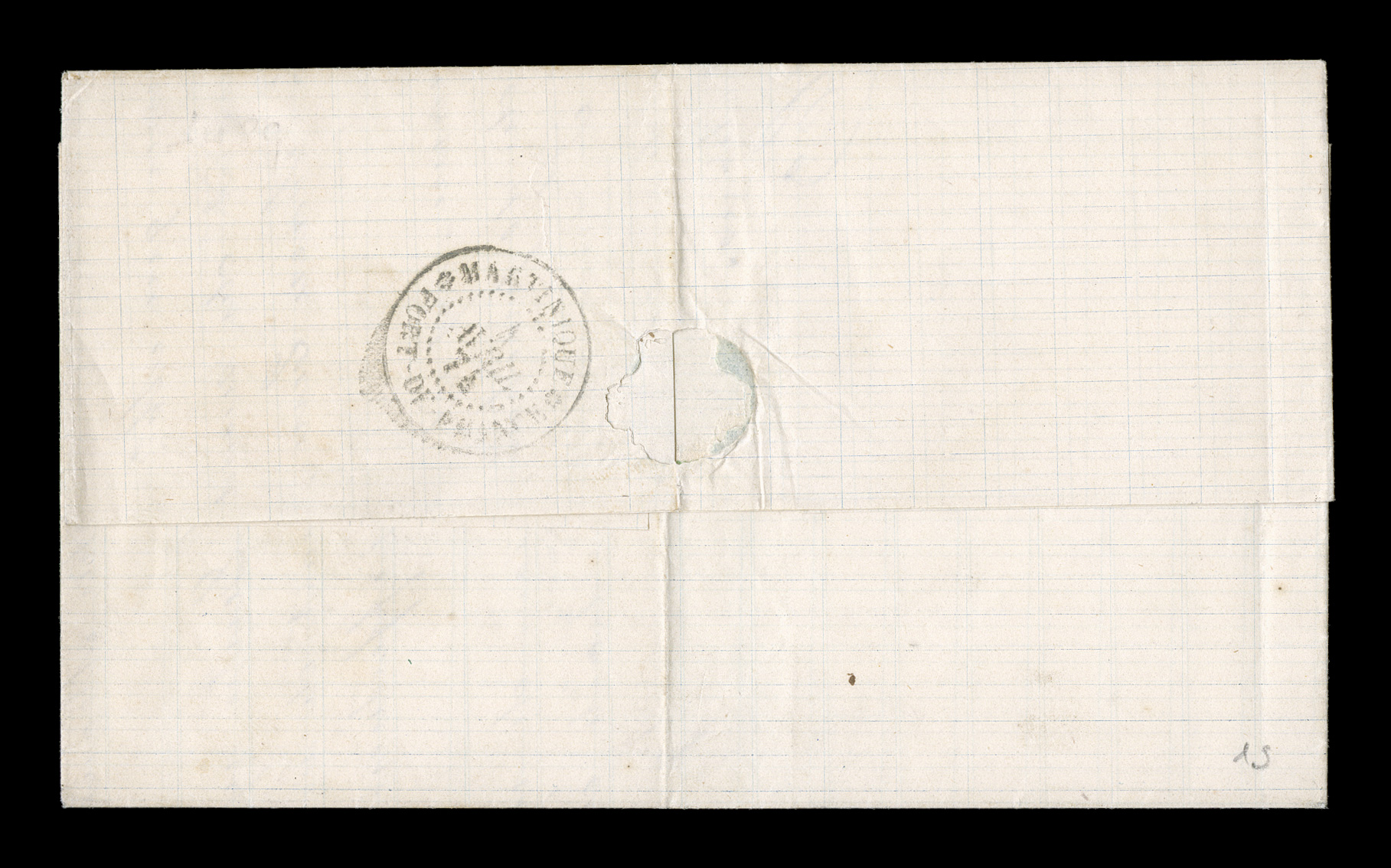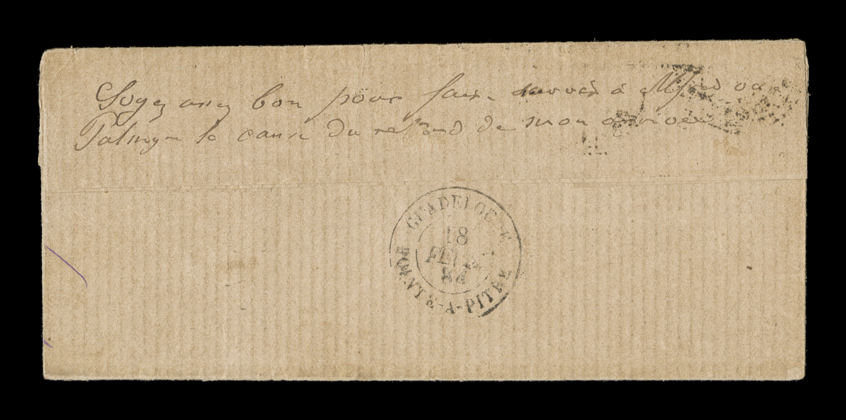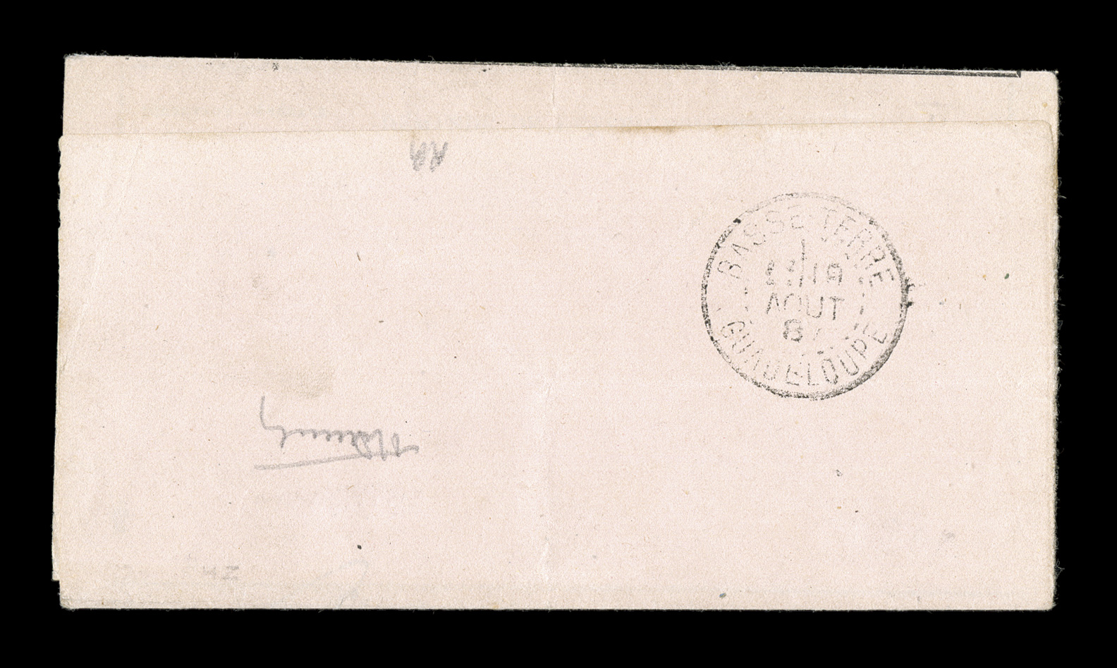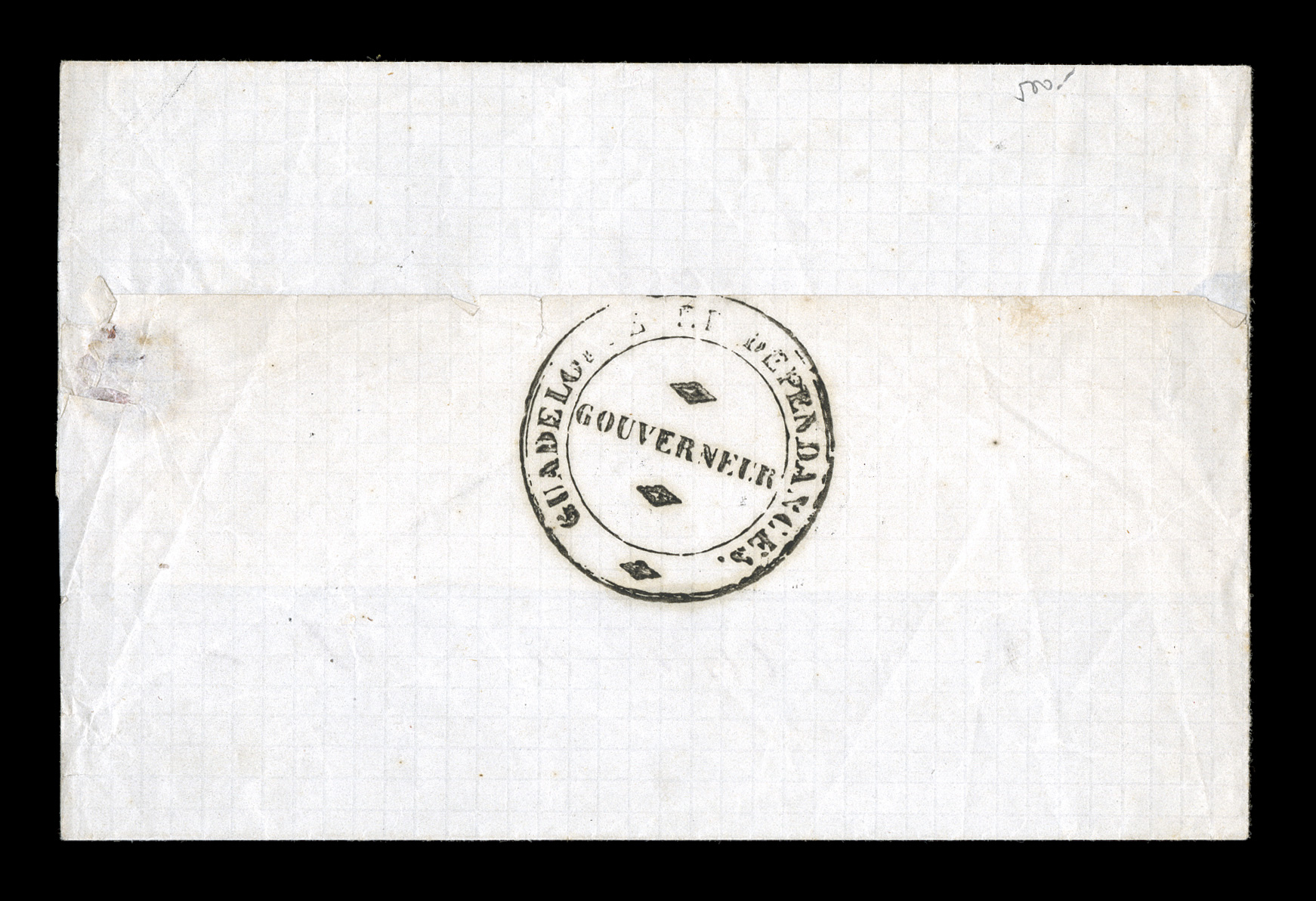office, large official cachet on the reverse Guadeloupe et Dependa1863 Basse Terre government franchise folded cover, attractive "Basse-Terre/Guadeloupe/28 Janv 1863" rimless c.d.s. on front of folded cover to Pointe-a-Pitre from the Governor's office, large official cachet on the reverse "Guadeloupe et Dependances./Gouverneur" validating the free postal service provided this government office, very fine and quite rare. (imagea) (Image) Est. $400-500