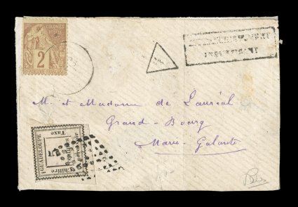 cancel of that town, originally franked with a French Colonies 2c LYvert TT#6, 1884 5c Black postage due, margins to just touching at bottom right, tied to cover front to Grand Bourg on the island of Marie Galante by bold 7x7 point black lozenge cancel of that town, originally franked with a French Colonies 2c Lilac brown on buff (Yvert #47) tied by an indistinct town c.d.s. apparently for a printed matter rate, black "Affranchissement/Insuffisant" and "T" in triangle postage due handstamps applied, vertical fold and edge tear not affecting the stamps of markings, fine and extremely rare; quite likely the only example known of this postage due on cover or large piece, at least as a single usage as very few deficiencies would require only 5c due; signed R. Calves and accompanied by his 1999 certificate where he calls this a great rarity. (Image) Est. $300-400