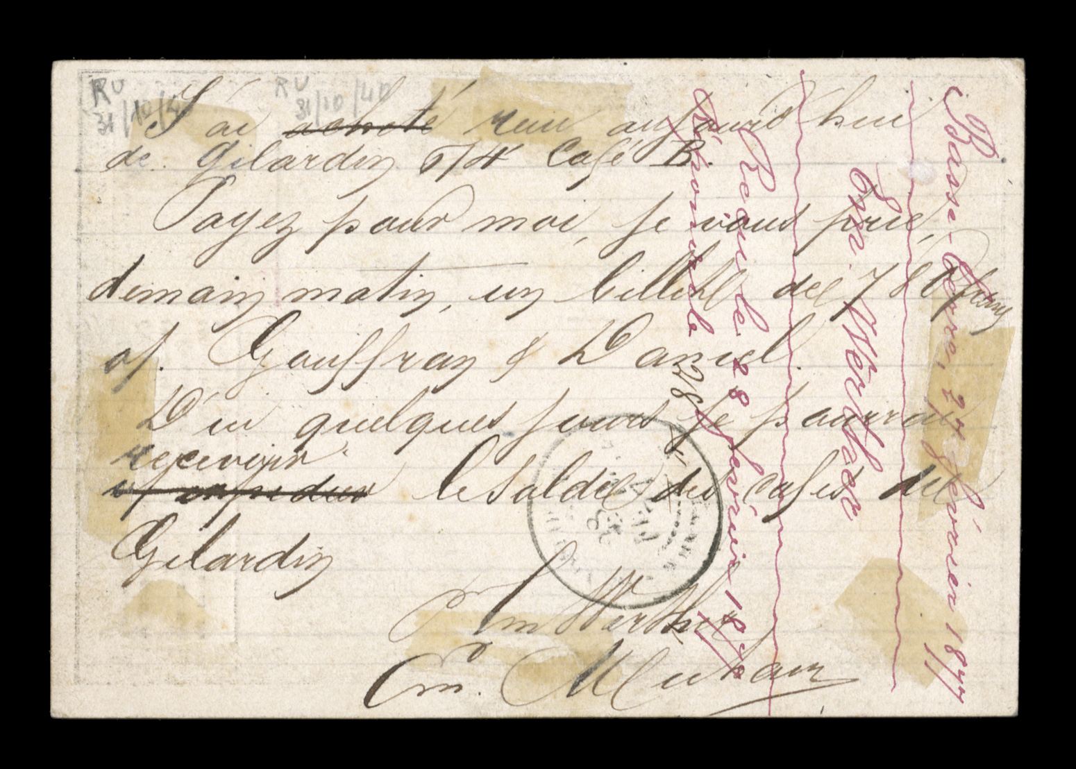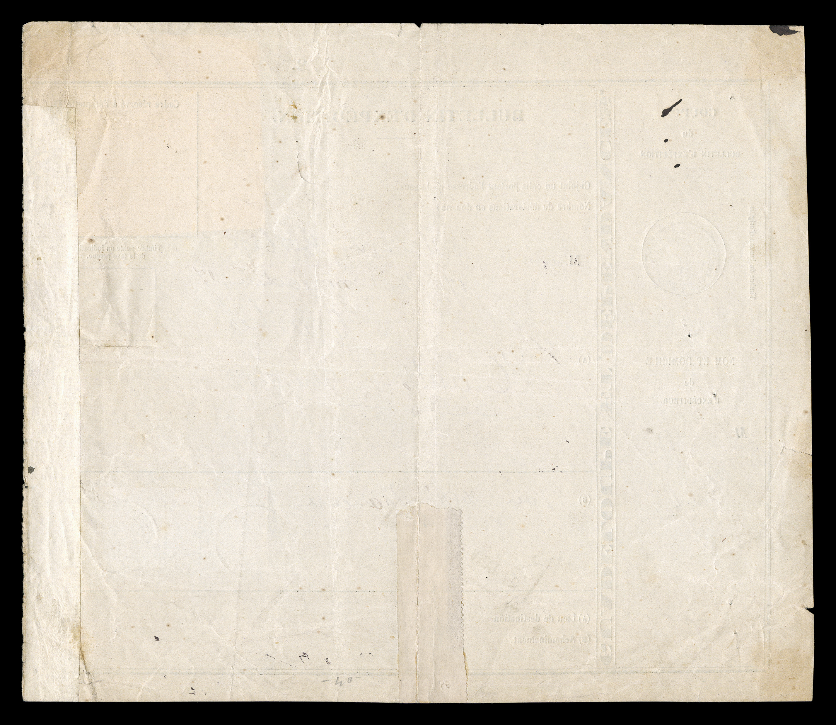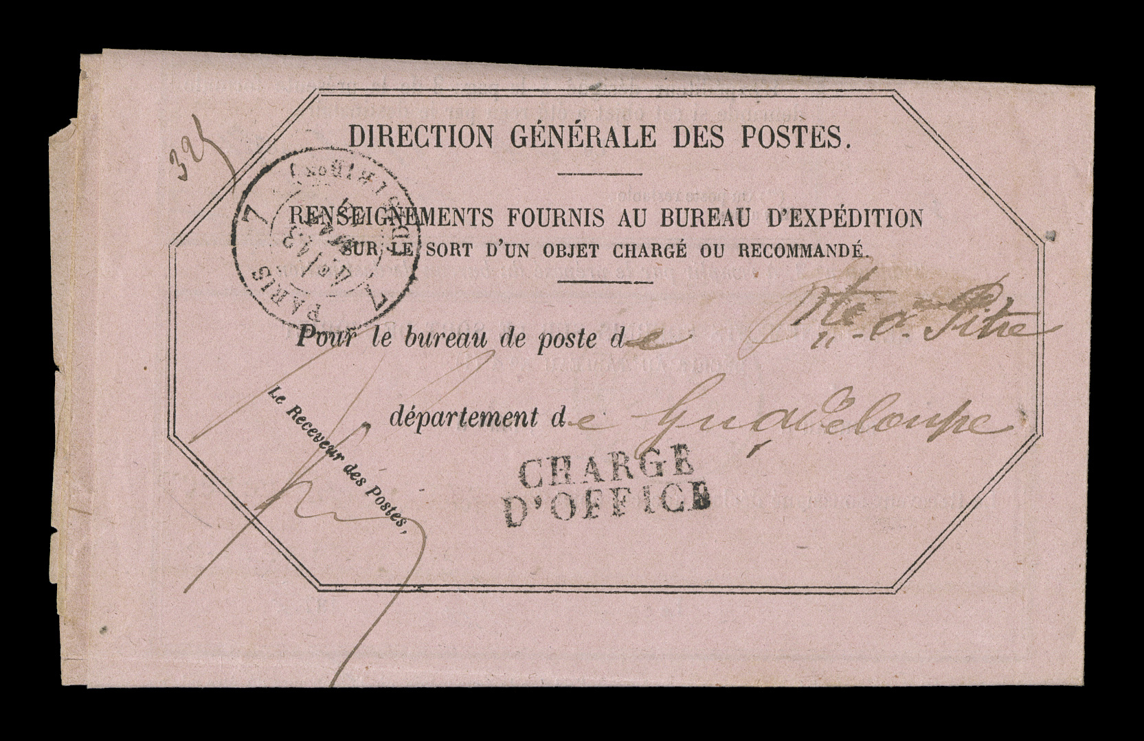 the requested information, stamp is tied by obsolete and rare GPE iFrench Colonies Yvert #50, 1881 10c Black on lilac on registered article disposition form, this constitutes the portion of the form returned by the Basse Terre post office with the requested information, stamp is tied by obsolete and rare "GPE" in lozenge of dots cancel with "Basse Terre/Guadeloupe/18 Aout 87" c.d.s. on the reverse, on the inside is information about a registered sending identifying the ship on which it was carried, various registered numbers assigned in transit and oval July registry postmarks of both New York and Boston, its final destination, very fine and interesting; a rare example of the registry paperwork that could be required but seldom was, and even then, usually not preserved; ex-Levett, (imagea) (Image) Est. $750-1,000