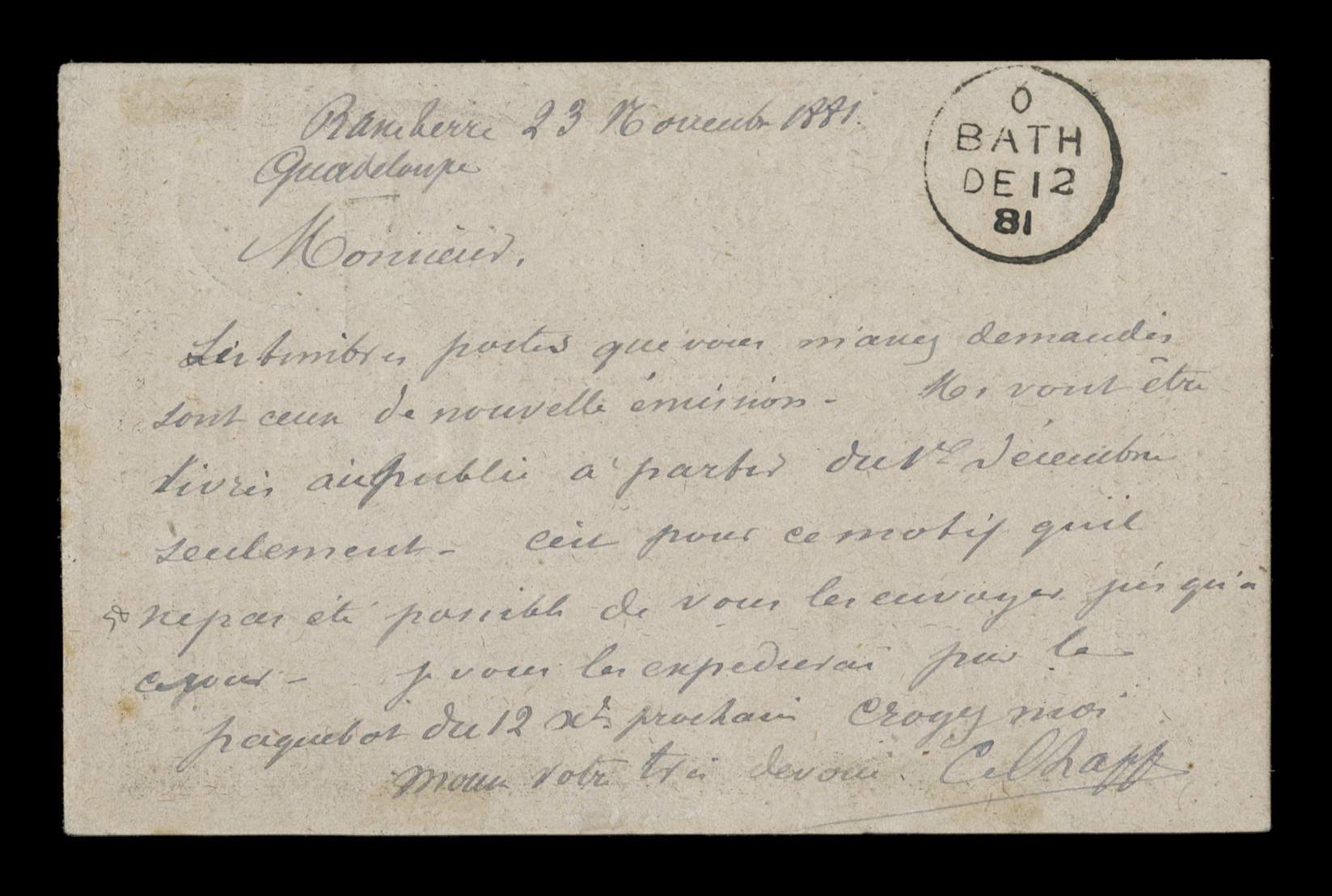 GuadeloupeBasse Terre23 Nov. 81 double-circle c.d.s., backstamped Bath, very fFrench Colonies Yvert #40, 1879 10c Black on lilac on Guadeloupe formula card, extra-large margins to just touching, tied to card to England by beautiful strike of "Guadeloupe/Basse Terre/23 Nov. 81" double-circle c.d.s., backstamped Bath, very fine; this card was issued in 1880 and quotes the rate at 15c for foreign countries which was changed by pen to 10c, it is presumed that a rate change took place just after this card was issued though a new formula card reflecting this change was not issued until 1883, scarce usage; ex-Levett. (imagea) (Image) Est. $400-500