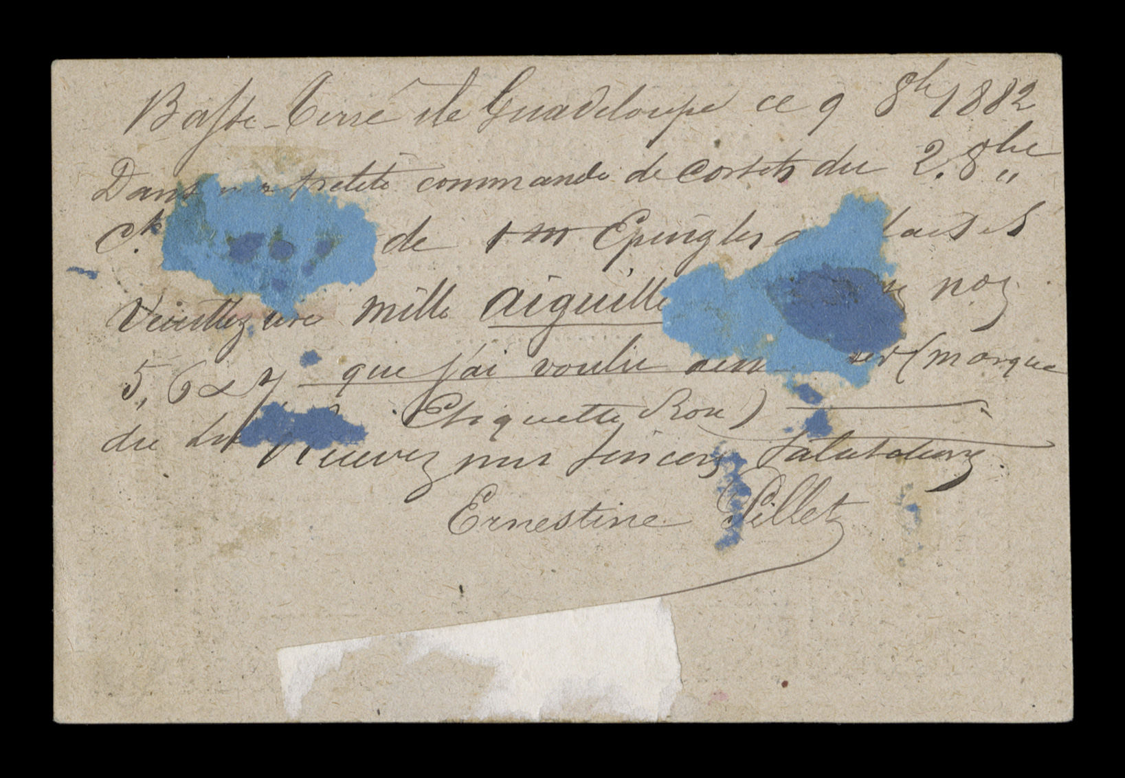 c.d.s., Paris entry and receiving c.d.s., very fine.French Colonies Yvert #40, 1879 10c Black on lilac on Guadeloupe formula card, four balanced margins, tied to card to France by "Guadeloupe/Basse Terre/8 Aout. 82", double-circle c.d.s., Paris entry and receiving c.d.s., very fine. (imagea) (Image) Est. $300-400