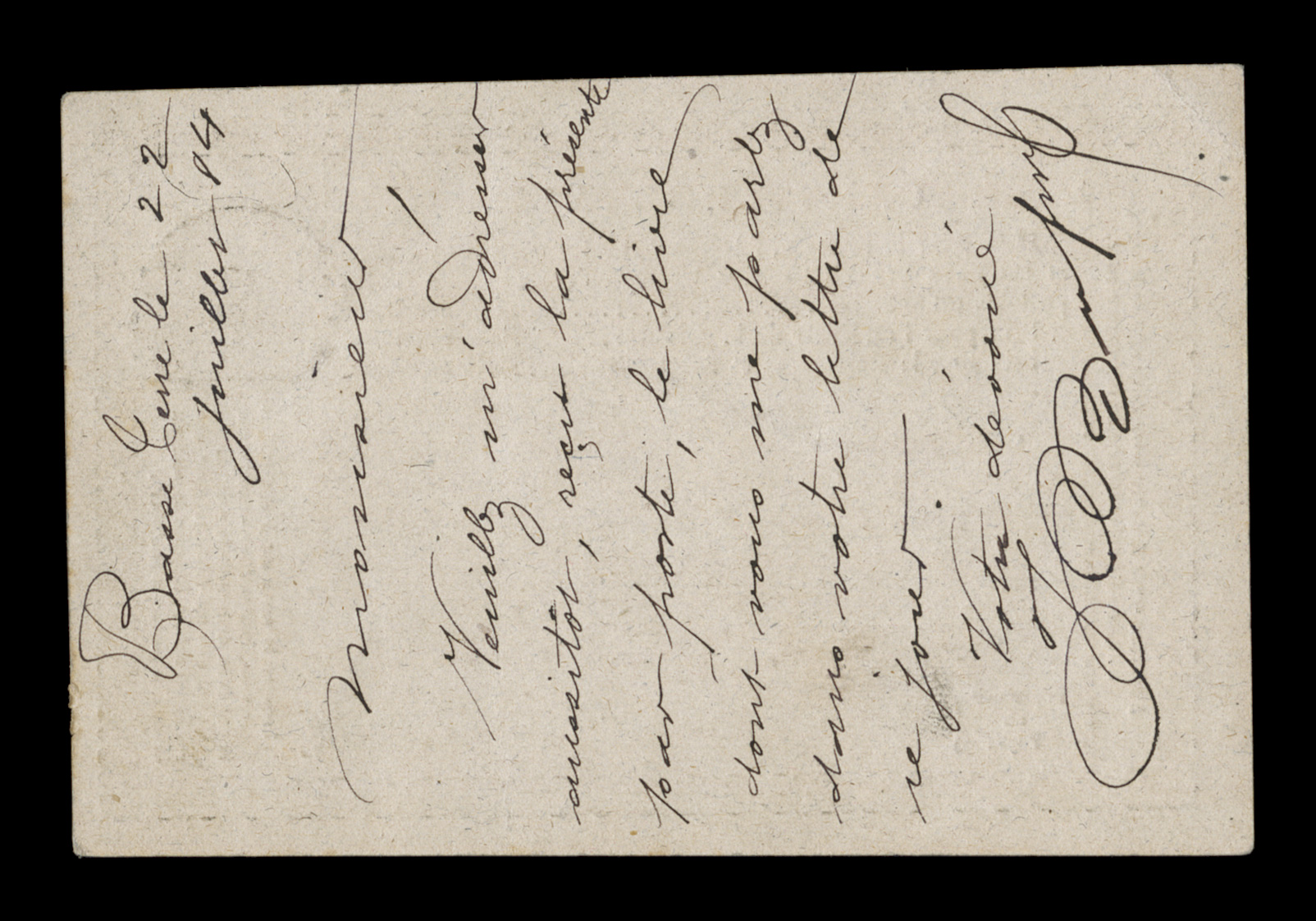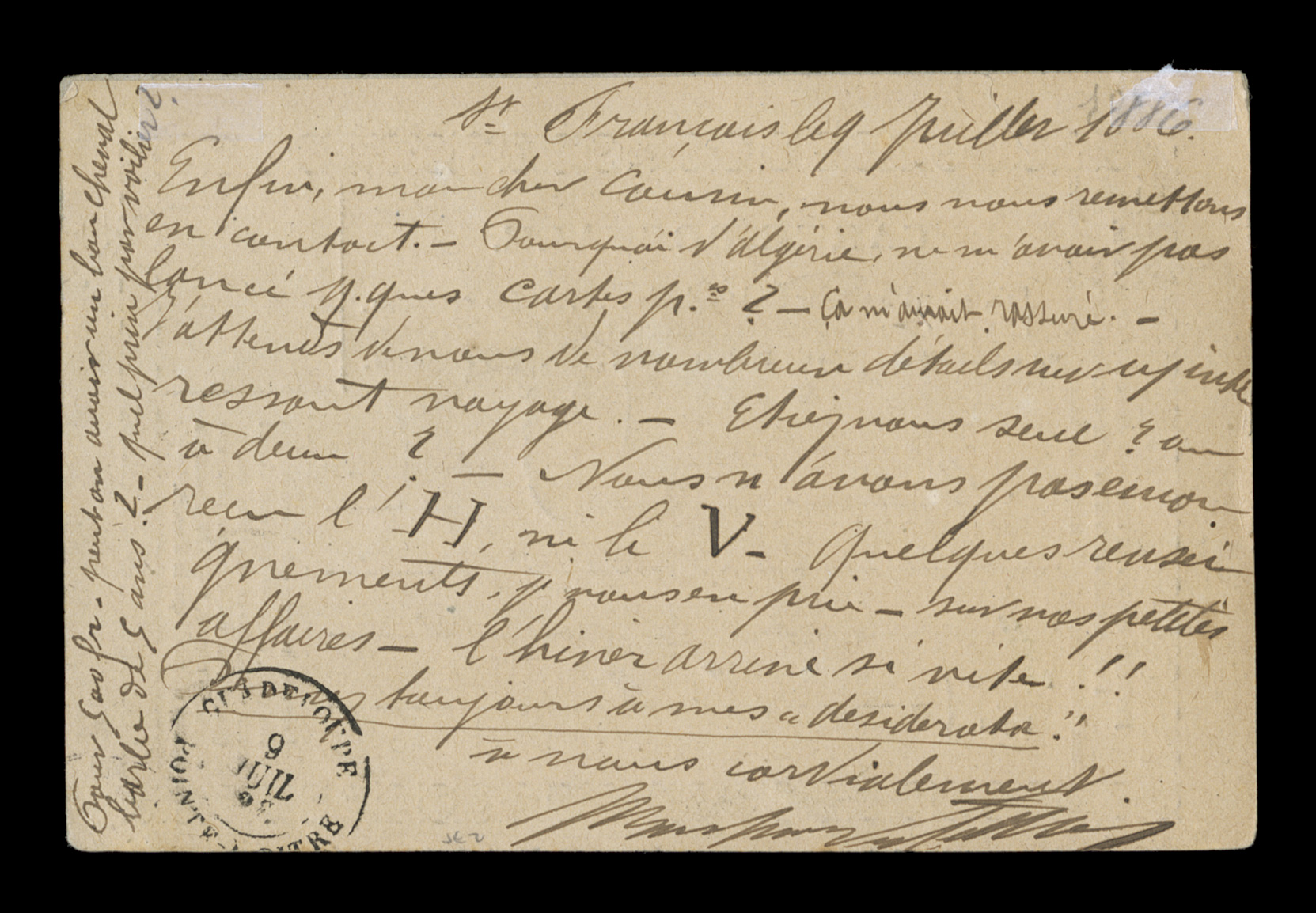 to this early formula card by GuadeloupeBasse Terre22 Juil 84Yvert #1, 1884 "G.P.E./20" provisional surcharge on 20c Brown on Guadeloupe formula card, the scarce first imperforate provisional surcharge with large balanced margins, neatly tied to this early formula card by "Guadeloupe/Basse Terre/22 Juil 84" double-circle c.d.s., posted to Limoges, France, exceptionally fresh and attractive, choice very fine; an especially rare usage as this is a late usage of the the second formula card of Guadeloupe produced in 1876-78 with the then current foreign rate was 20c for a postal card, the sender believed the rate quotation on the card even though in 1884 the postal card rate was only 10c thus overpaying by double and using this rare first issue surcharge to do it; a marvelous usage of the first issue. (imagea) (Image) Est. $750-1,000