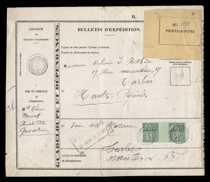 from Pointe-a-Pitre to Nantes, France, stamps tied by GuadeloYvert #17, 1891 5c Green with provisional "Guadeloupe" overprint, a horizontal gutter pair on 1893 "Bulletin d'Expedition" parcel post form, complete and filled out for a parcel going from Pointe-a-Pitre to Nantes, France, stamps tied by "Guadeloupe/Pointe-a-Pitre/10 Janv 93" double-circle c.d.s. with additional strike in the space for the postmark of the town of origin, parcel label to identify the item affixed at top right and St. Nazaire boxed entry handstamp, normal folds and a couple of closed edge tears typical of this usage, otherwise very fine and exceptionally rare as these forms were normally retained by the post office, this is the only recorded example that we are aware from Guadeloupe. (imagea) (Image) Est. $500-750