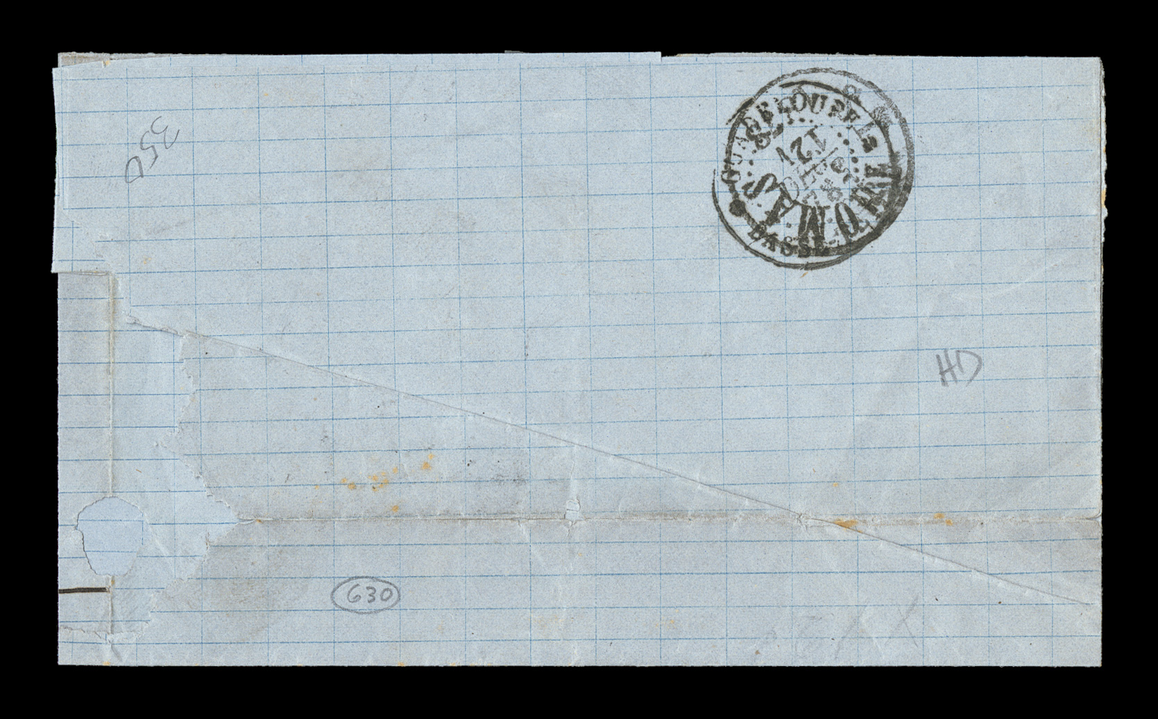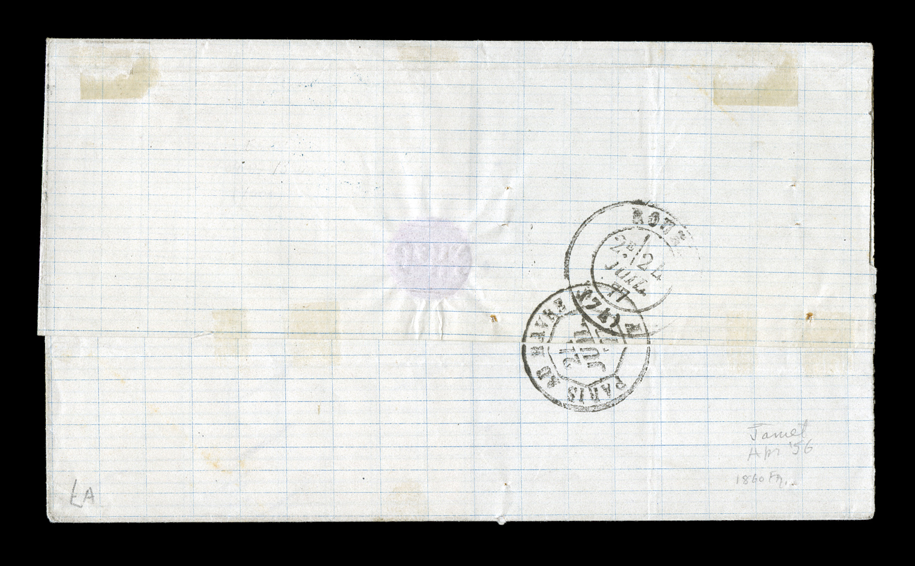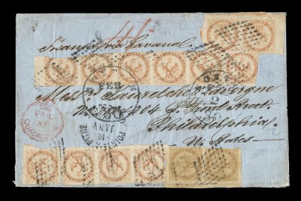 of a 10c vertical pair and 40c horizontal pair and strips of four andFrench Colonies Yvert #3, 5, 1859 10c Yellow bister and 40c Vermilion, a truly amazing Eagle franking on a quadruple-rate 1865 cover to the United States, the franking consists of a 10c vertical pair and 40c horizontal pair and strips of four and six, margins range from fairly sizable sheet margins to one stamp of the strip of six being strongly torn in at top, all tied by black lozenge cancels with a black "Pointe-a-Pitre/Guadeloupe/10 Janv 1865" rimless c.d.s. tying the strip of four, clear and attractive strike of the rare "Paid/at/Guadaloupe" Crowned-circle handstamp of the British Agency, "4/-" British rate marking in red crayon, plus red British "Guadaloupe/JA 11 1865" double-arc c.d.s. and similar black St. Thomas transit on the reverse, posted to Philadelphia with two "Boston/30/Feb 2" accounting c.d.s. also tying the strip of six, edge wear and wrinkles to the cover affecting some of the stamps, still a fine appearing and impressive paid cover through the British Agency; a cover of the greatest rarity being the only recorded quadruple-rate cover to the United States. (imagea) (Image) Est. $3,000-4,000