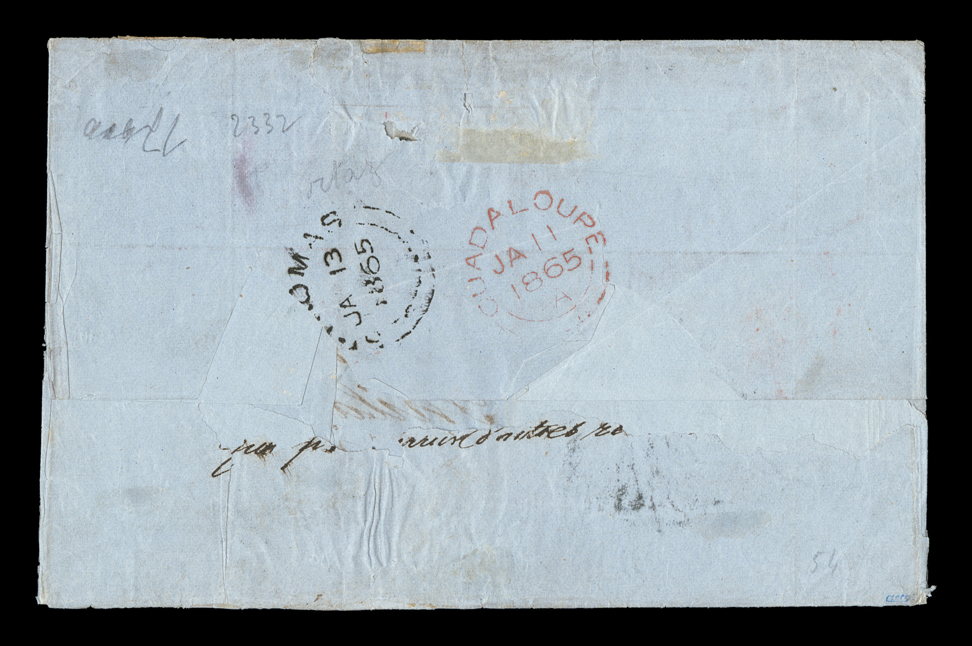 Pointe-a-Pitre c.d.s., posted through the British Agency with rare later GuadFrench Colonies Yvert #4, 5, 1859-65 20c Blue and 40c Vermilion, four-margin singles tied to 1868 folded cover to the United States by black lozenge cancel, indistinct Pointe-a-Pitre c.d.s., posted through the British Agency with rare later "Guadaloupe/Paid/NO 10 68" c.d.s., "4" pence British rate marked in red crayon, small red "Guadaloupe/No 10 68" c.d.s. and black St. Thomas British c.d.s. transit on reverse, posted to Norfolk, Virginia with black "U.S. Steamship/10/Nov. 25" entry c.d.s., edge wear with flaws to the backflap and light soiling, a fine and rare British Agency cover to the United States; ex-Levett. (imagea) (Image) Est. $750-1,000